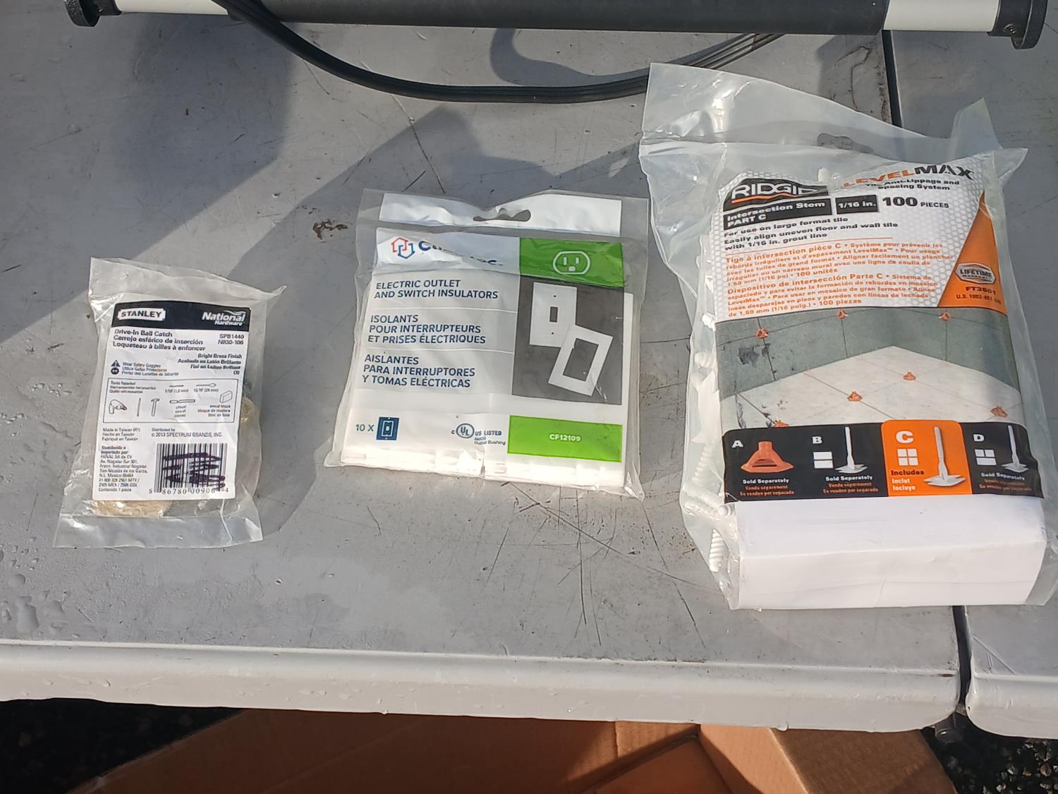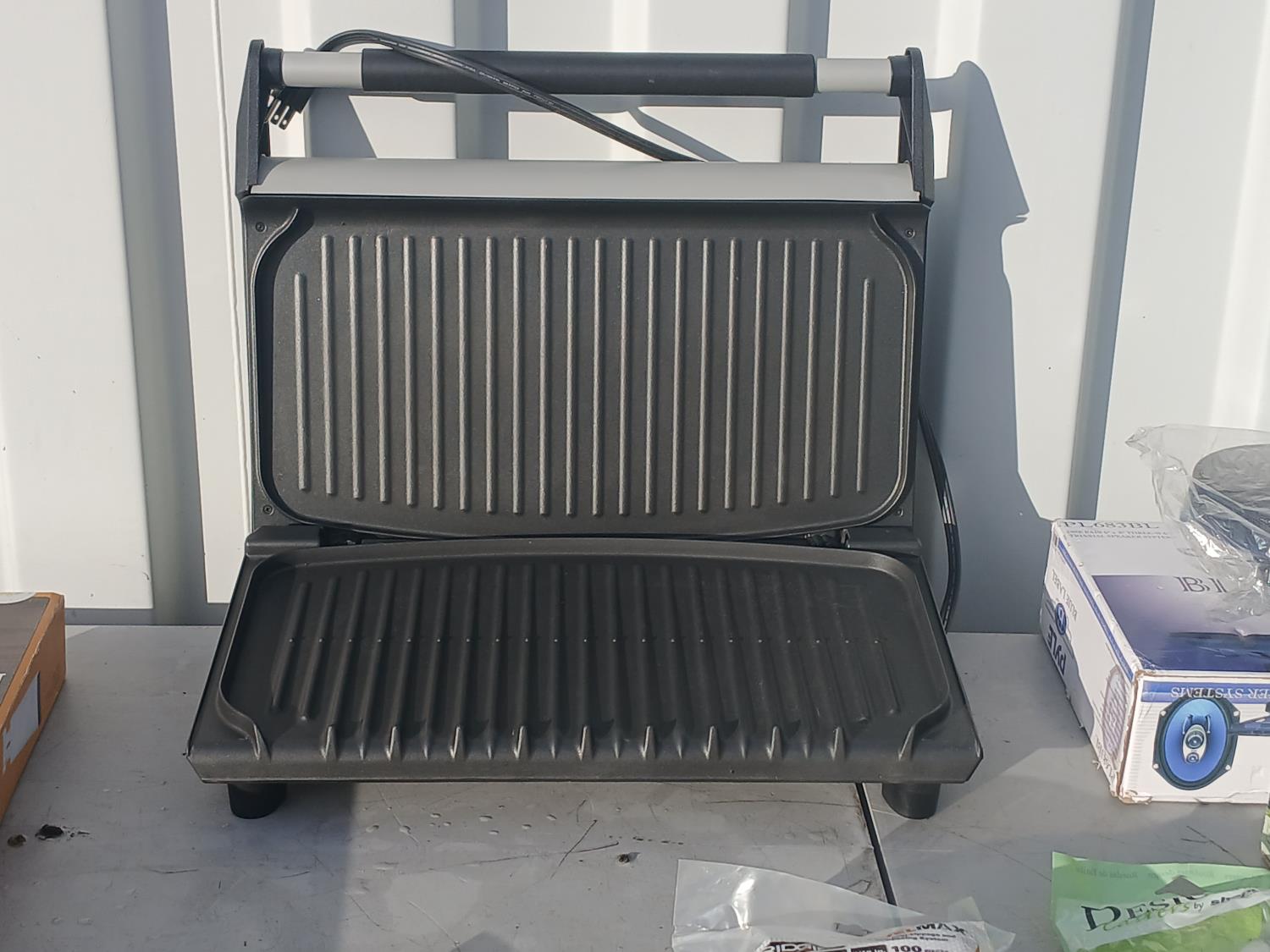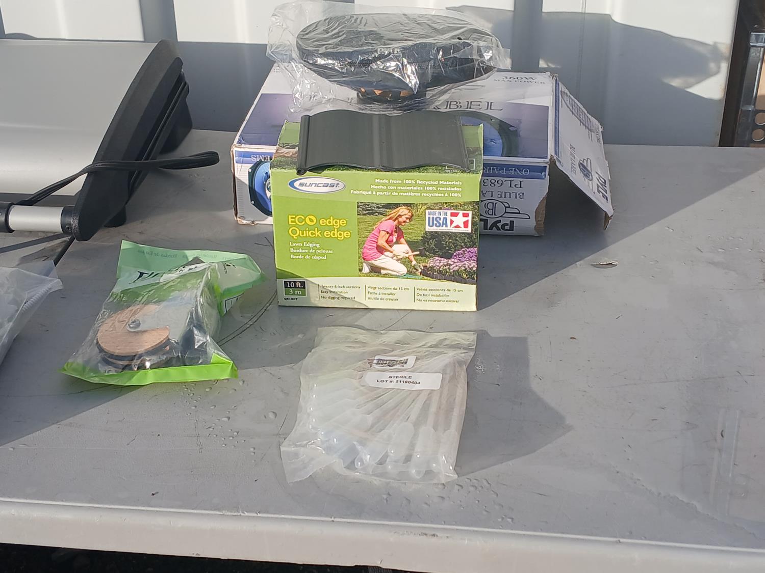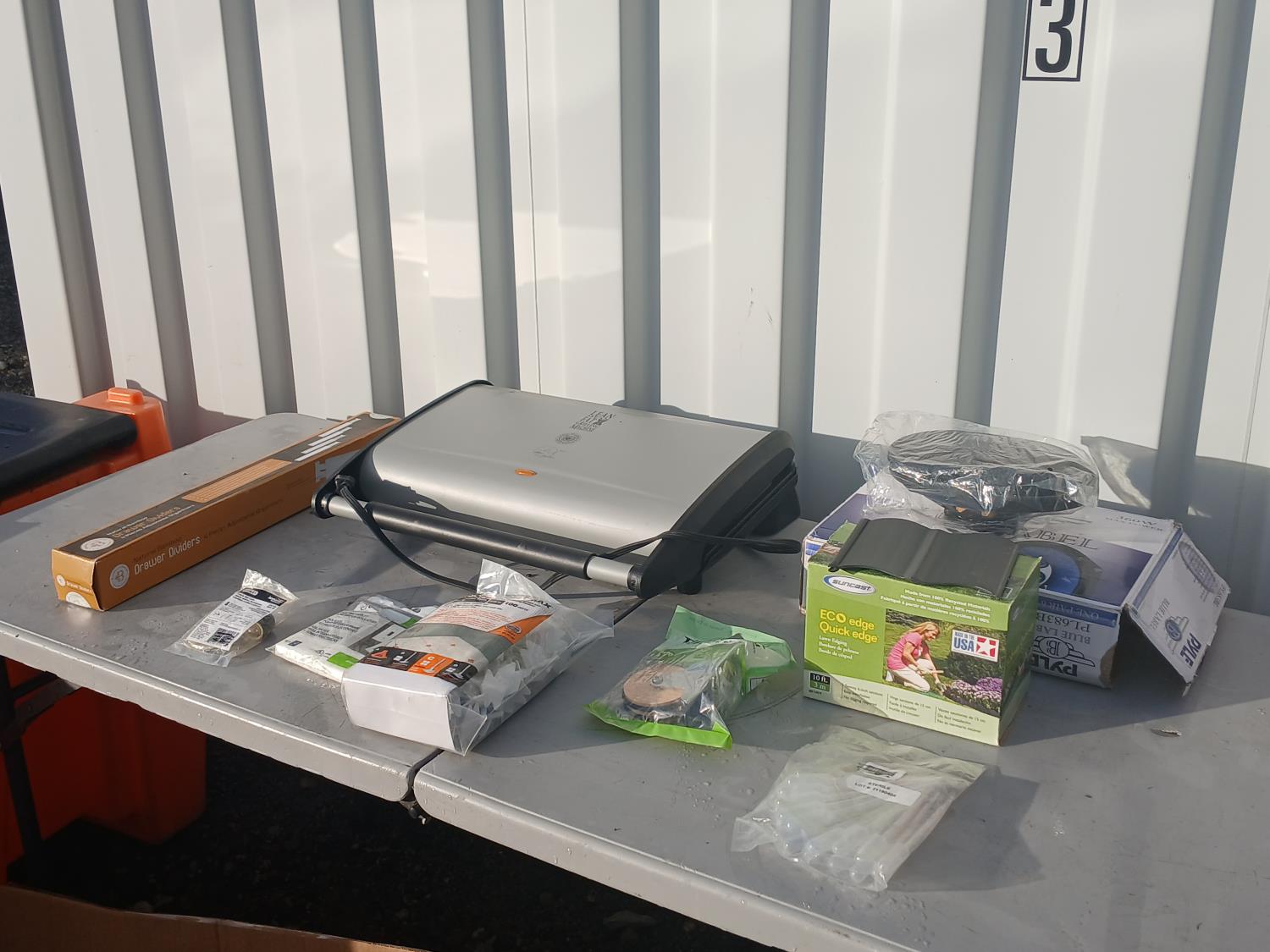 (1) Lean Mean Grilling Machine, (1) box drawer dividers, (1) drive in ball catch, (1) 100 piece anti-lippage level Max Tie spacers, (1) bag of outlet/switch insulators, (1) bag Sterile droppers, (1) heavy duty caster wheel, (1) box Eco Lawn/and garden edging, (1) set "Pyle" 6inchX8inch 3way triaxle speaker system (360 watt).