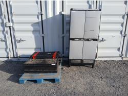 (1) 2 door black and stainless finished cabinet with shelving. (2) sets of black shelving