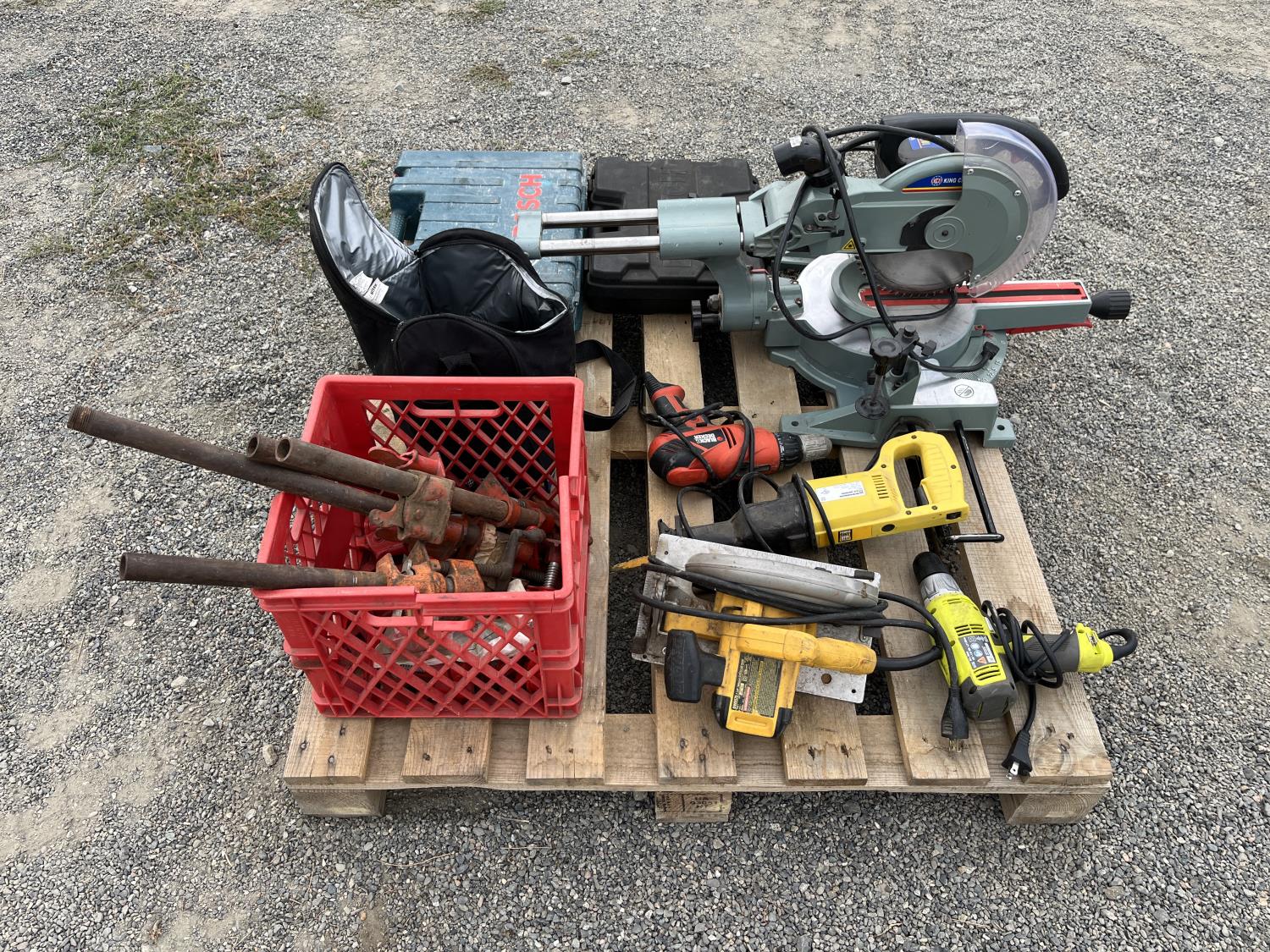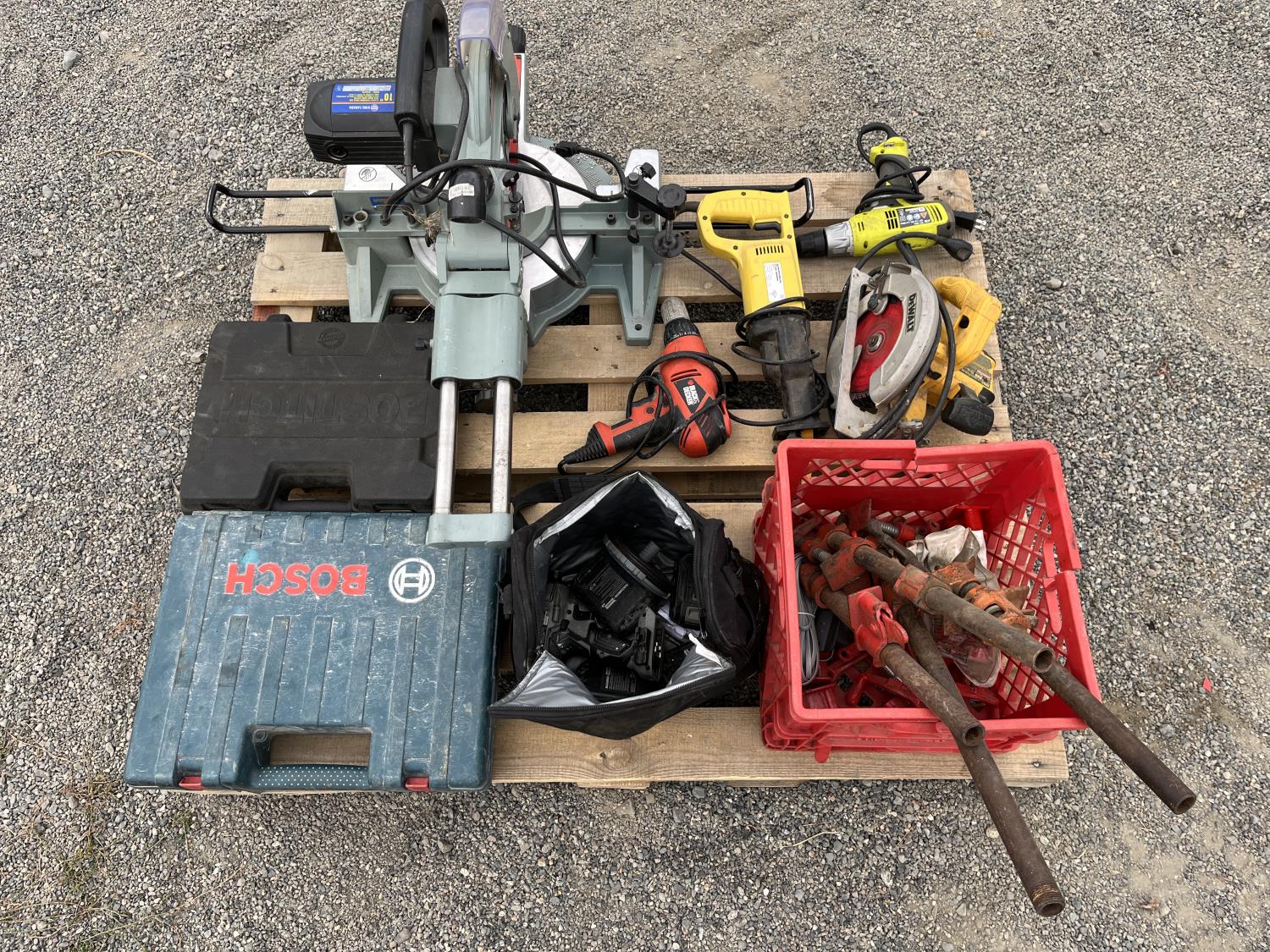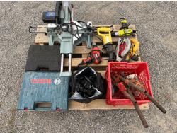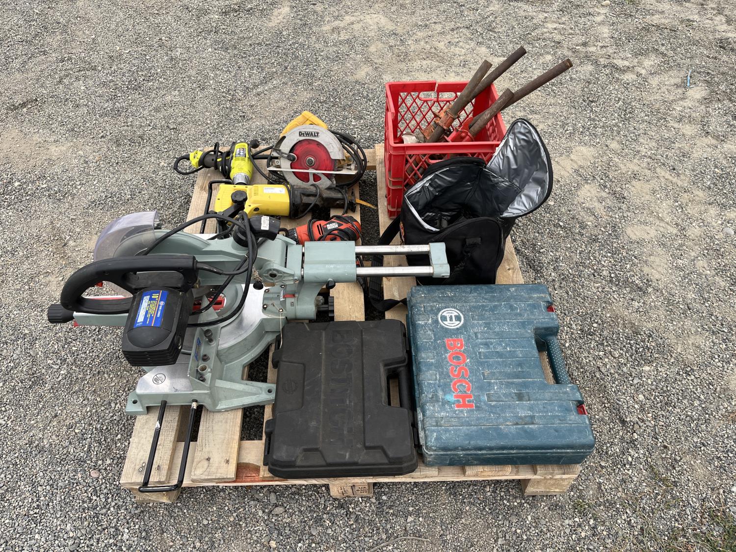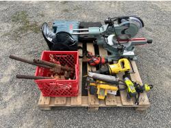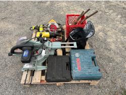 Dewalt circular saw, Riobi plus in drill, Black & Decker plus in drill, Power Fist reciprocating saw, (5) wood clamps, Bostitch nail gun, Bosch rotary hammer