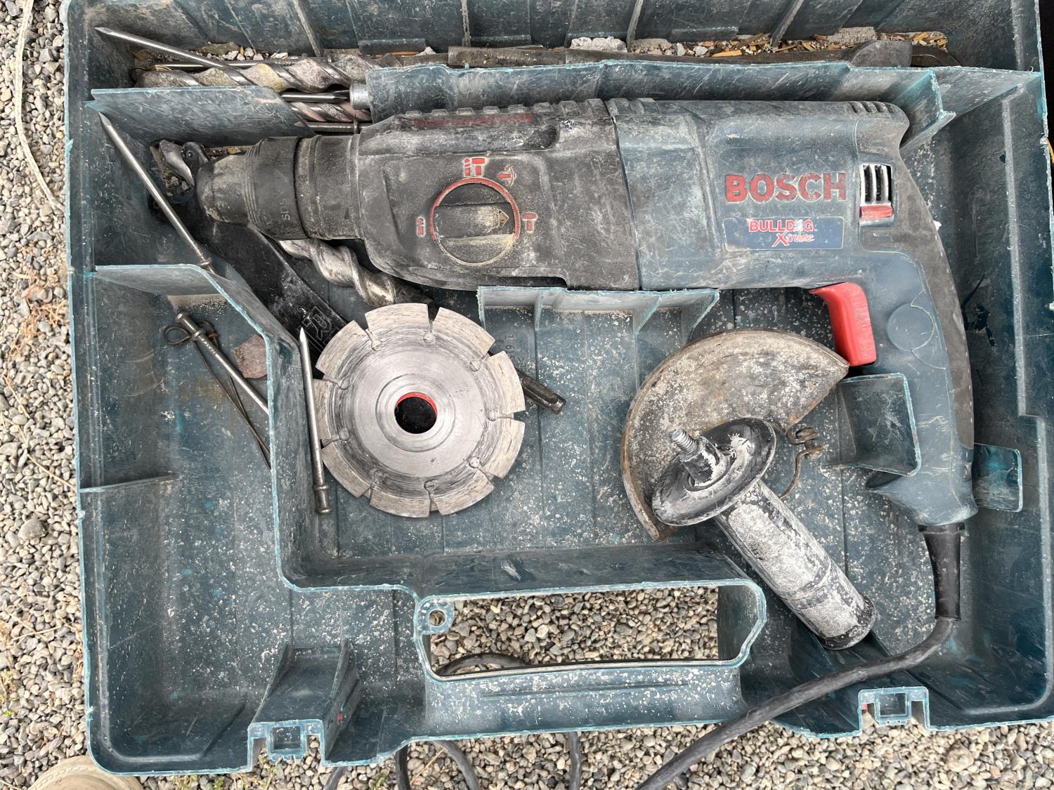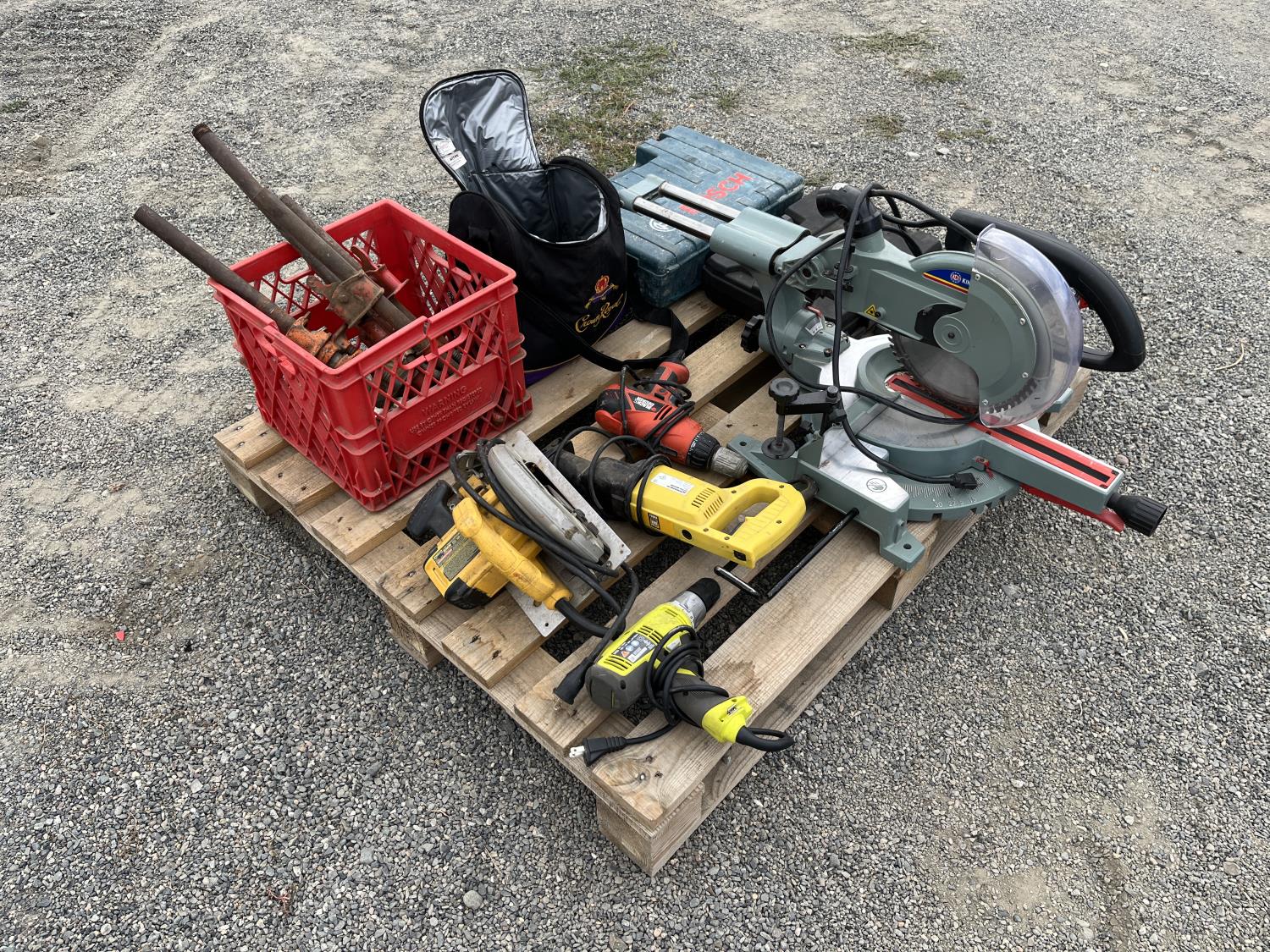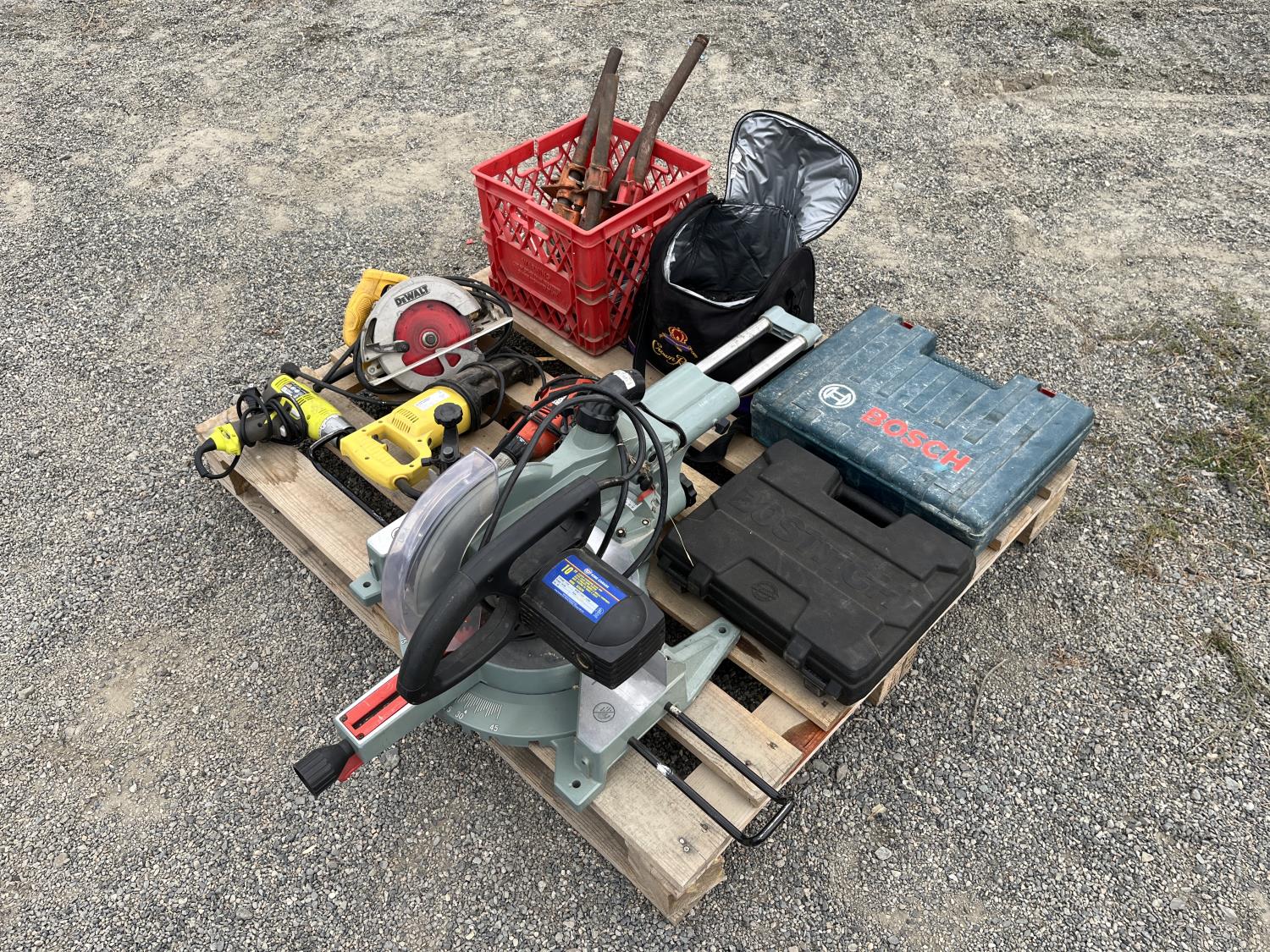 Dewalt circular saw, Riobi plus in drill, Black & Decker plus in drill, Power Fist reciprocating saw, (5) wood clamps, Bostitch nail gun, Bosch rotary hammer