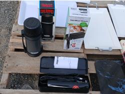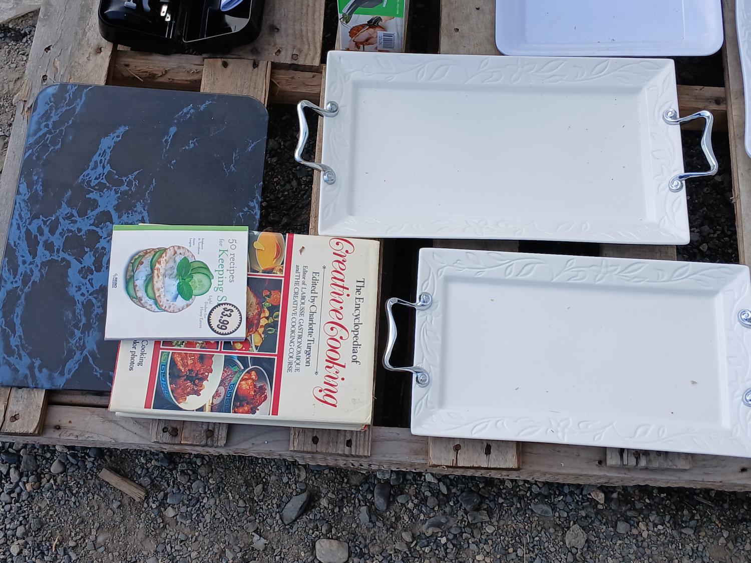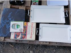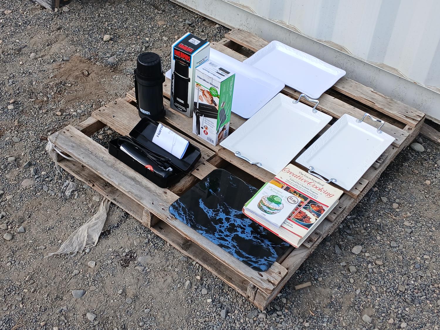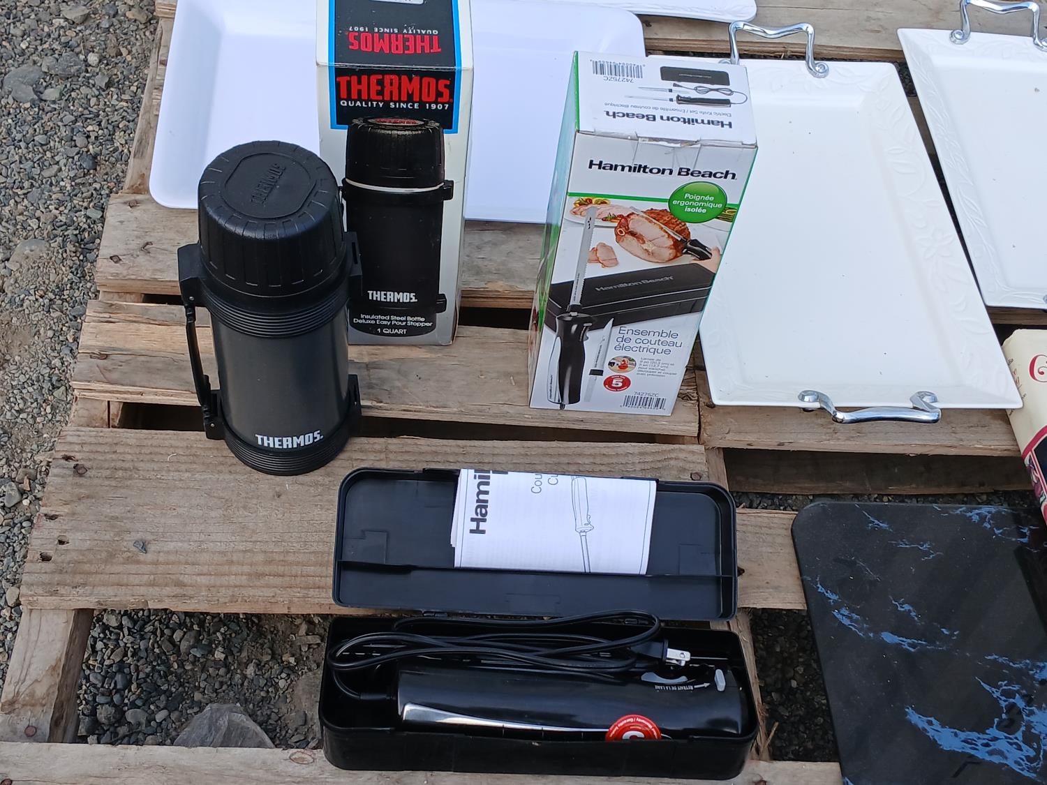 (4) Serving platters, cook books, glass cutting board, Hamilton Beach electric carving knife, 1 quart (.95Lt) insulated steel Thermos.