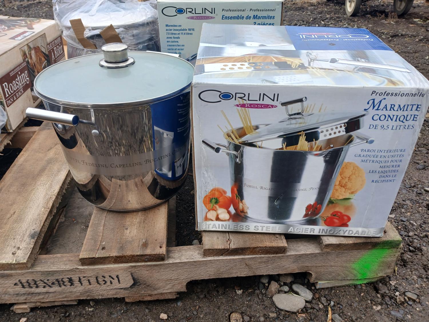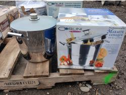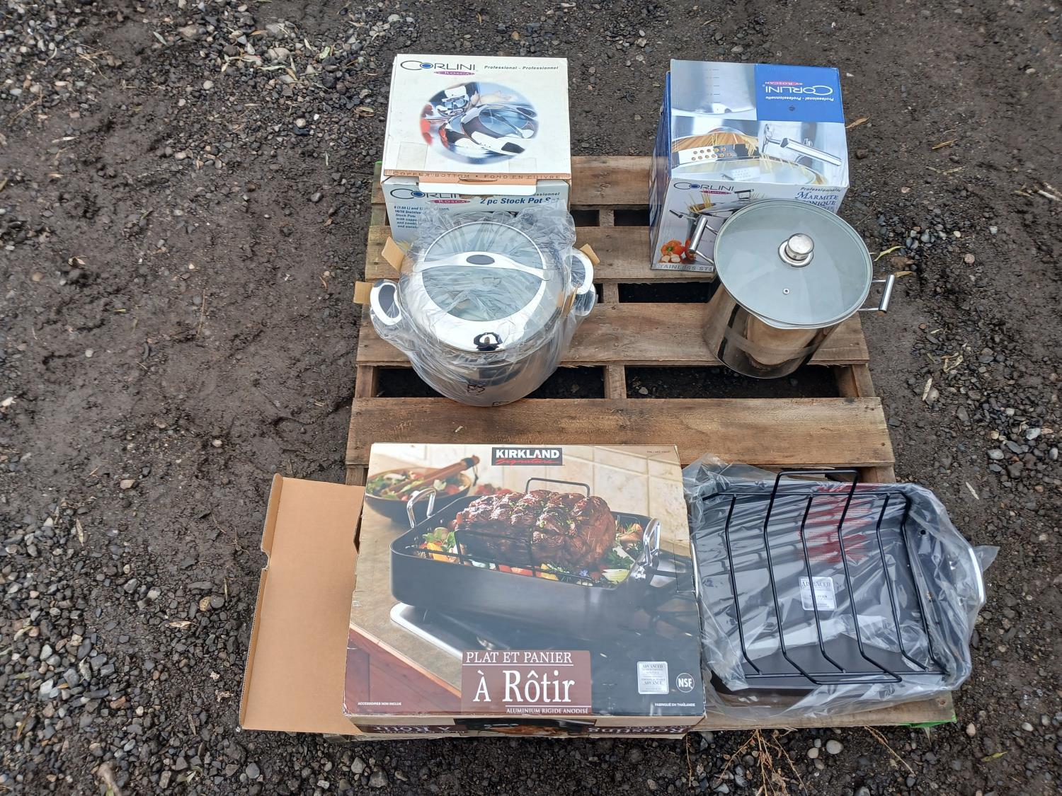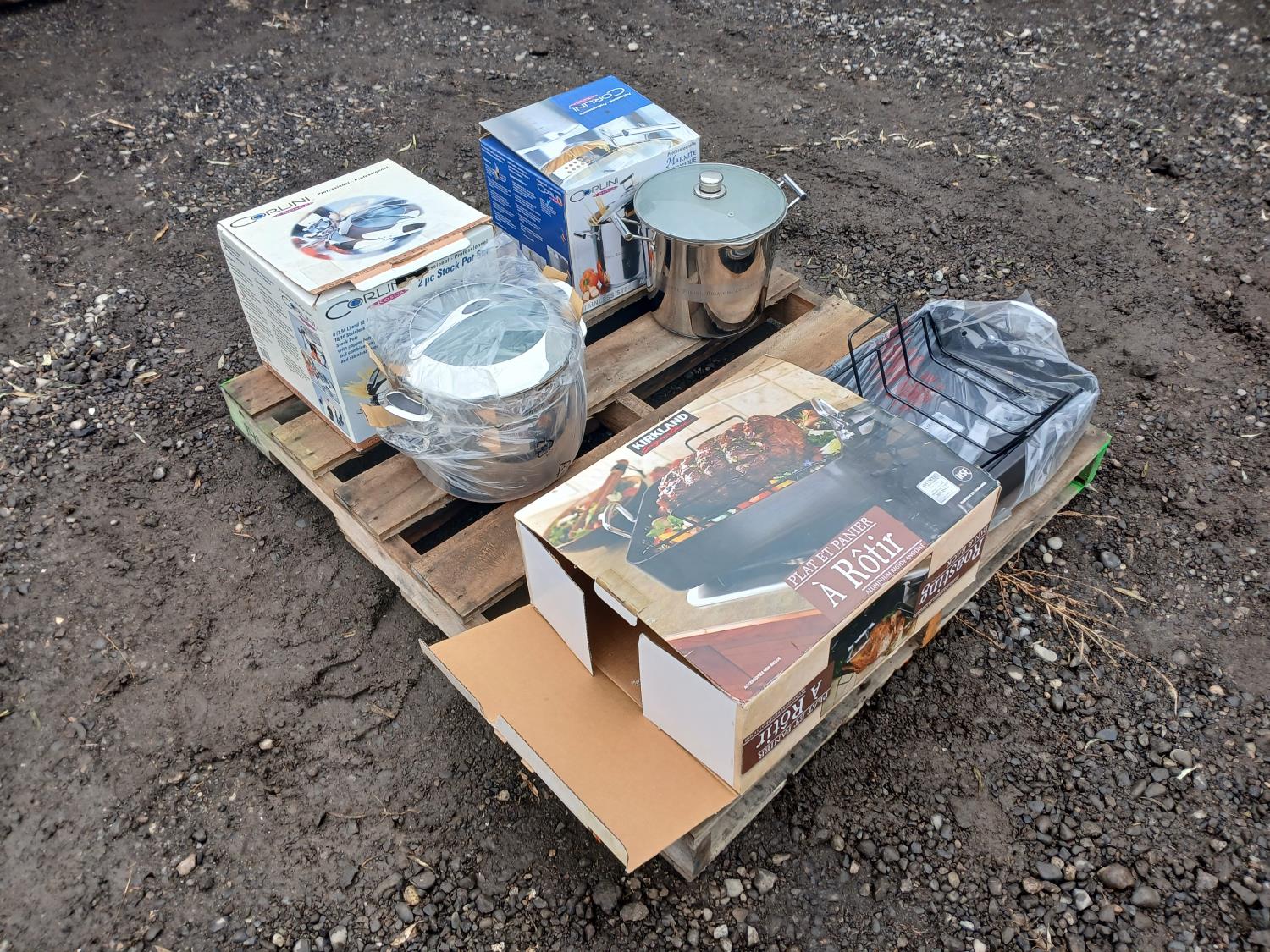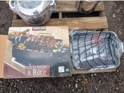 (1) "Corlini" 2 piece set (7.54Land 11.4L) Stock pot set, (1) "Corlini" 9.5L Stock pot, (1) "Kirkland" non-stick Roasting pan.