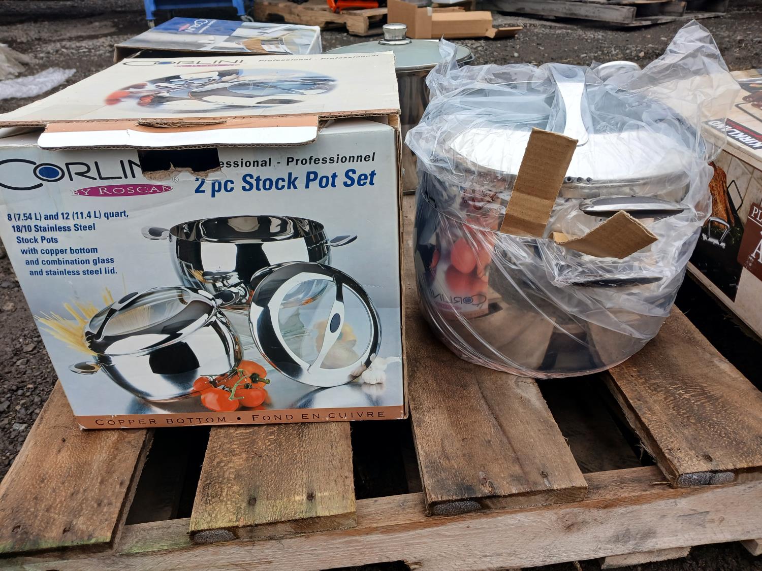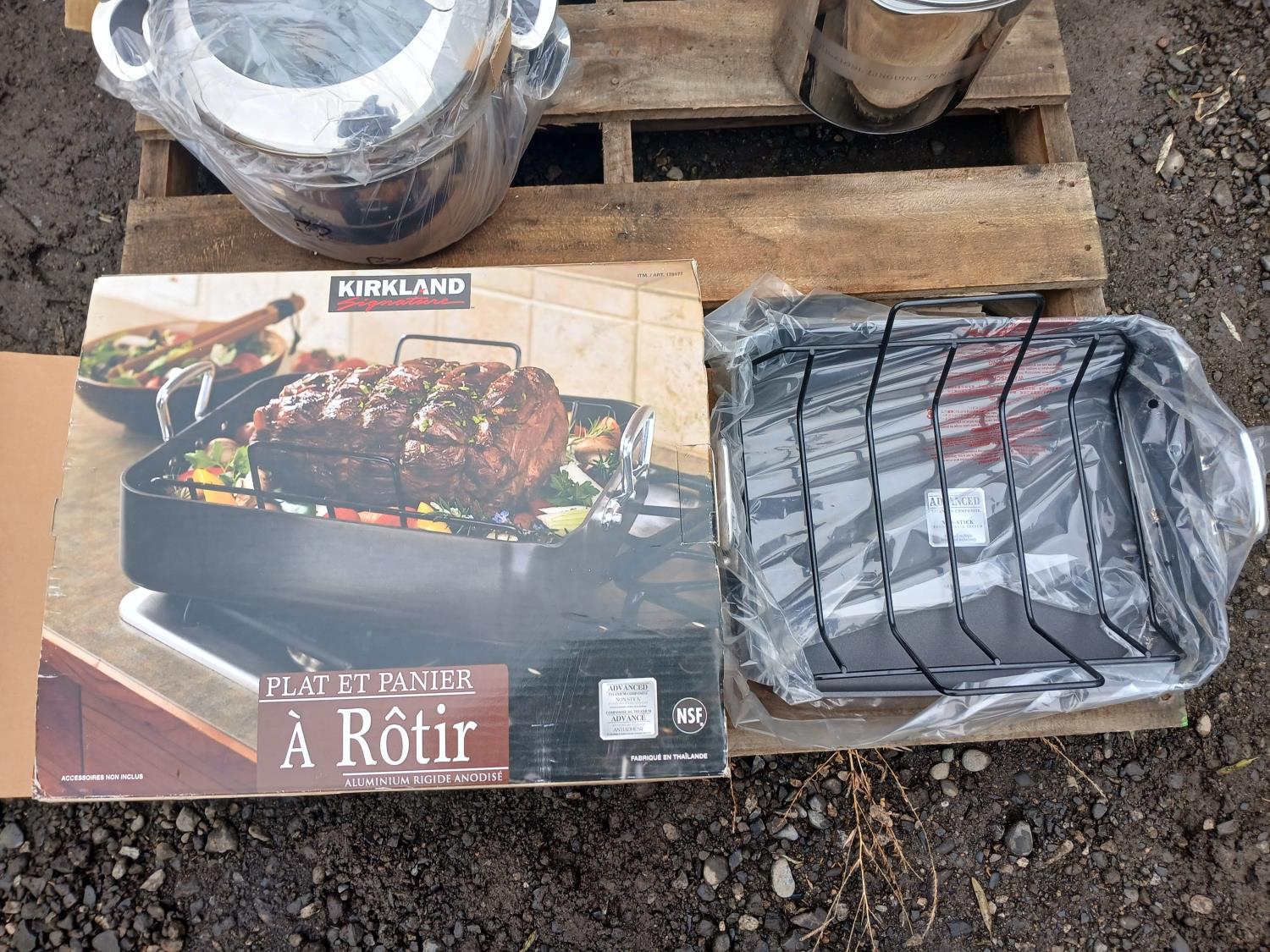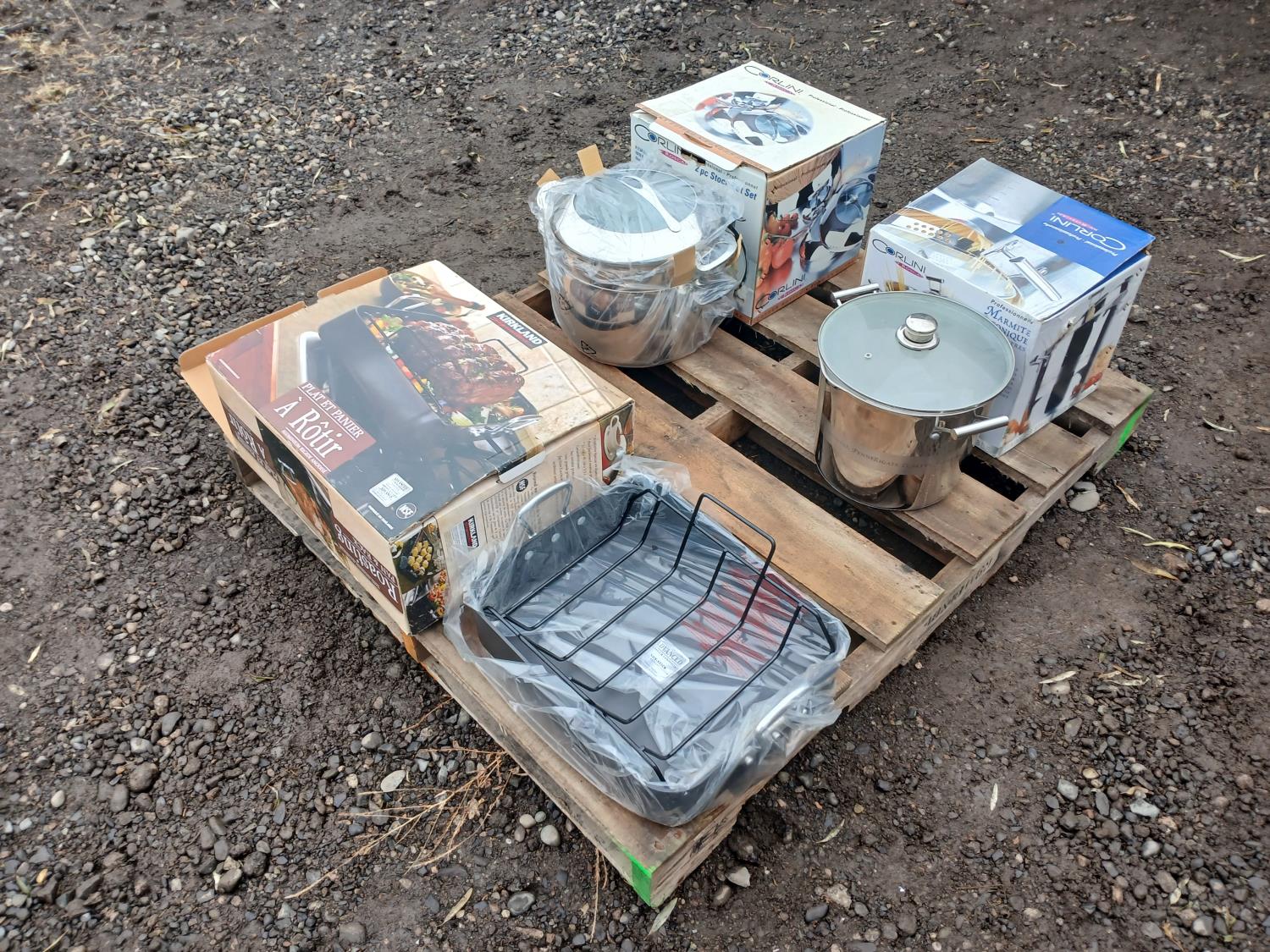 (1) "Corlini" 2 piece set (7.54Land 11.4L) Stock pot set, (1) "Corlini" 9.5L Stock pot, (1) "Kirkland" non-stick Roasting pan.