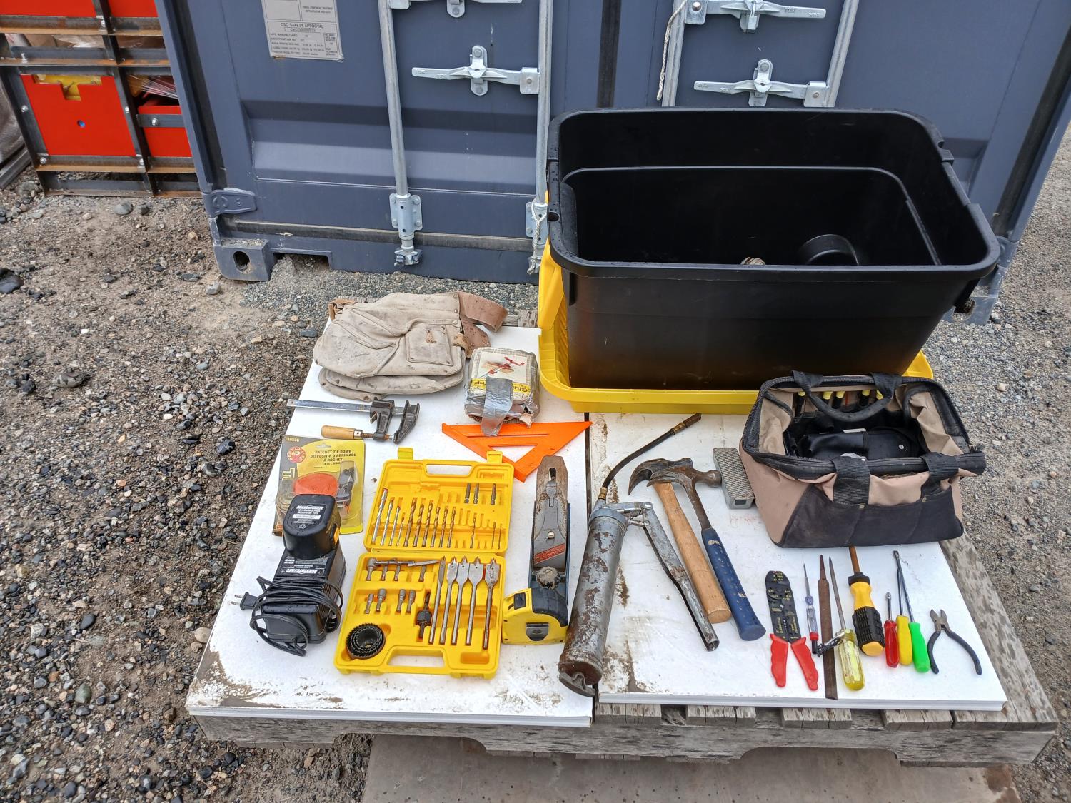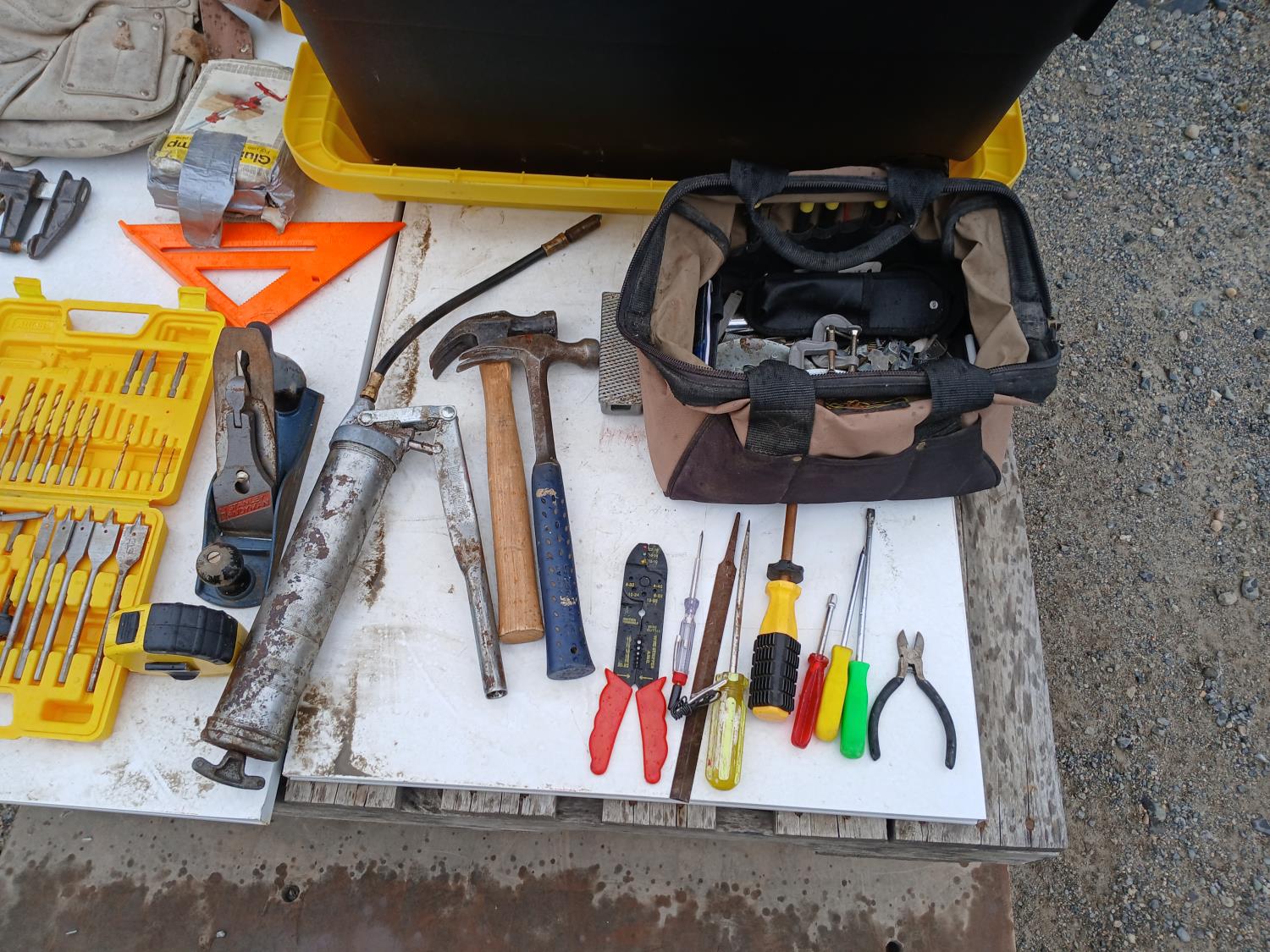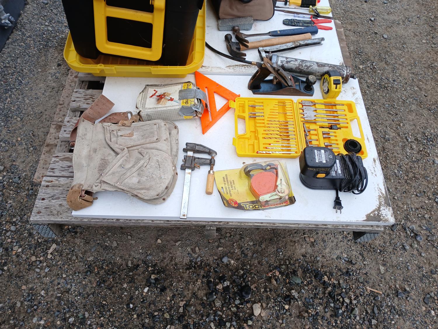 Hammers, straight edge axe, leather tool belt, square, drill bit set, hand planer, Mastercraft battery and charger, multiple other tools and accessories.