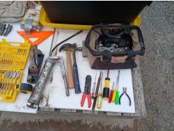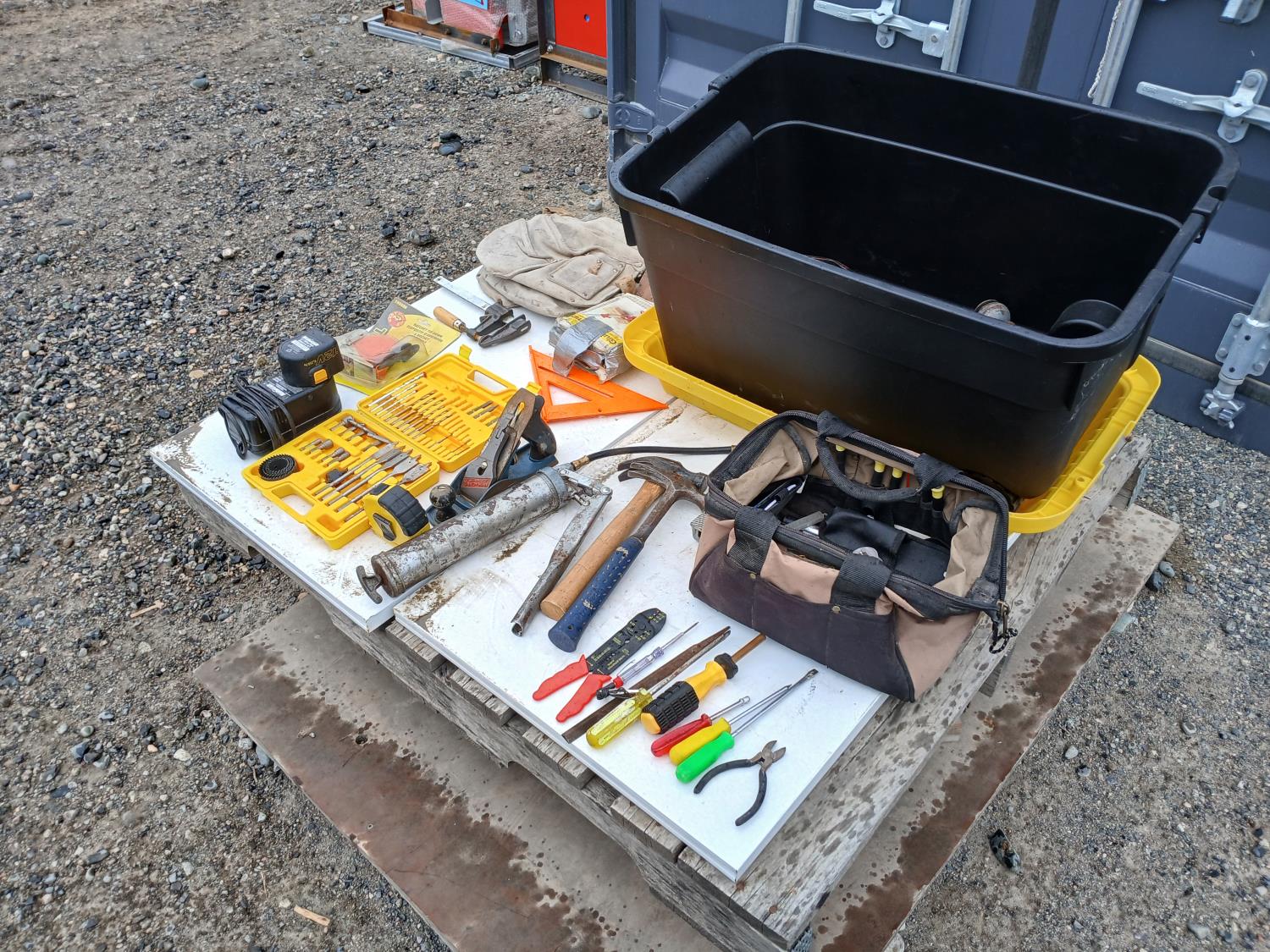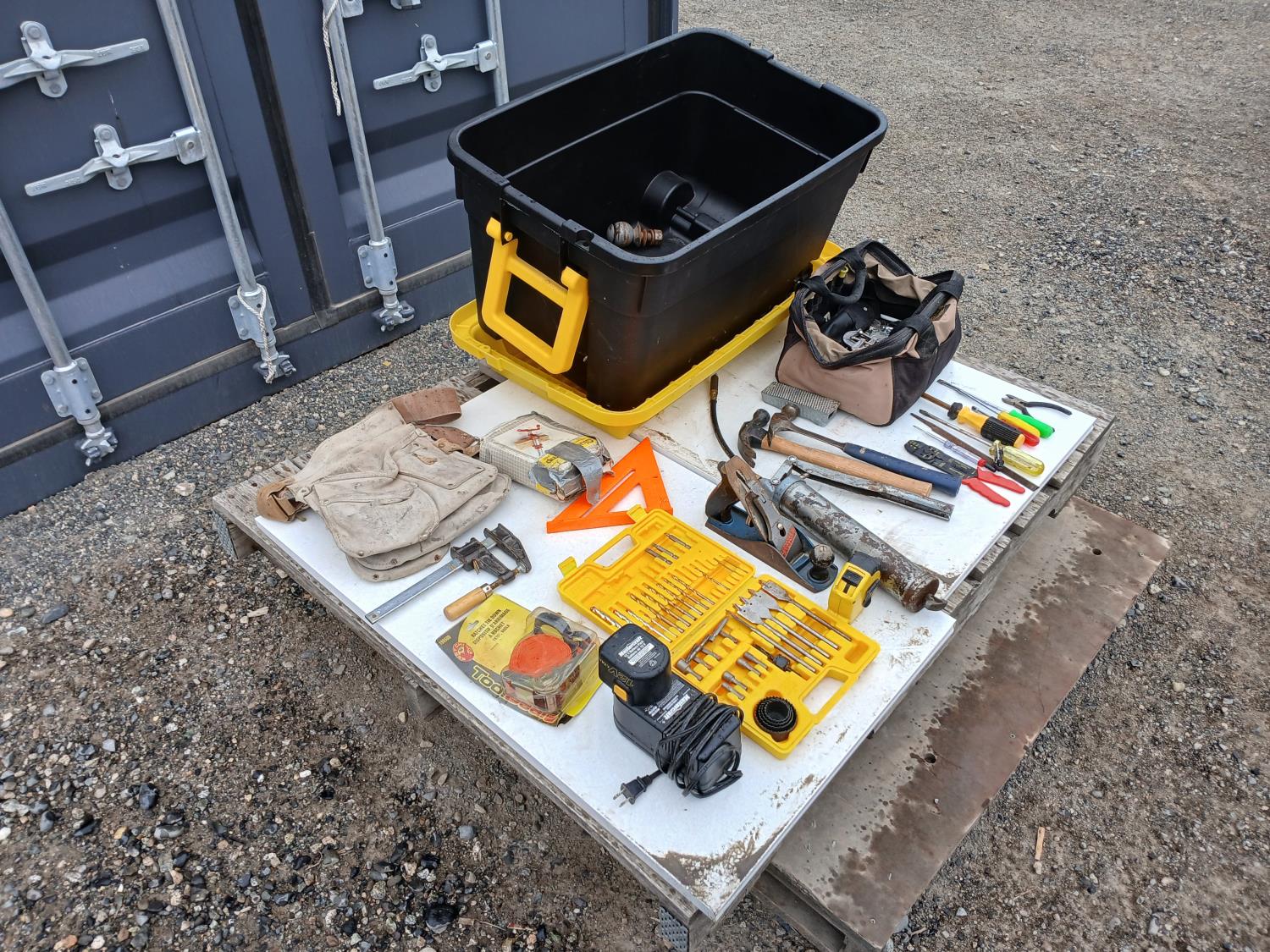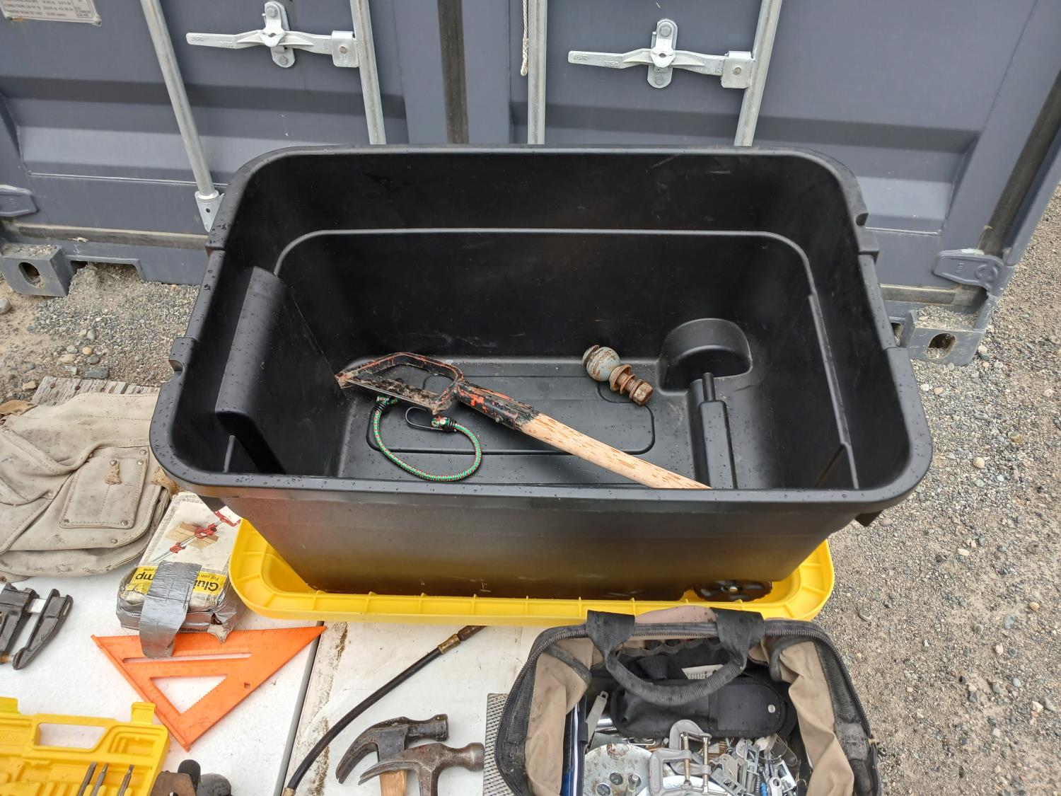 Hammers, straight edge axe, leather tool belt, square, drill bit set, hand planer, Mastercraft battery and charger, multiple other tools and accessories.