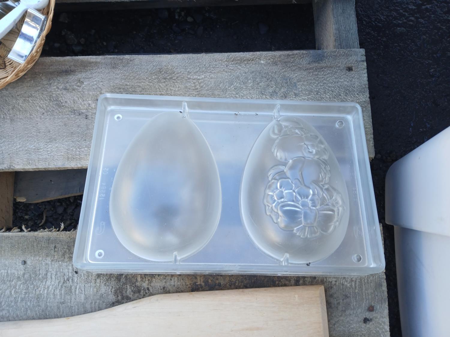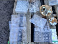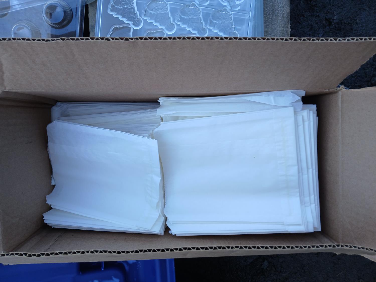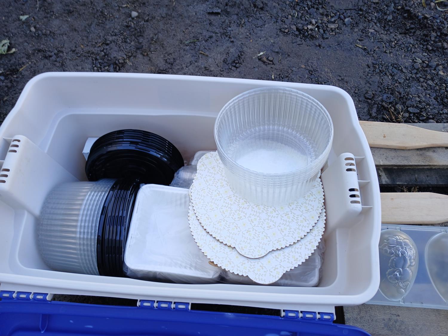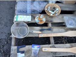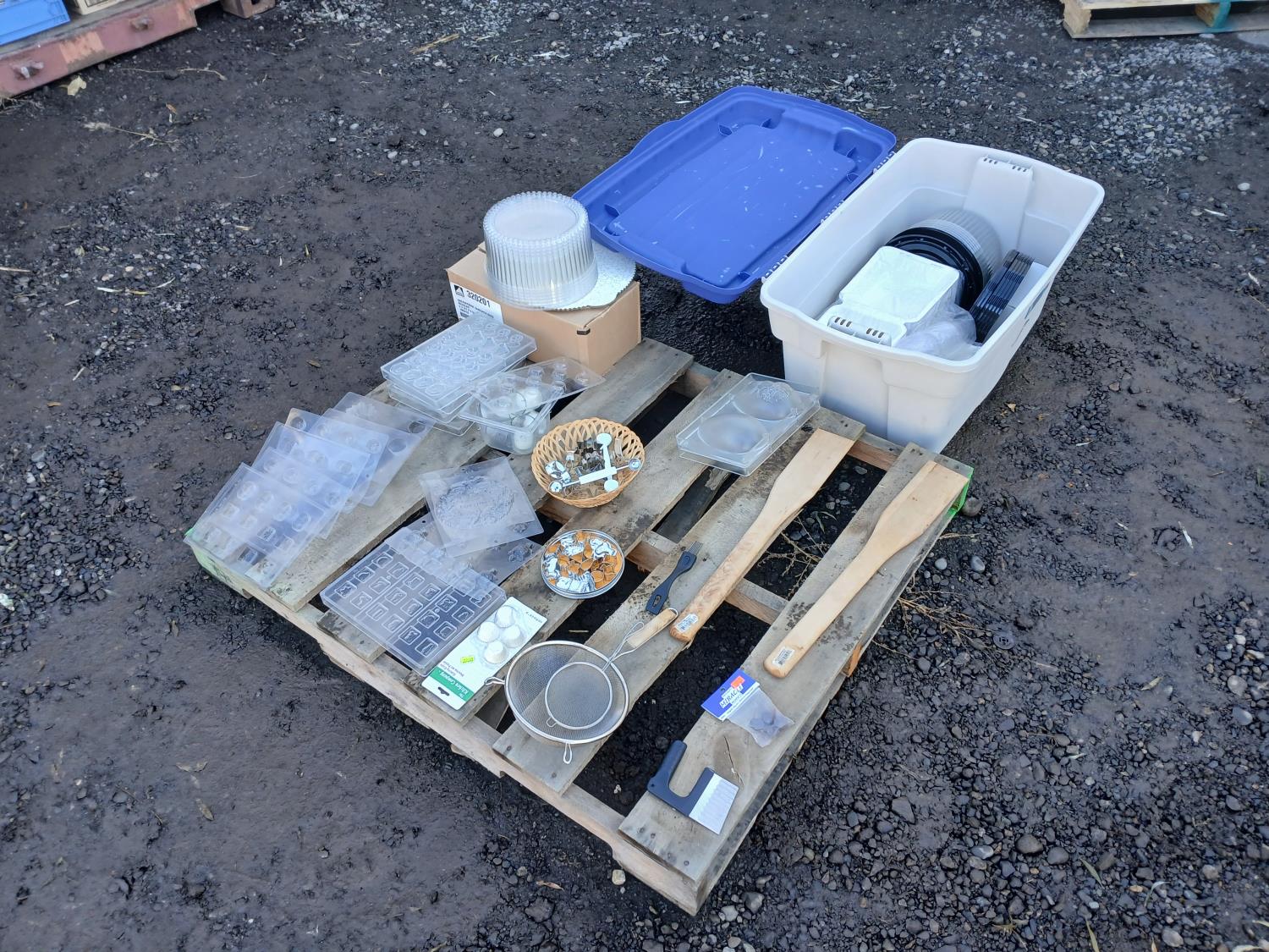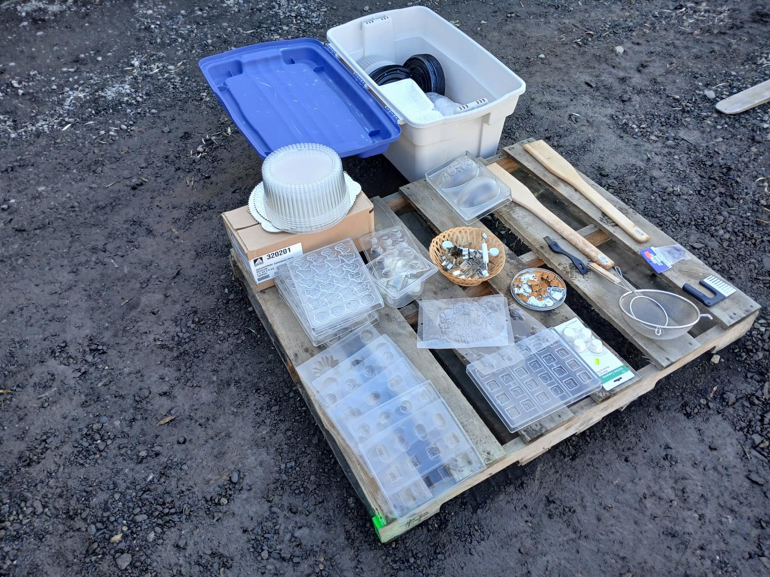 Large assortment of chocolate/fondant molds, cake take out containers, baked goods take out bags, (2) melon ballers, various cookie cutters, (2) large stirring paddles and other accessories.
