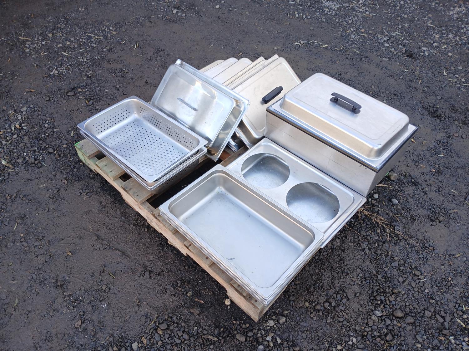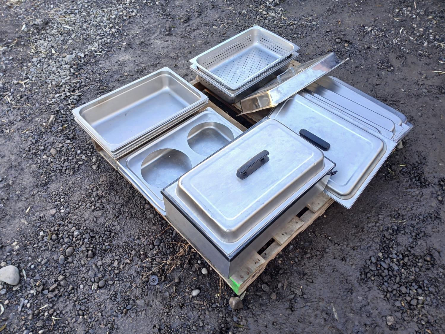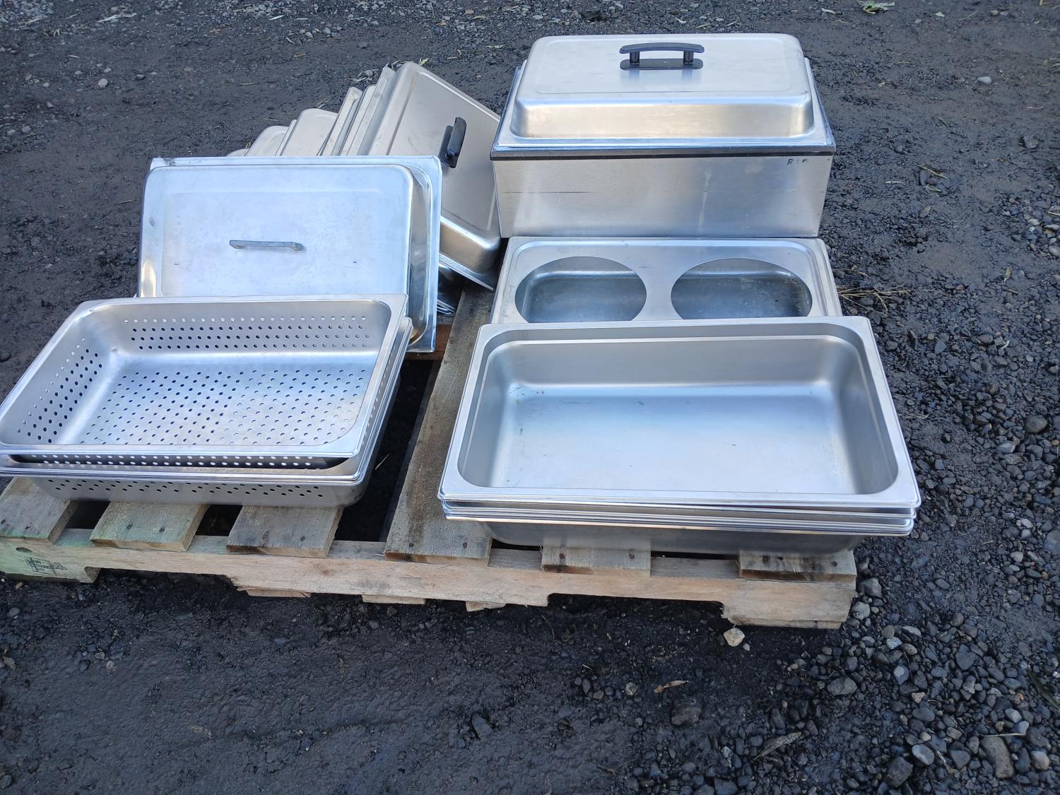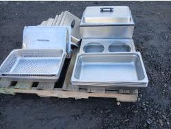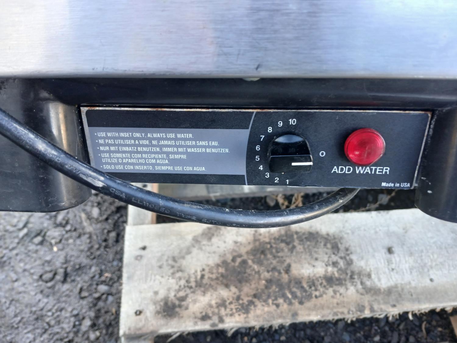 (7) Full length lids, (4) full length 2inch deep inserts, (3) full length 2 inch basket inserts, (1) Double round divider plate. (1) Large water bath warmer, with temperature control.