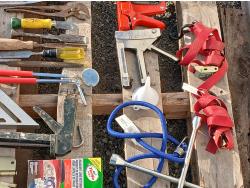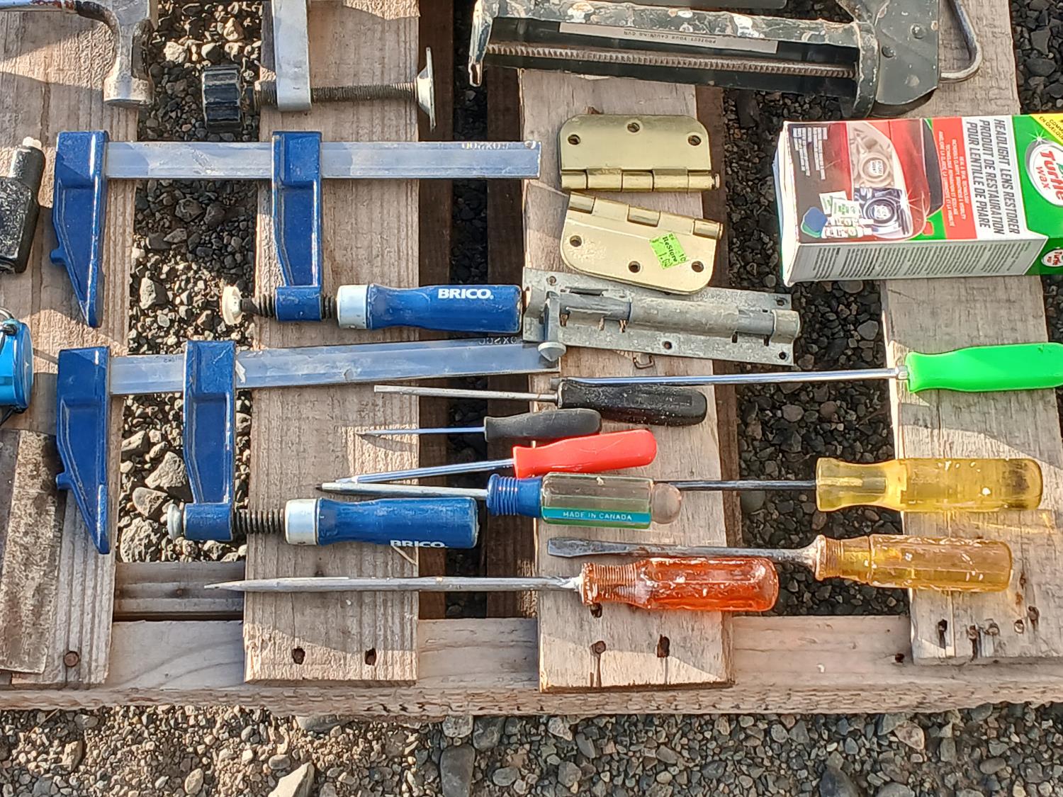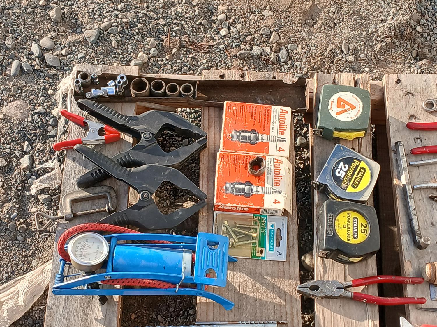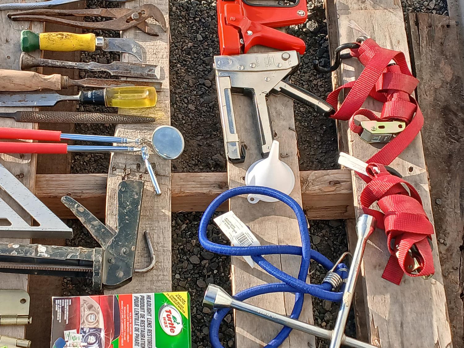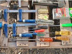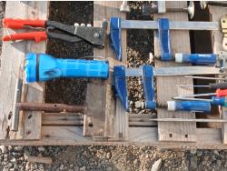 Multiple clamps, pliers, screw drivers, tie down straps, and other various hand tools, and accessories.