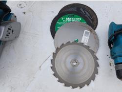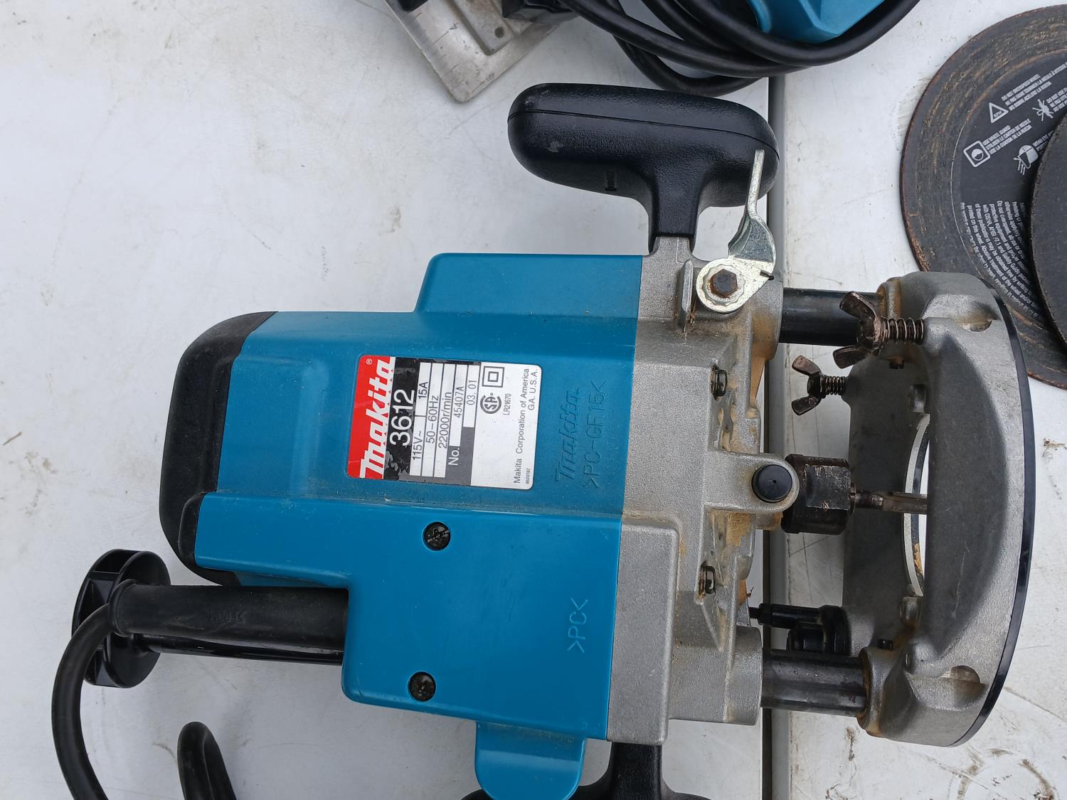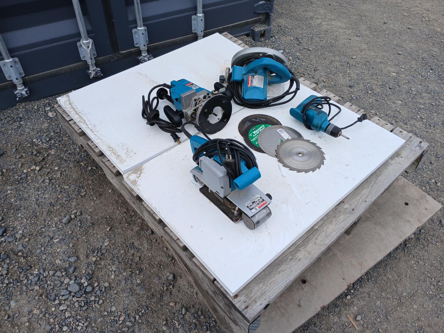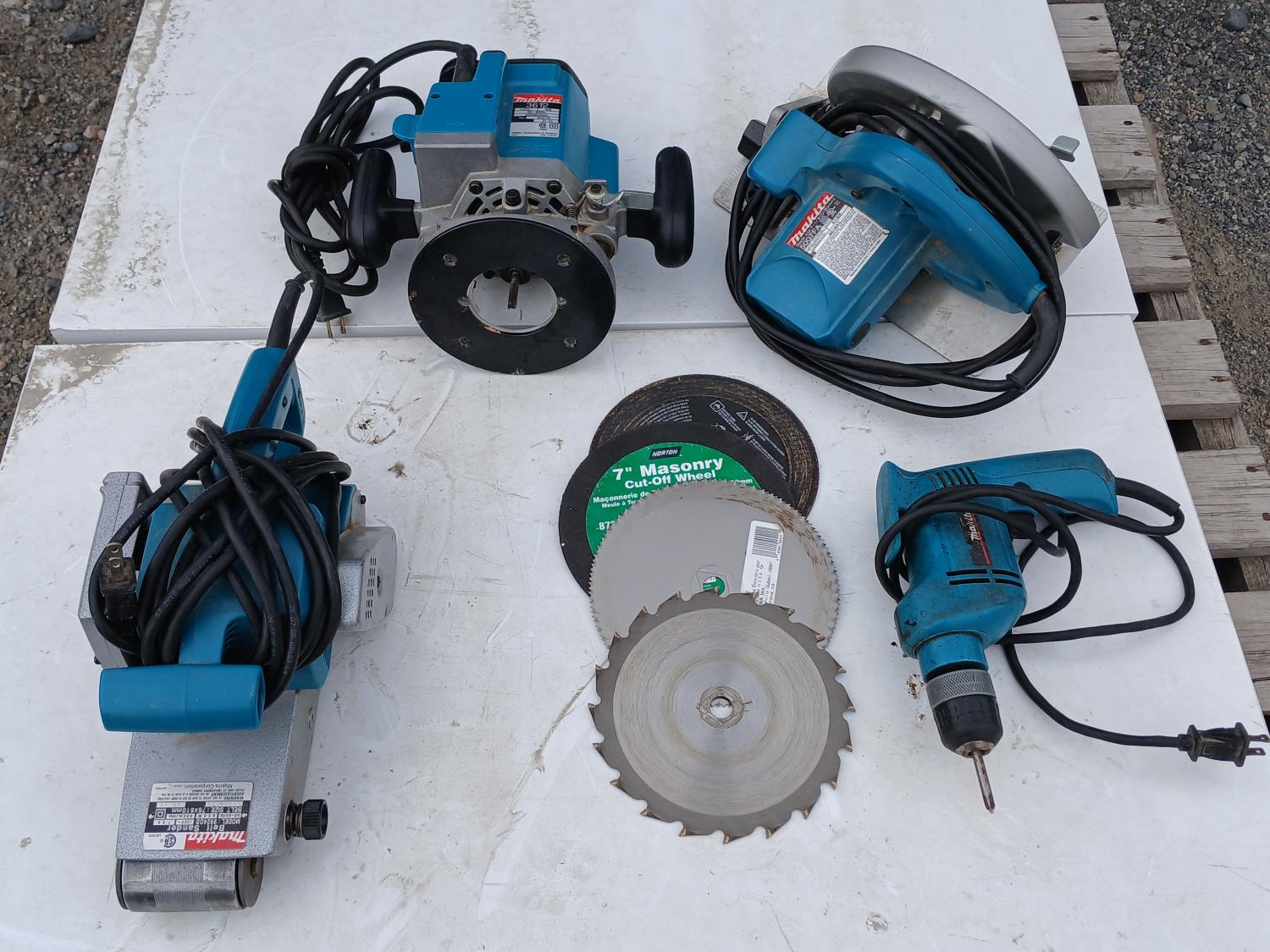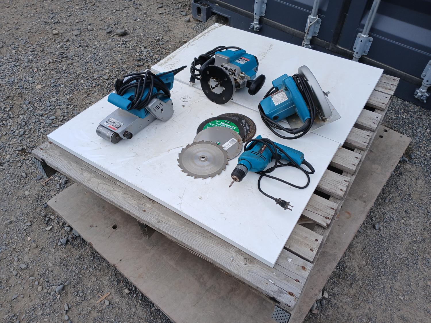 Skill saw with extra blades, Router, Drill, Belt sander.