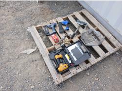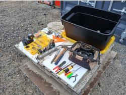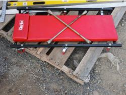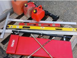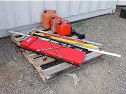 (1) Clarke Creeper dolly (1) 24 inch level, (1) 48 inch level (3) small Geri cans, (1) Tire iron, (1) Drywall square, (1) metal sill plate, (2) Heavy Duty Trailer jack parts.