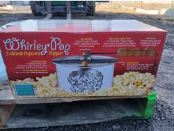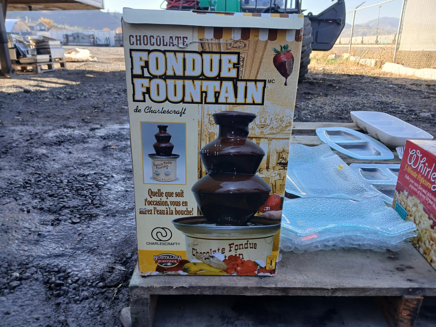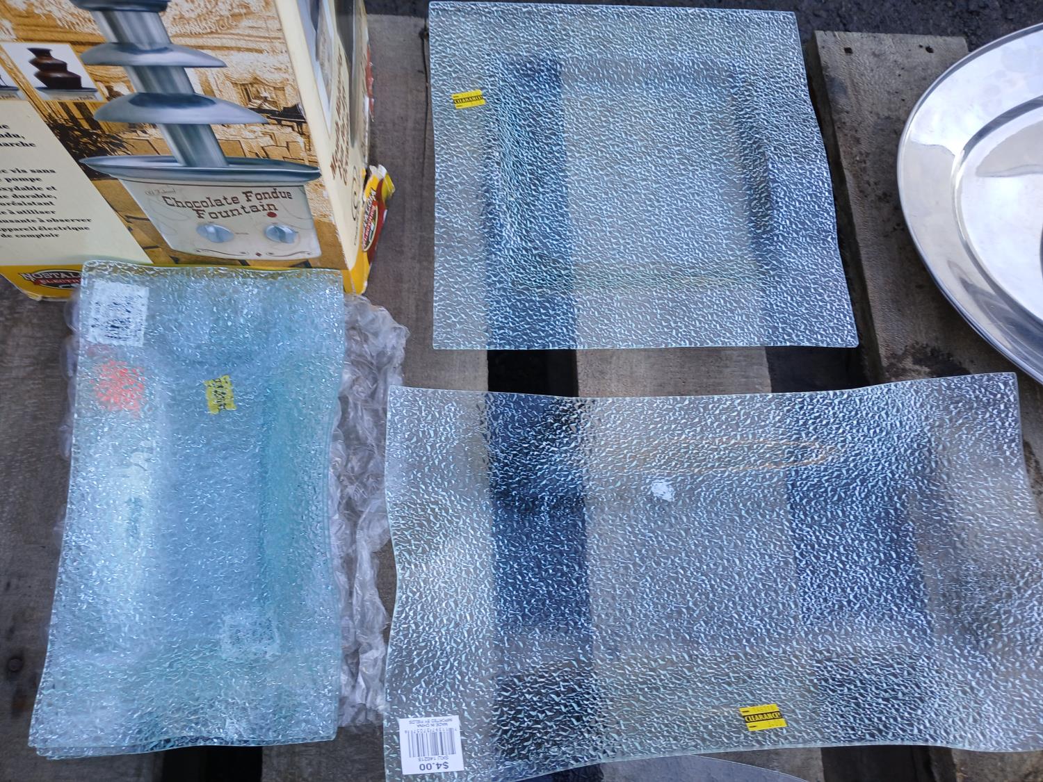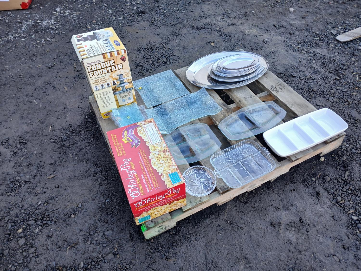 (19) Stainless steel platters (various sizes), (10) glass platters (various designs and sizes), (1) ceramic condiment platter (1) fondue/chocolate fountain, (1) Whirlie Pop popcorn popper.