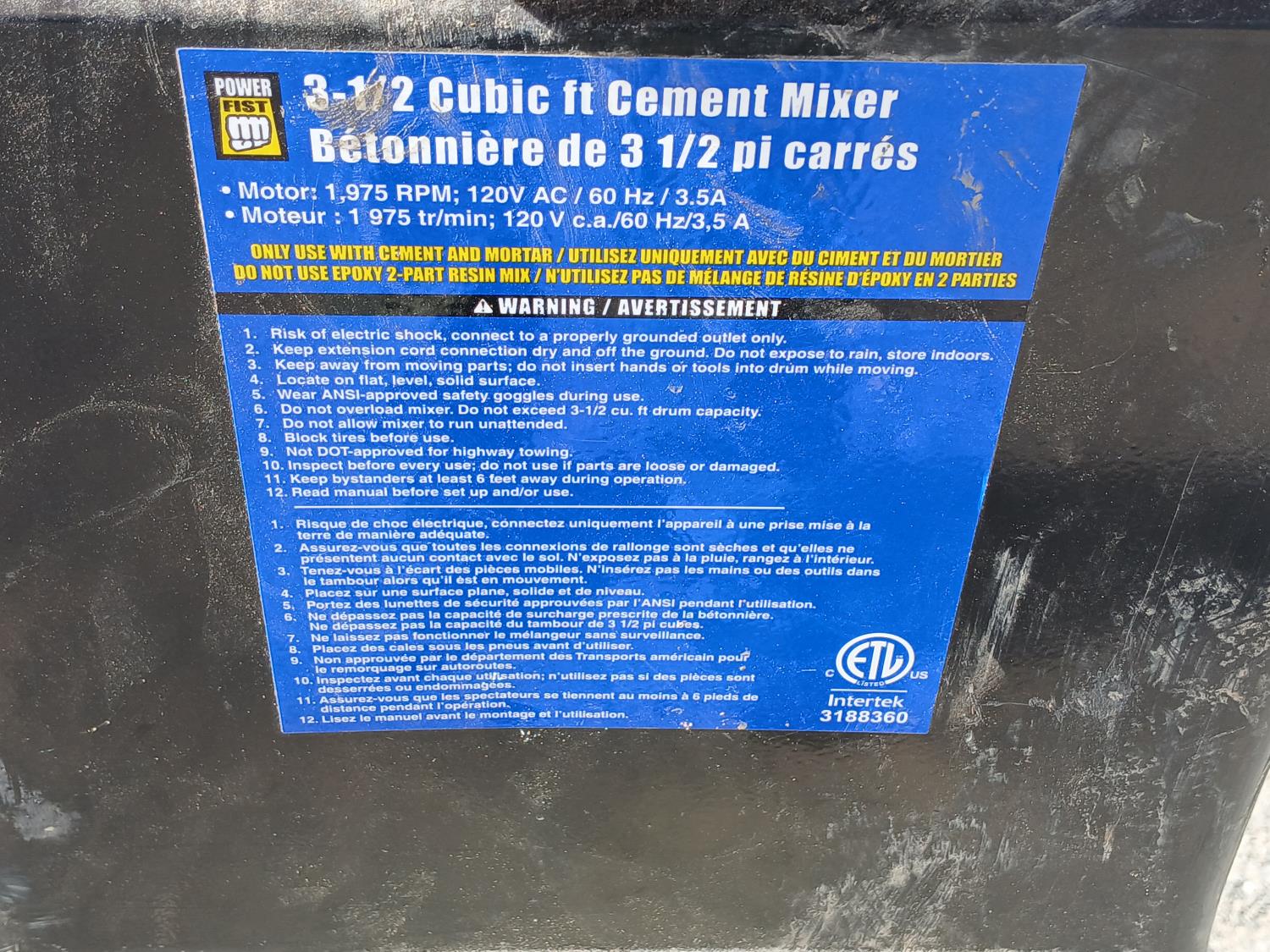3.5 cubic foot cement mixer, motor 1975 rpm. 120 V ac/60hz/3.5A
