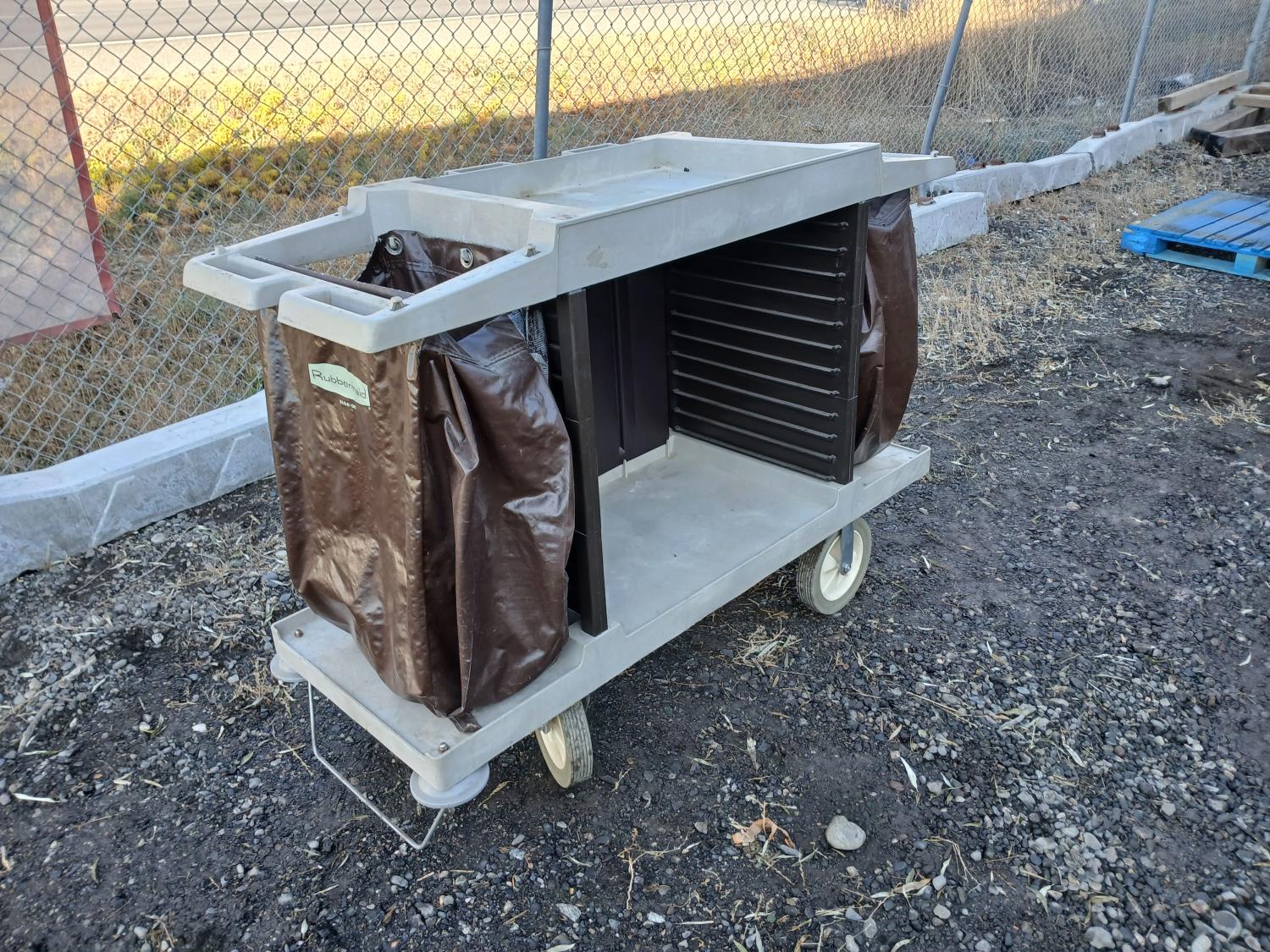 Linen and Garbage carrying spaces, rack storage under storage, cart is mounted on wheels. Comes with a spare bag.