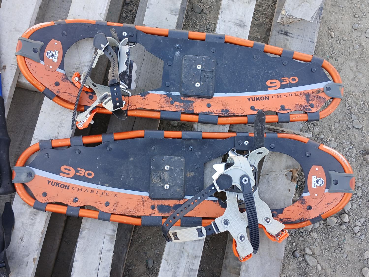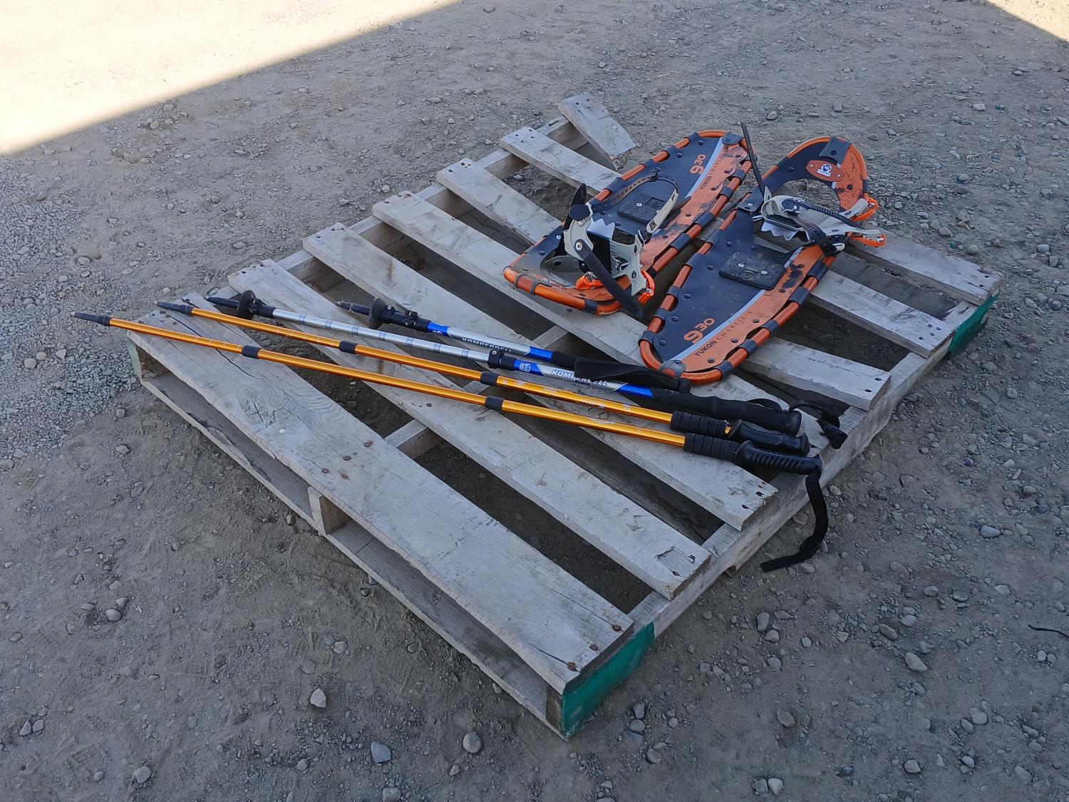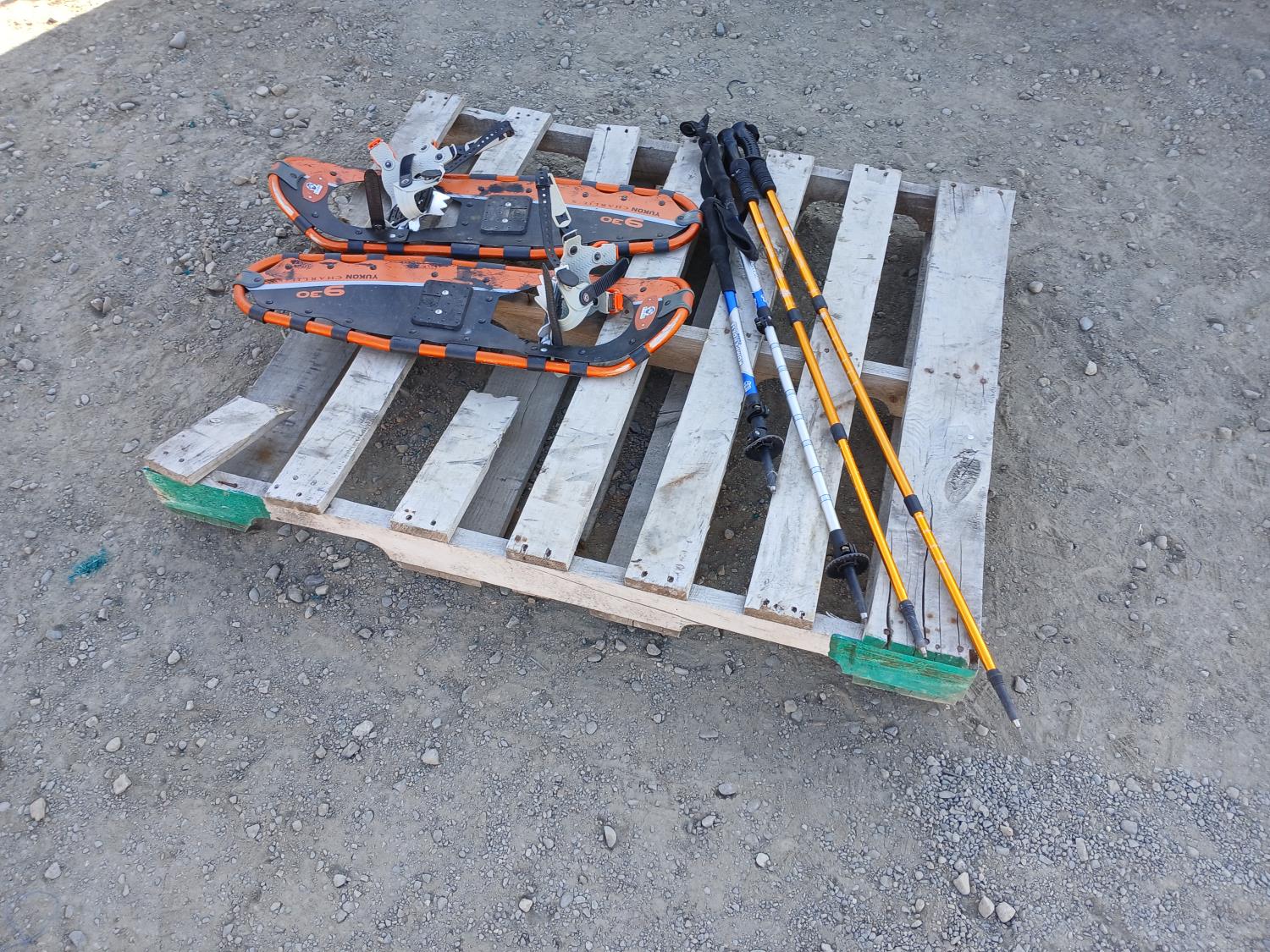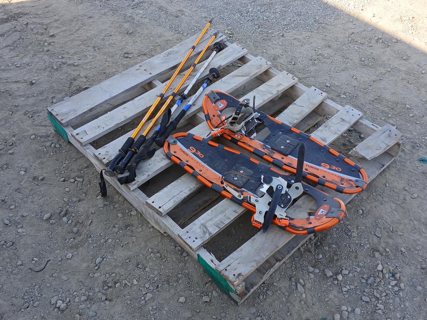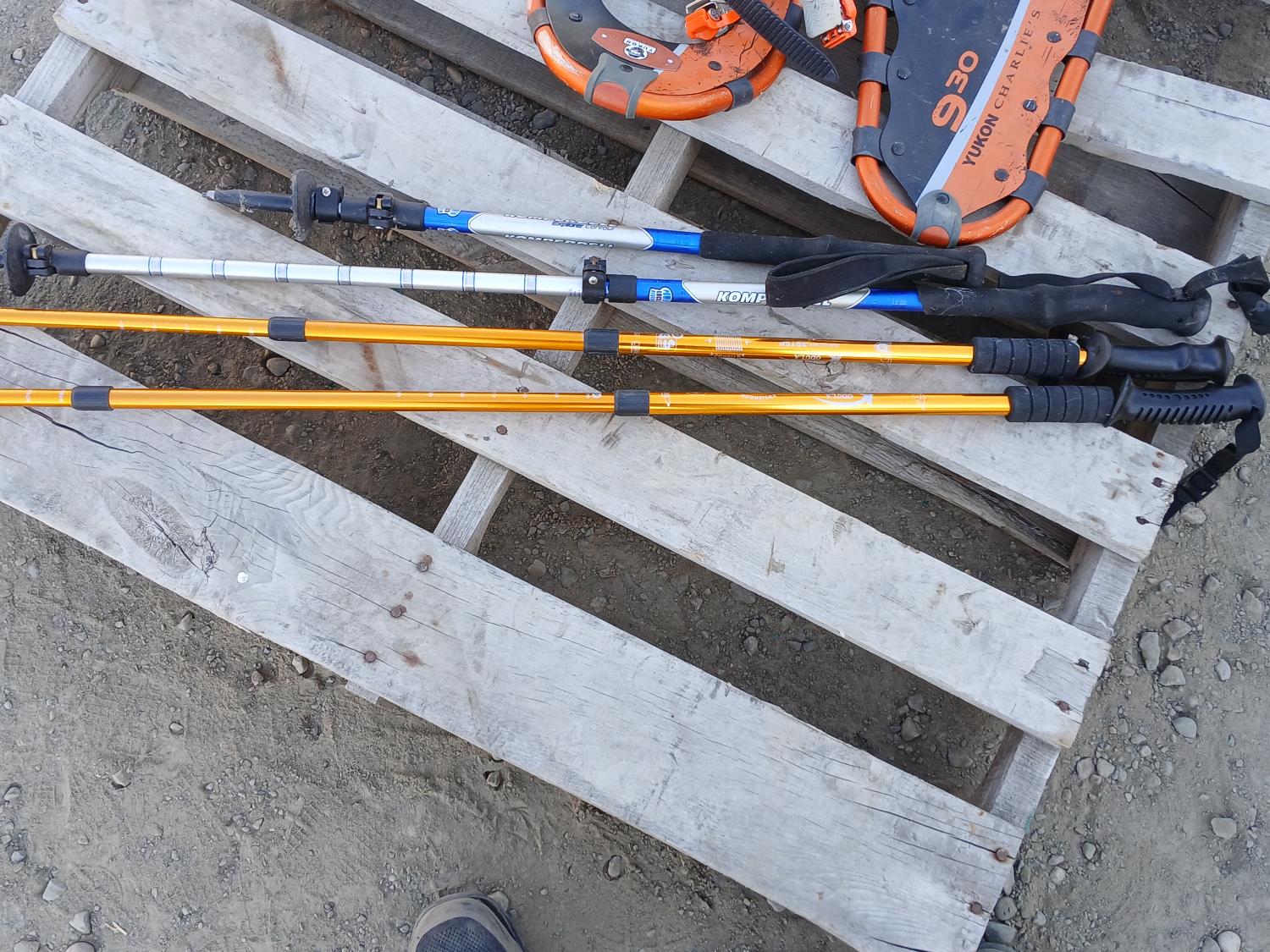 (1) pair Yukon Charlie 930 snow shoes, (2) pairs trekking poles