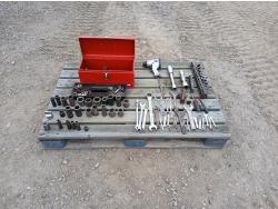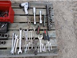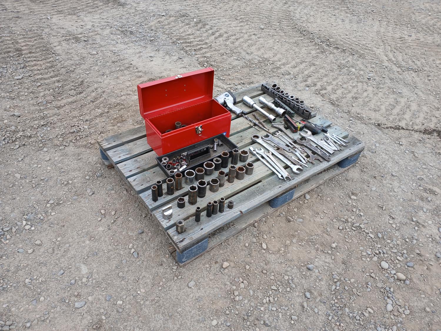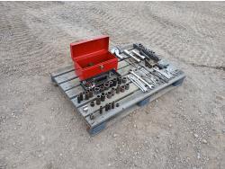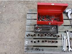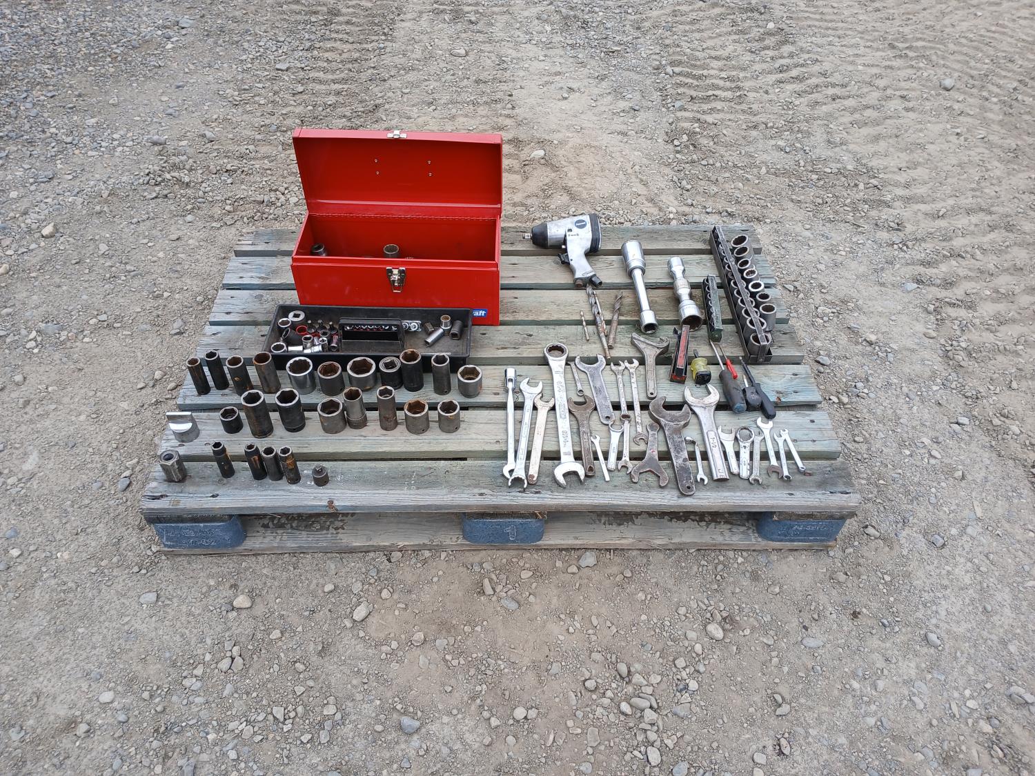 (1) Red tool box, large socket set, wrench set, drill bits, screw drivers, (1) Power mate air impact wrench.