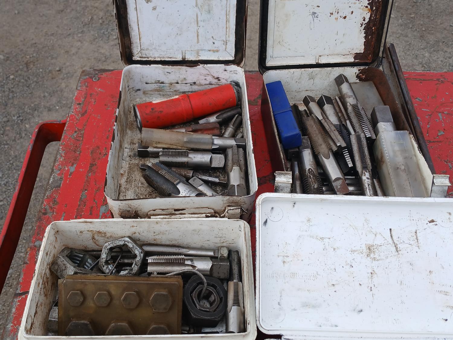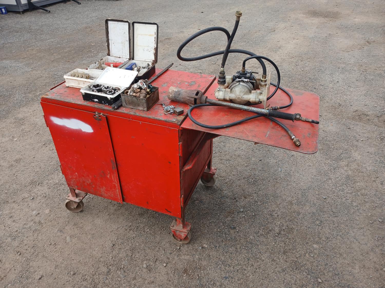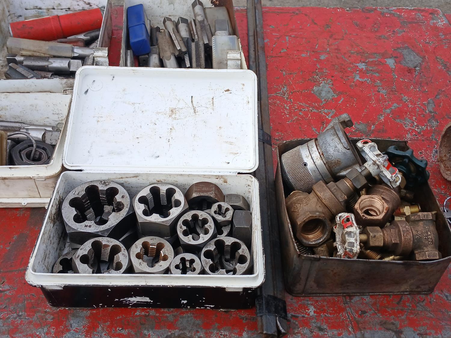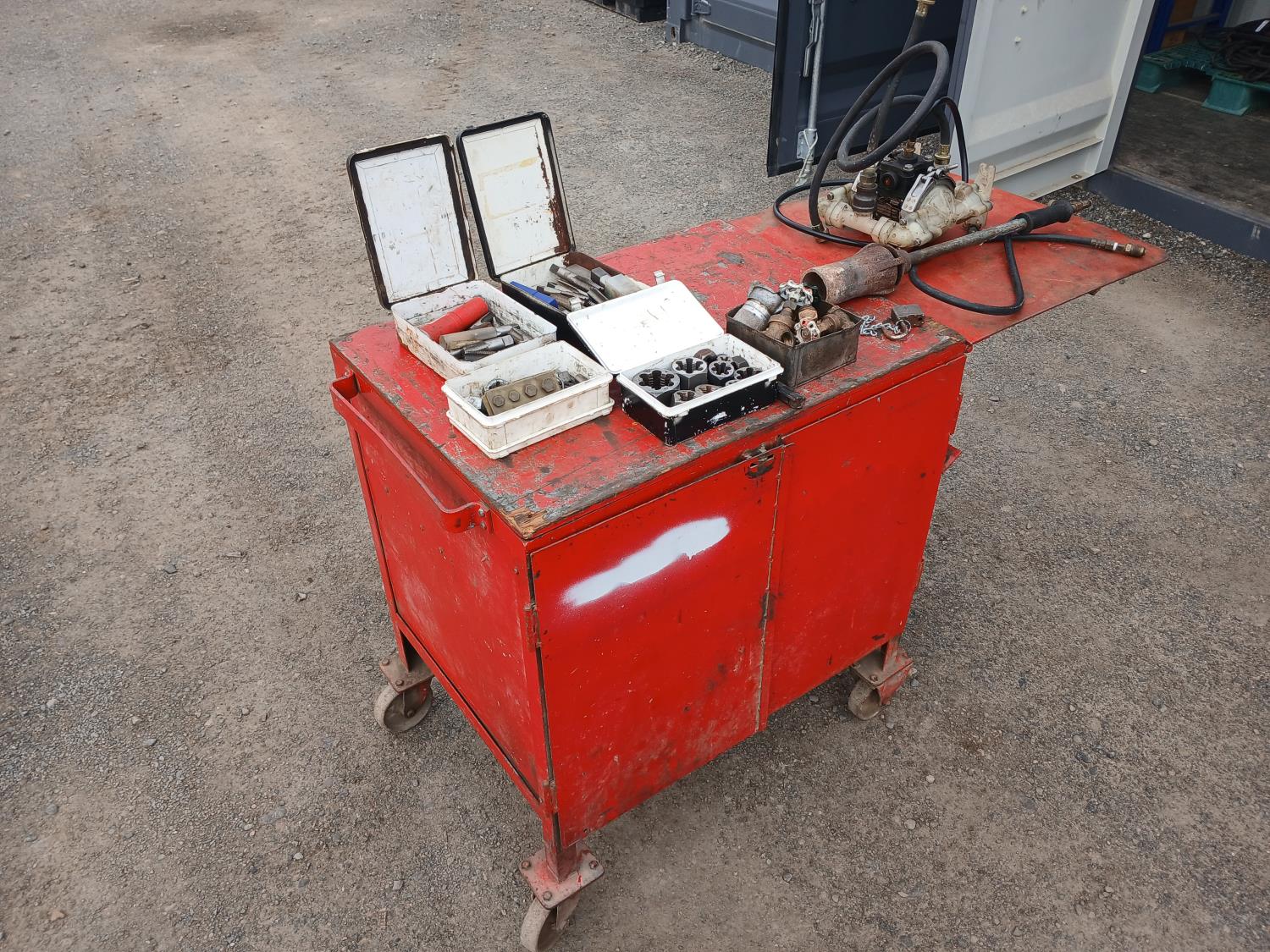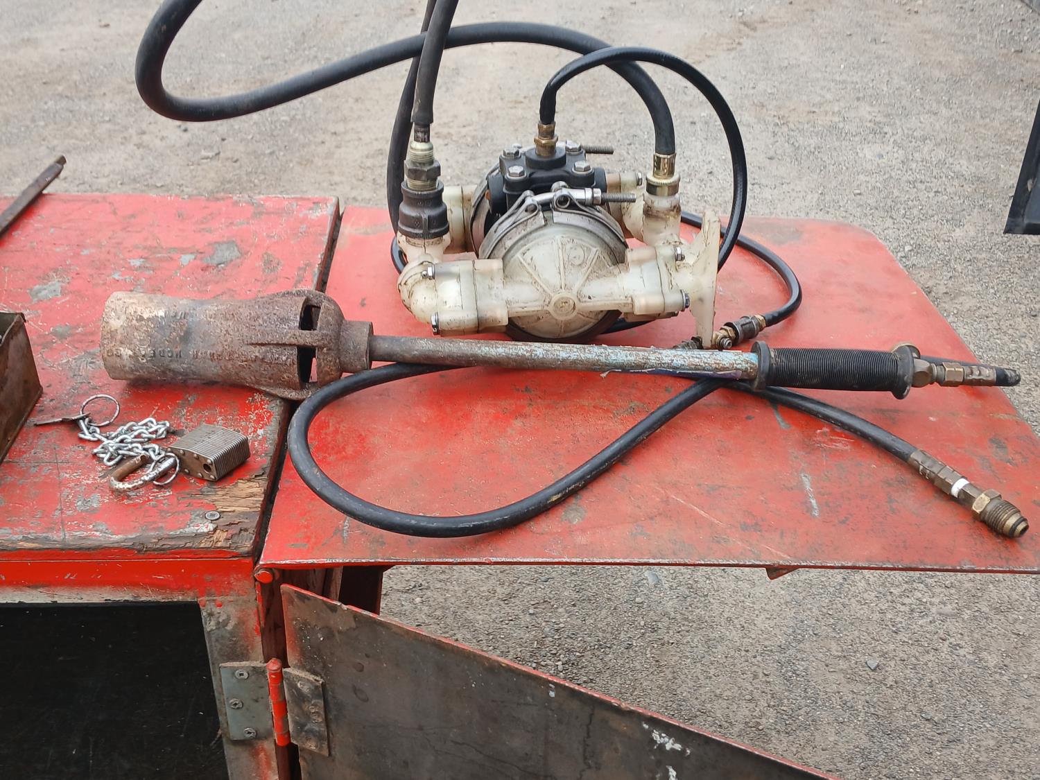 (1) small container of dies, (3) small containers with taps, (1) container with valve taps, (1) Air transfer fluid pump, (1) propane torch (includes lock with key)