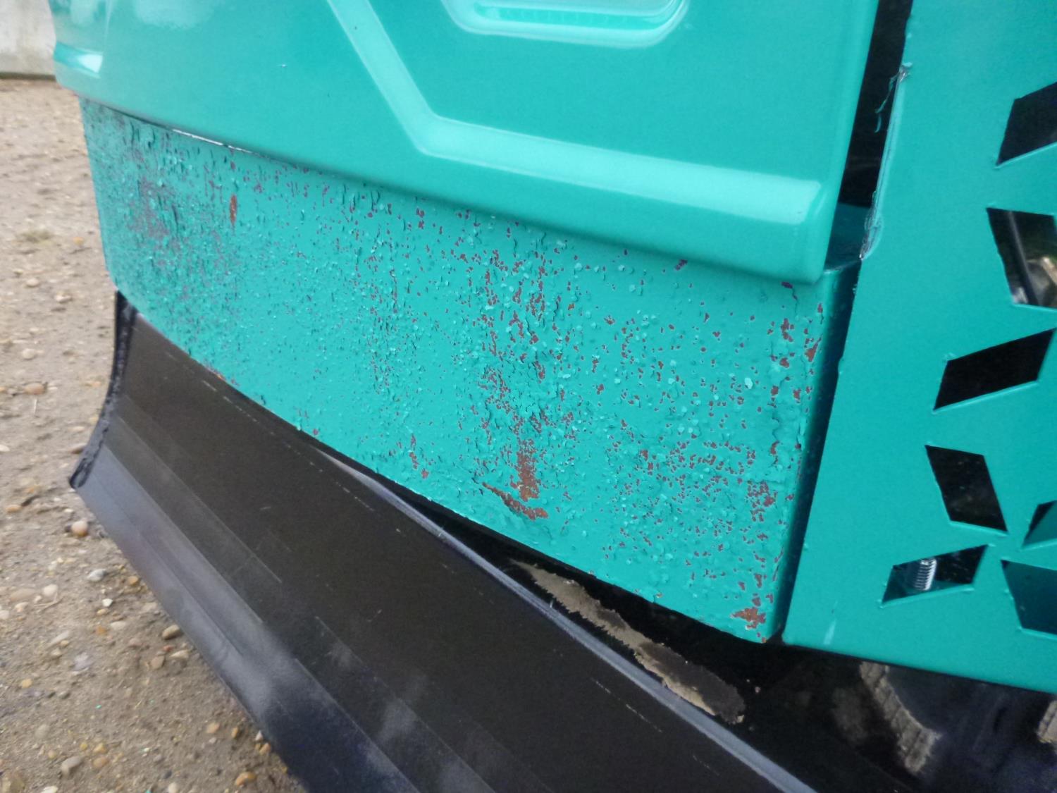 Open station, 420cc gas engine, 16 inch dig bucket, manual thumb, 2 Ft 8 inch stick, backfill blade, rear paint flaking, 7 inch rubber tracks