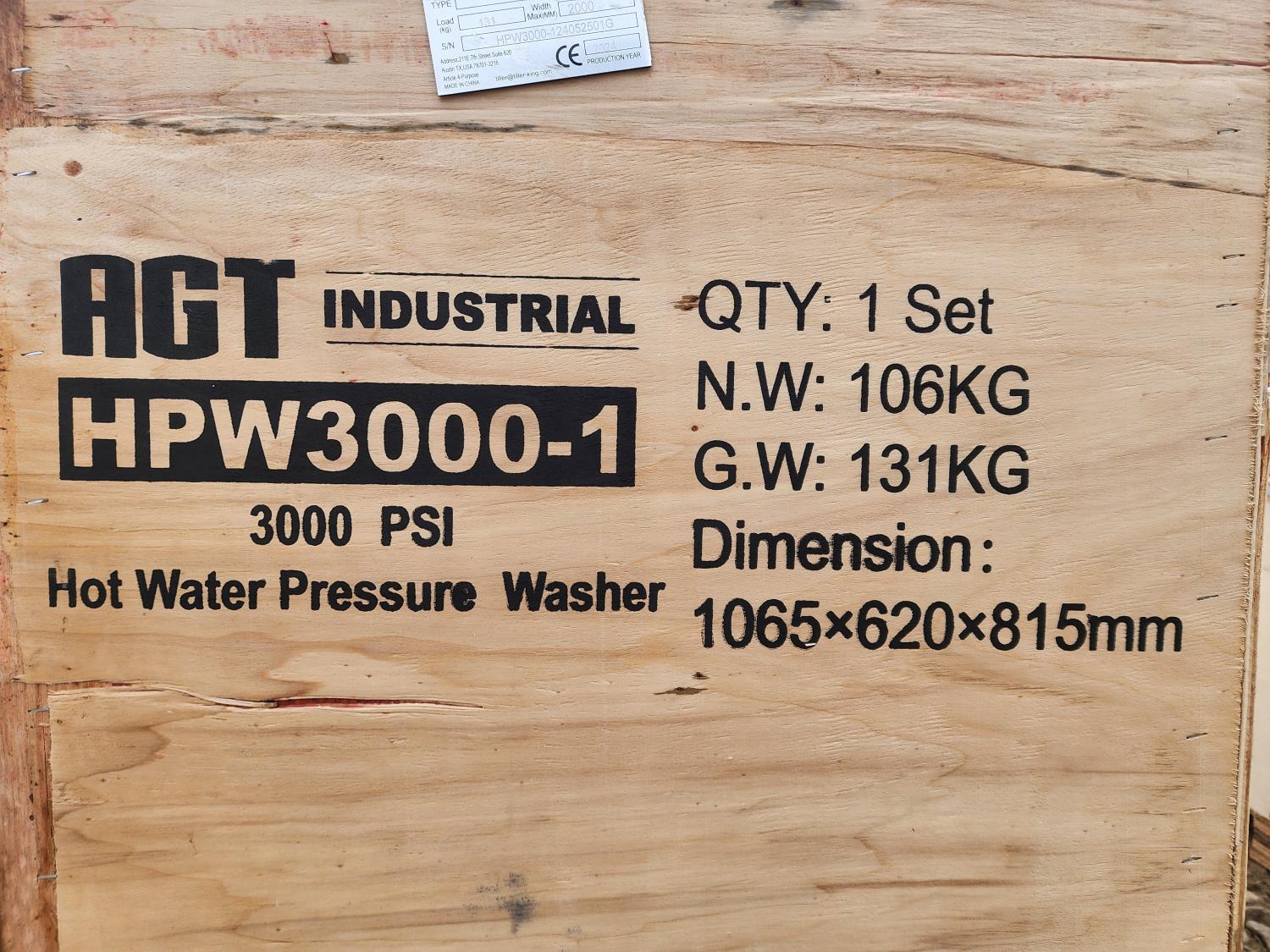 3243 AGT HPW3000-1 3000 PSI Hot Water Pressure Washer (Unused)