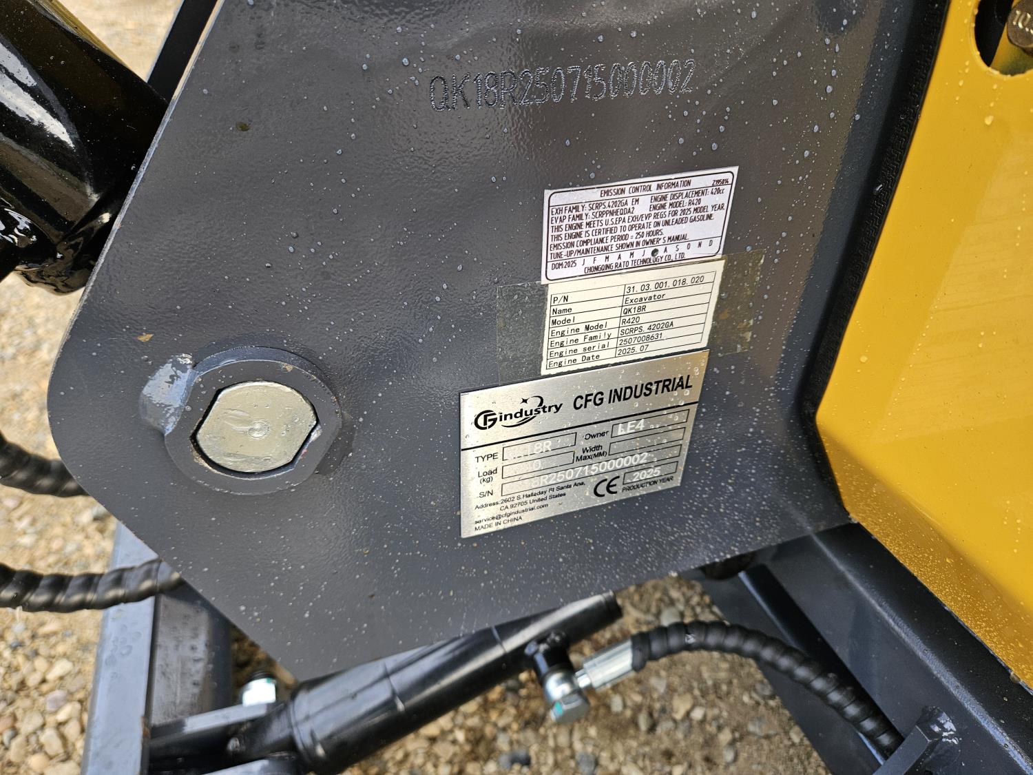 Open station, pilot controls, 420cc gas engine, 15 inch dig bucket, manual thumb, 2 Ft 8 inch stick, backfill blade, 7 inch rubber tracks