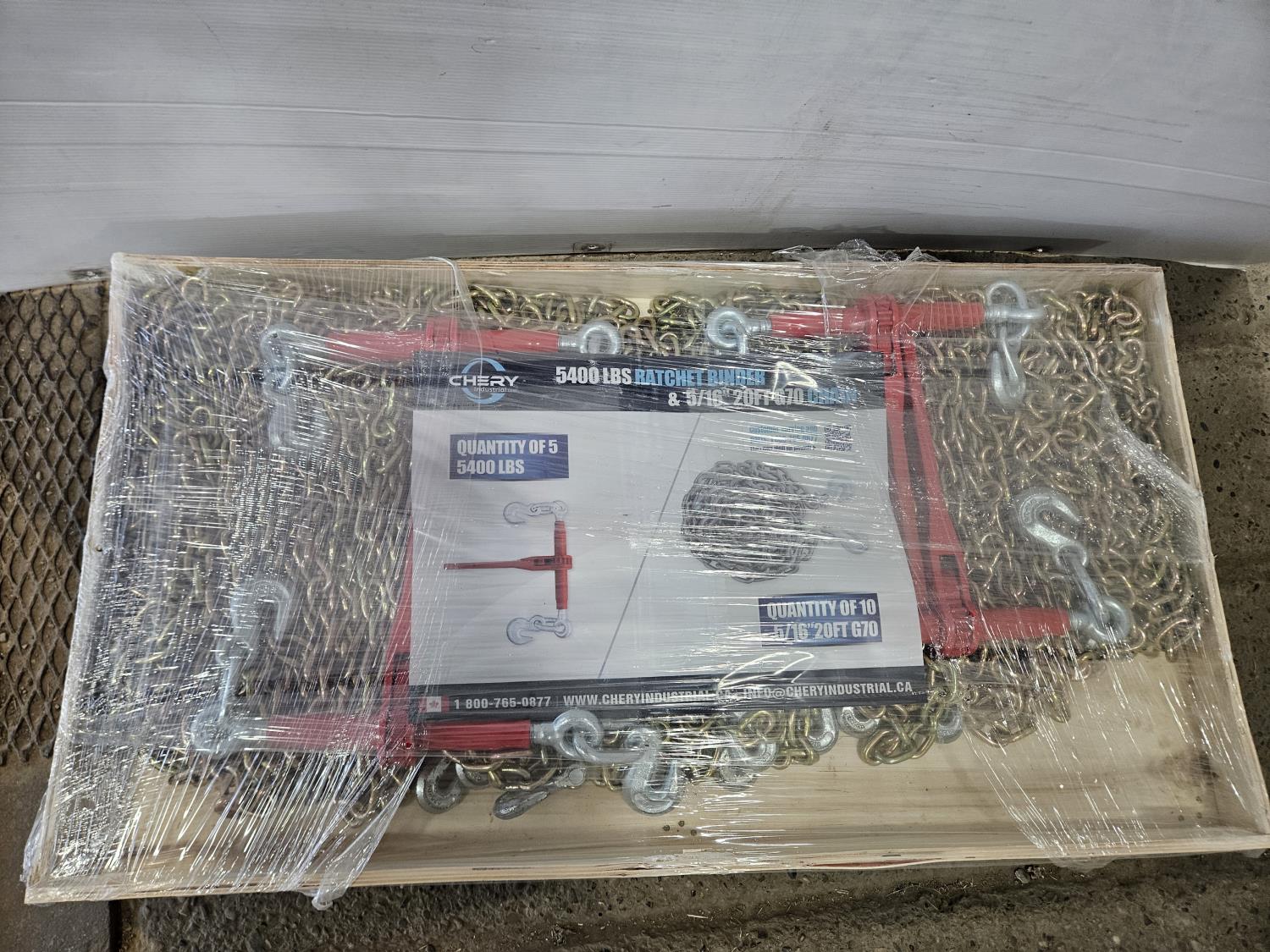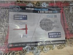 (5) ratchet binders 5400 lb capacity, (10) 20 ft 5/16 G70 Chain