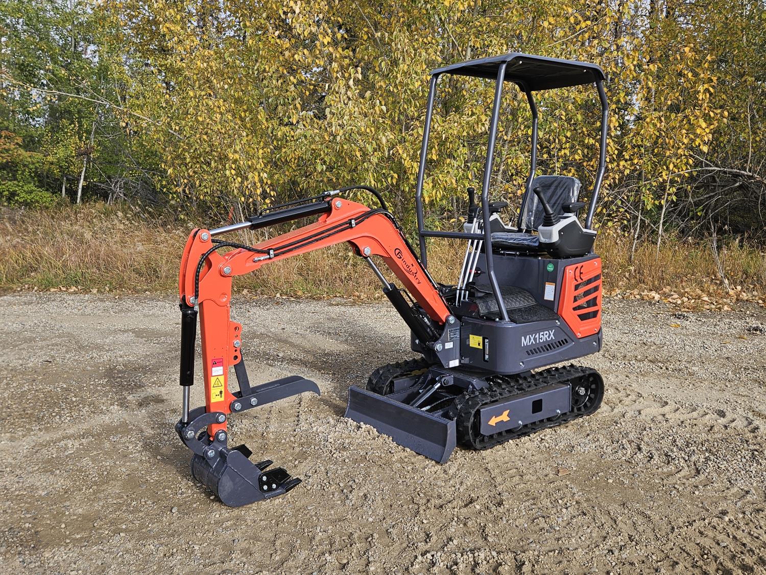 Open station, 420cc gas engine, 16 inch dig bucket, manual thumb, 32 inch stick, backfill blade, 7 inch rubber tracks