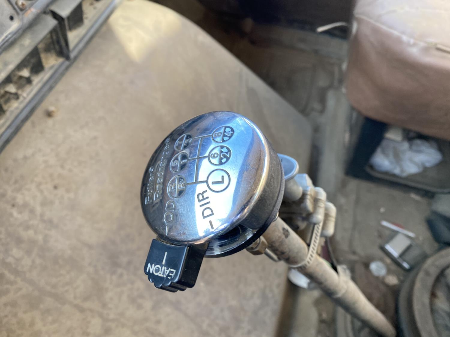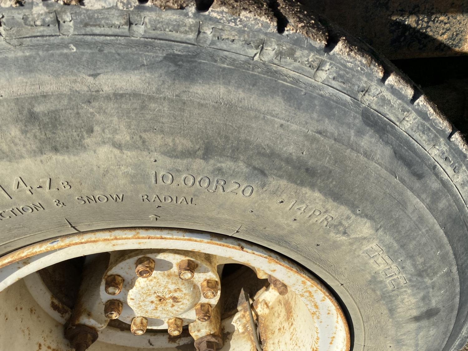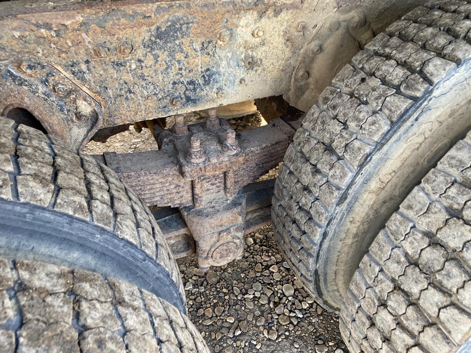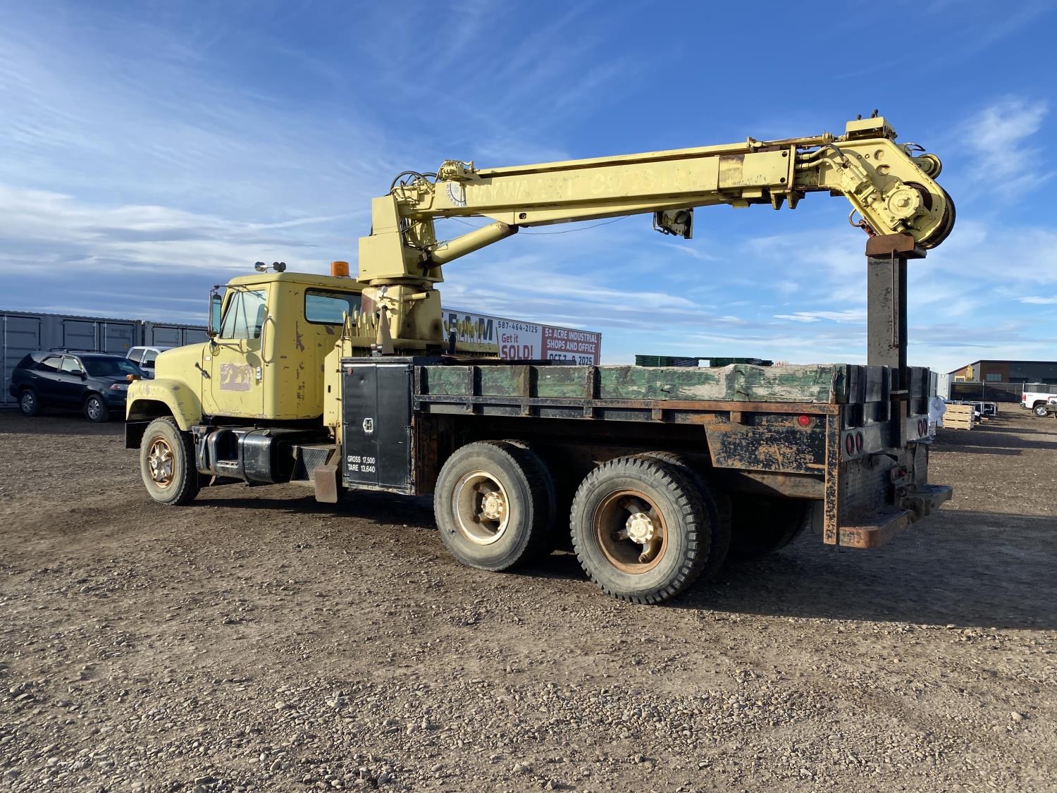 Detroit 6-71 6.9 L 6 cylinder engine, Eaton Fuller RTO-9513 13 speed manual transmission, 8 ft x 14 ft 3 inch deck, PTO pump, Pitman PC750 3 section 15 ft straight boom crane, outriggers, spring suspension, diff lock, 216 inch WB, 10-20 tires