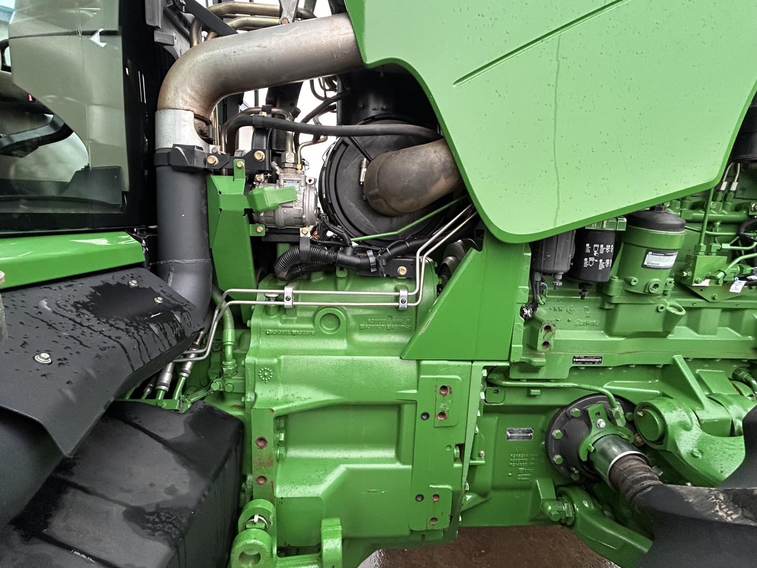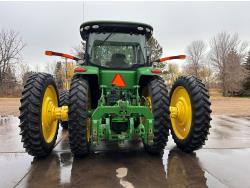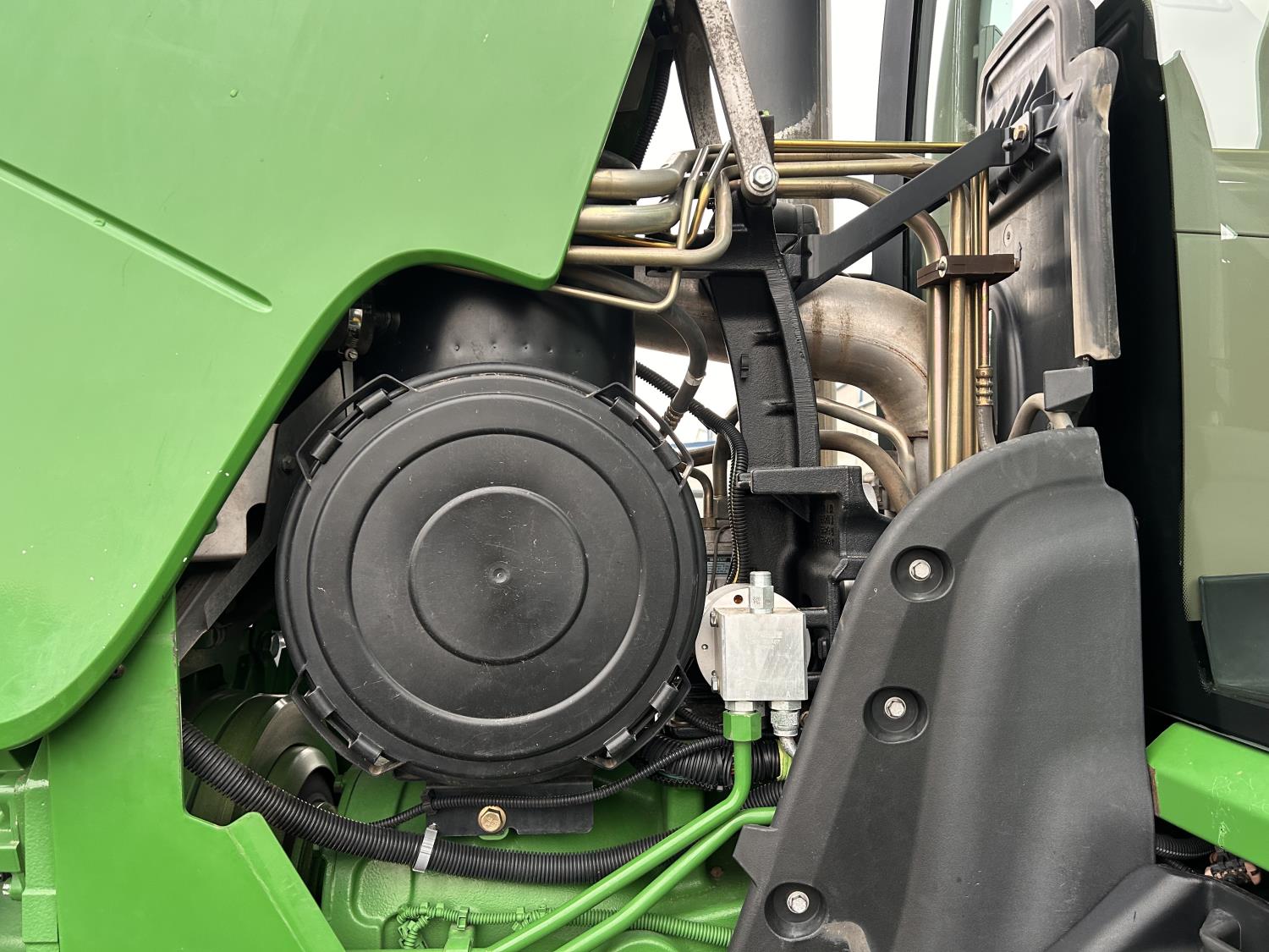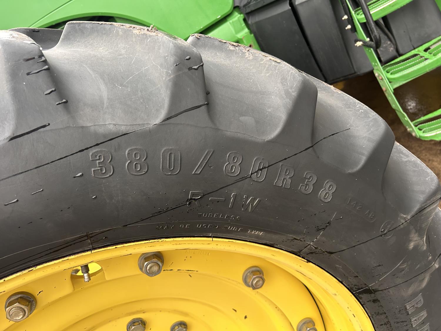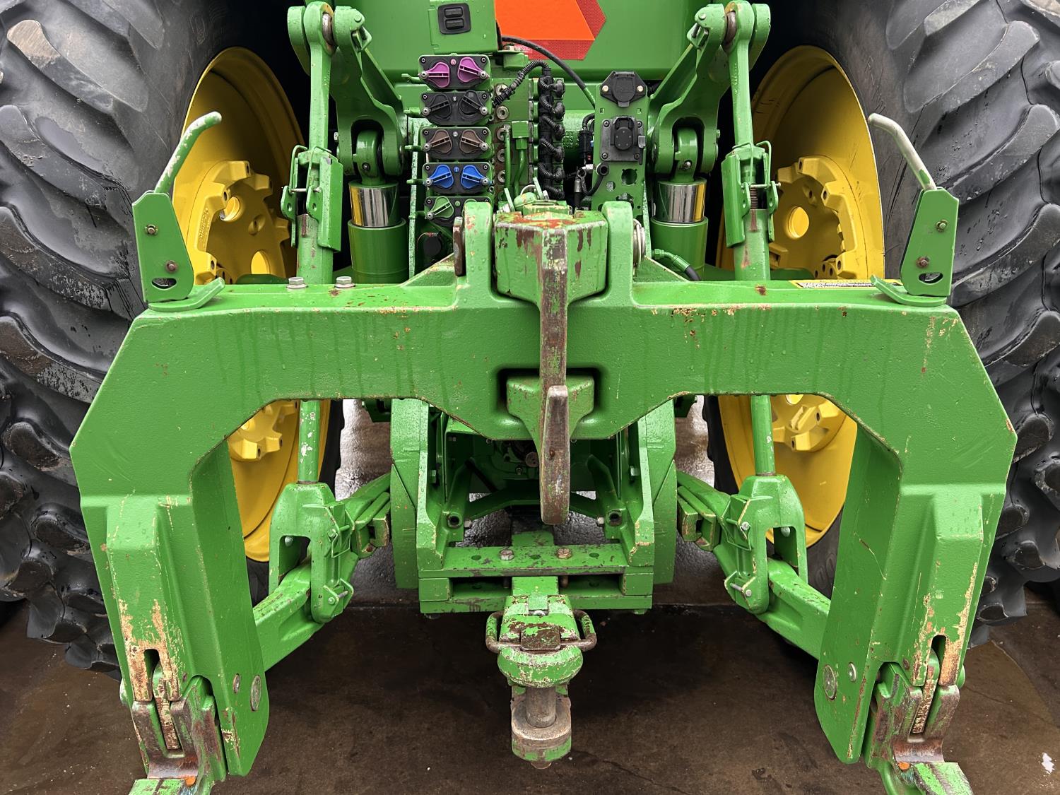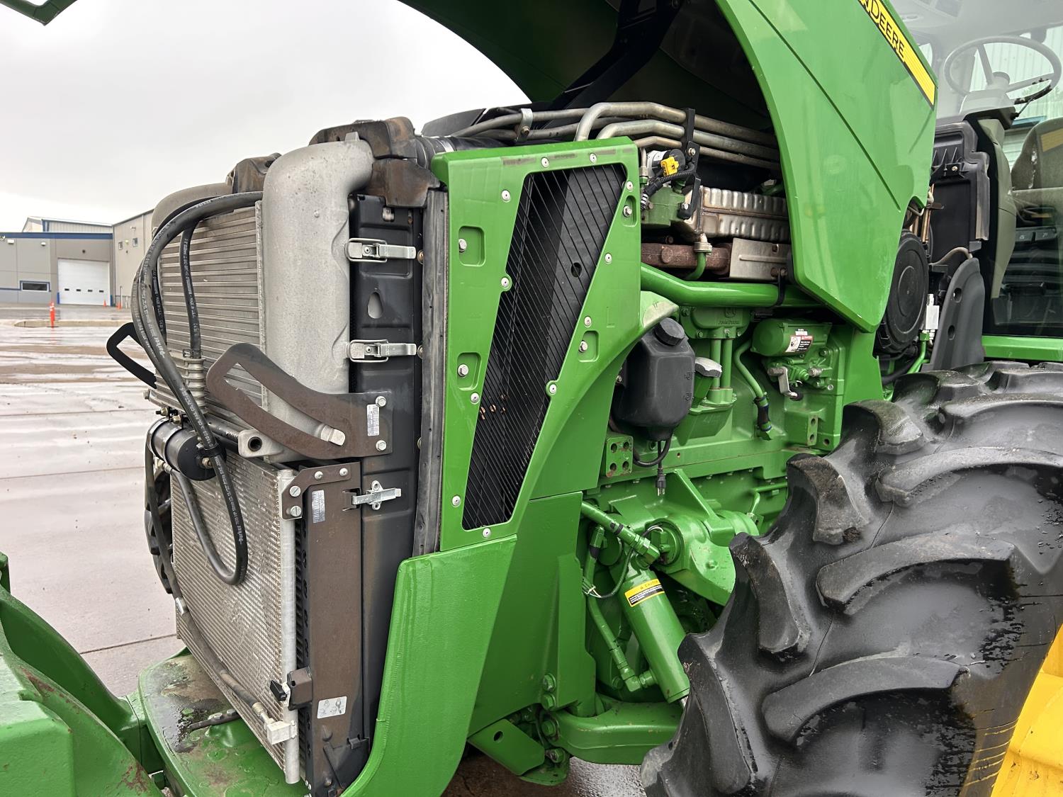 John Deere 9.0L 6 cylinder 320 HP, diesel engine, 263 PTO HP, IVT transmission, 60 GPM hydraulic pump, cab, front and rear differential lock, A/C, upgraded stereo, air ride seat, buddy seat, GPS ready, RH/Shuttle , 22 front weights, 47Kg per weight , 540/1000 / Big 1000 PTO, Q/A 3 point hitch, 3 point hitch exterior control, 5 rear hydraulic outlets, 1 rear auxilary hydraulic outlets, Power beyond and case drain Rear 3pt lift capacity 18,300 lbs , 380/80R38 dual front tires, 380/90R54 dual rear tires, 36" spacing setup for row crop. , Tractor had engine rebuild at 4167hrs, see work orders and service records attached