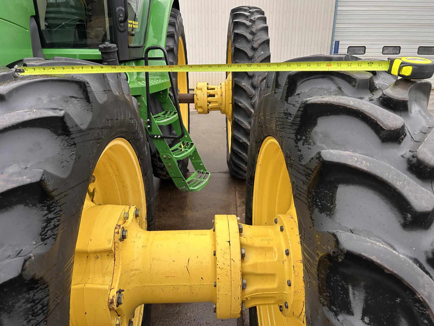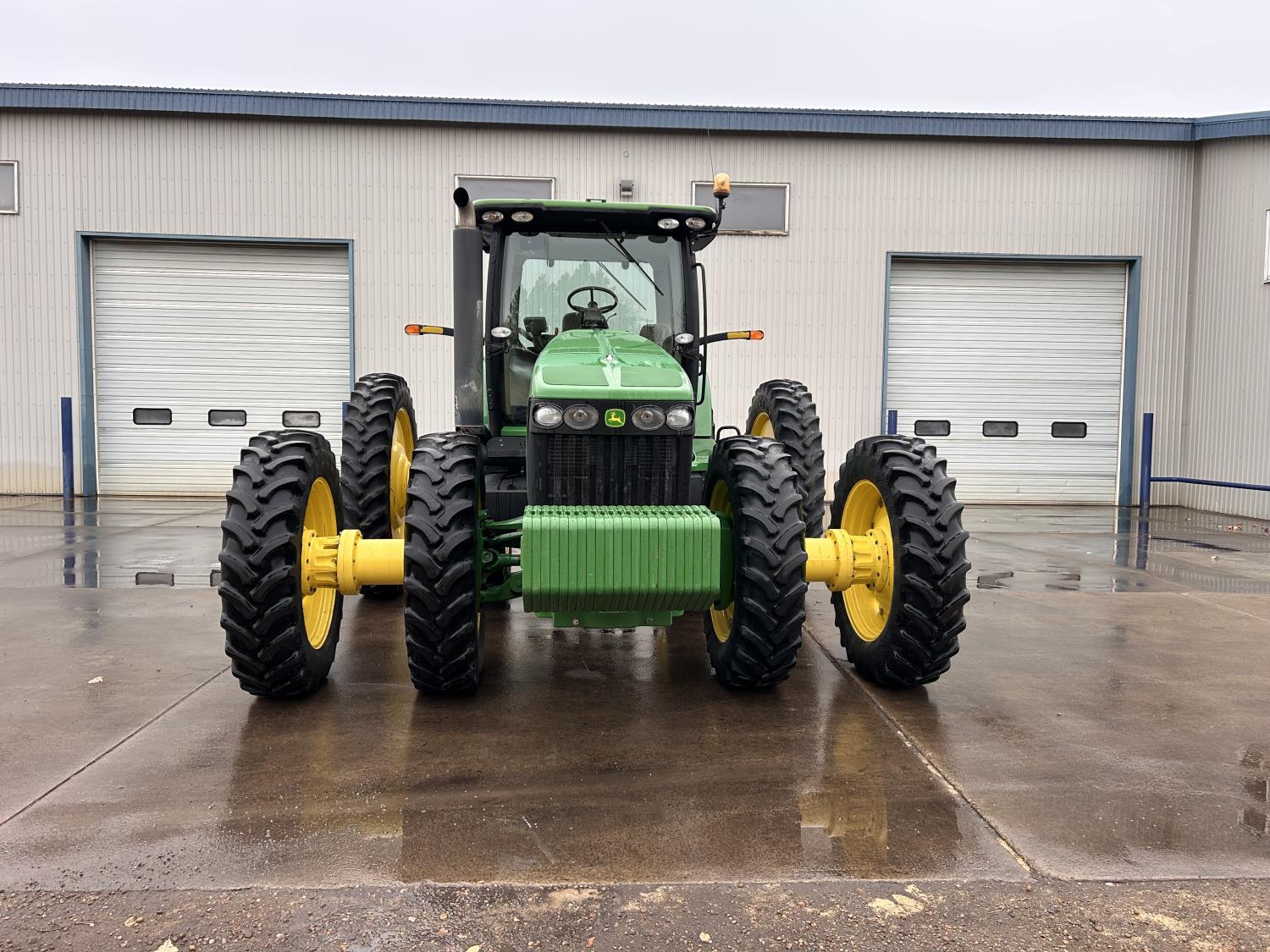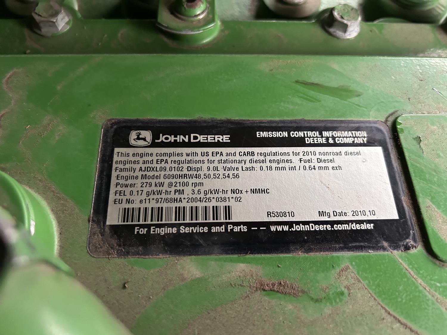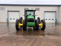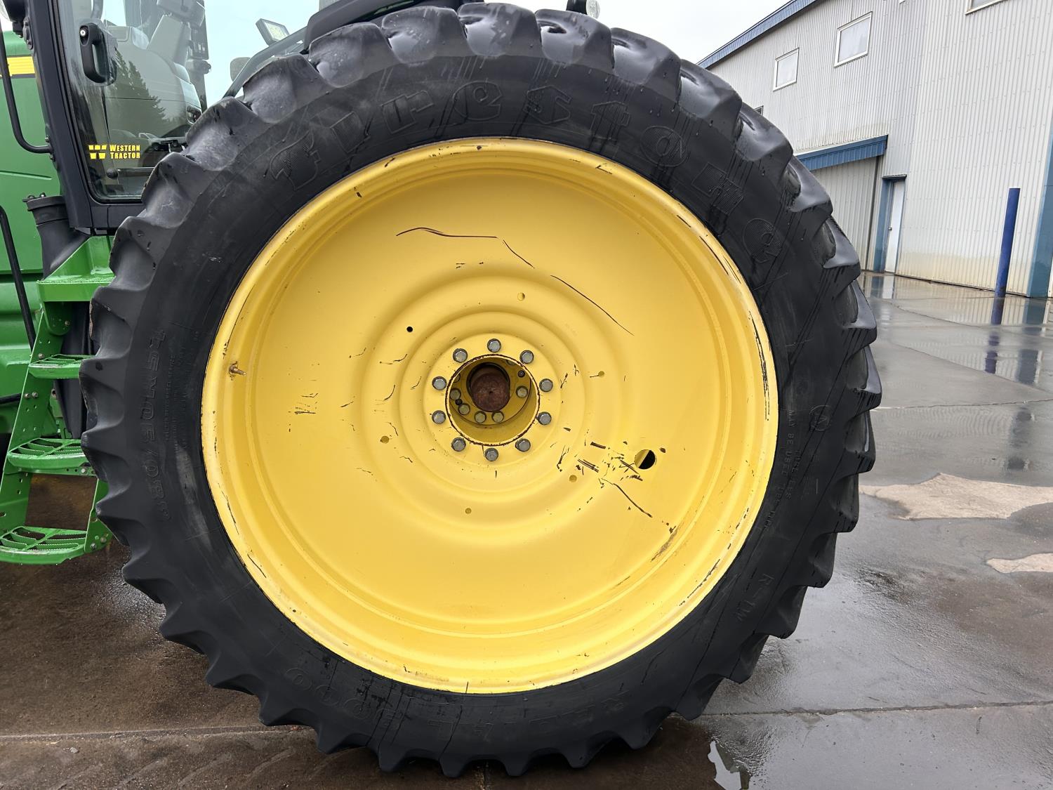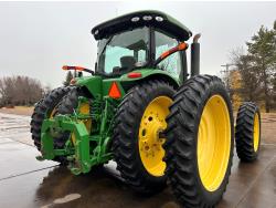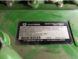 John Deere 9.0L 6 cylinder 320 HP, diesel engine, 263 PTO HP, IVT transmission, 60 GPM hydraulic pump, cab, front and rear differential lock, A/C, upgraded stereo, air ride seat, buddy seat, GPS ready, RH/Shuttle , 22 front weights, 47Kg per weight , 540/1000 / Big 1000 PTO, Q/A 3 point hitch, 3 point hitch exterior control, 5 rear hydraulic outlets, 1 rear auxilary hydraulic outlets, Power beyond and case drain Rear 3pt lift capacity 18,300 lbs , 380/80R38 dual front tires, 380/90R54 dual rear tires, 36" spacing setup for row crop. , Tractor had engine rebuild at 4167hrs, see work orders and service records attached
