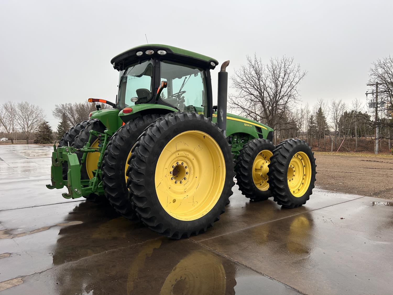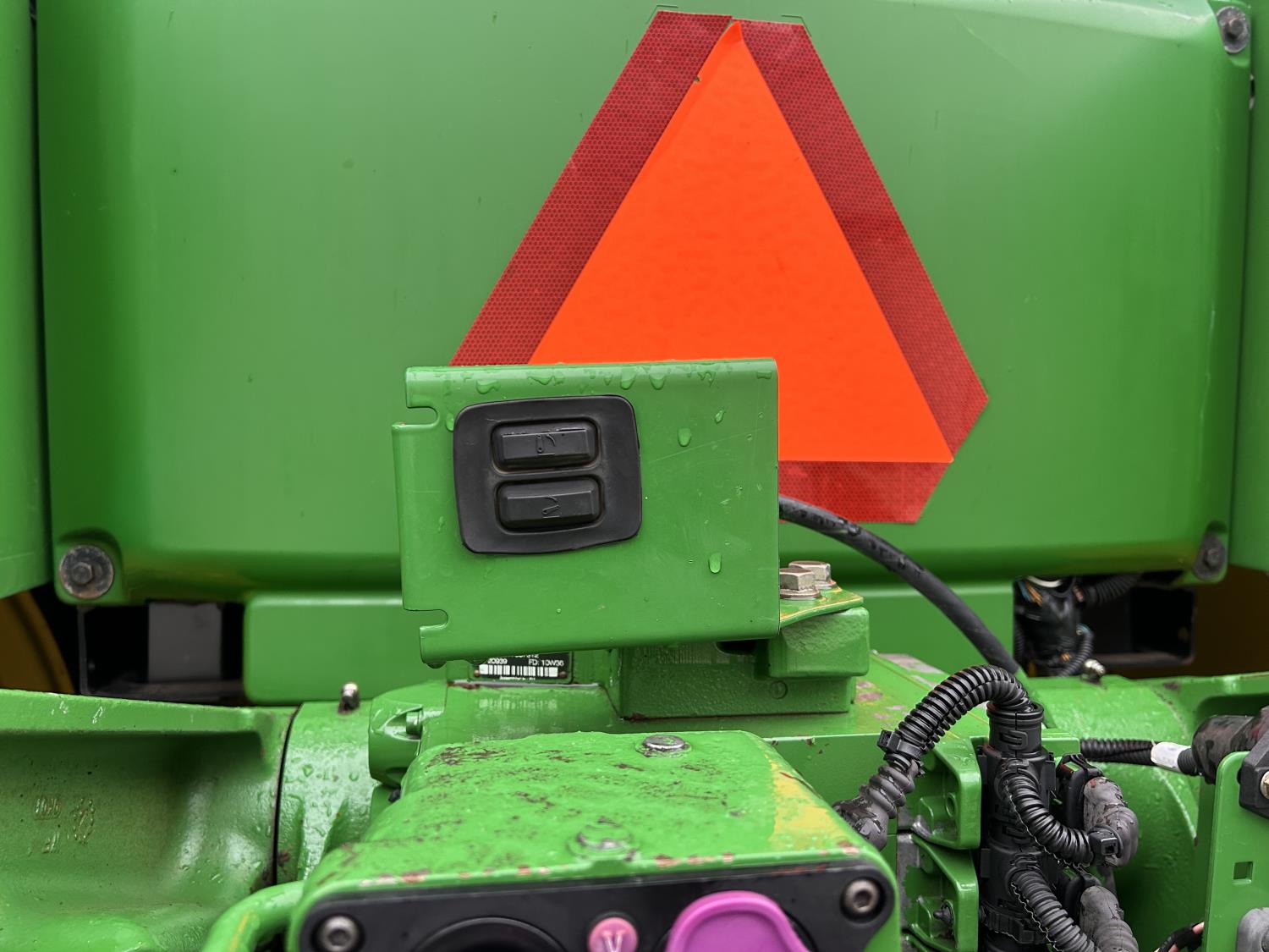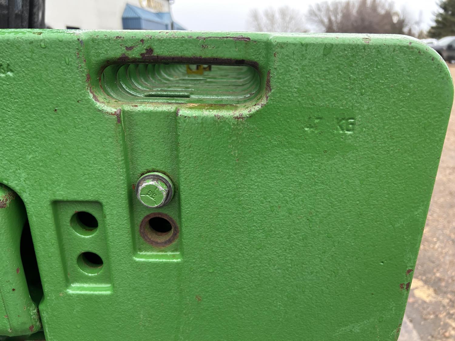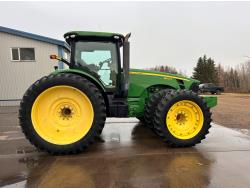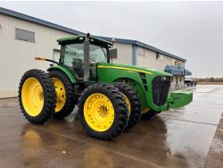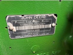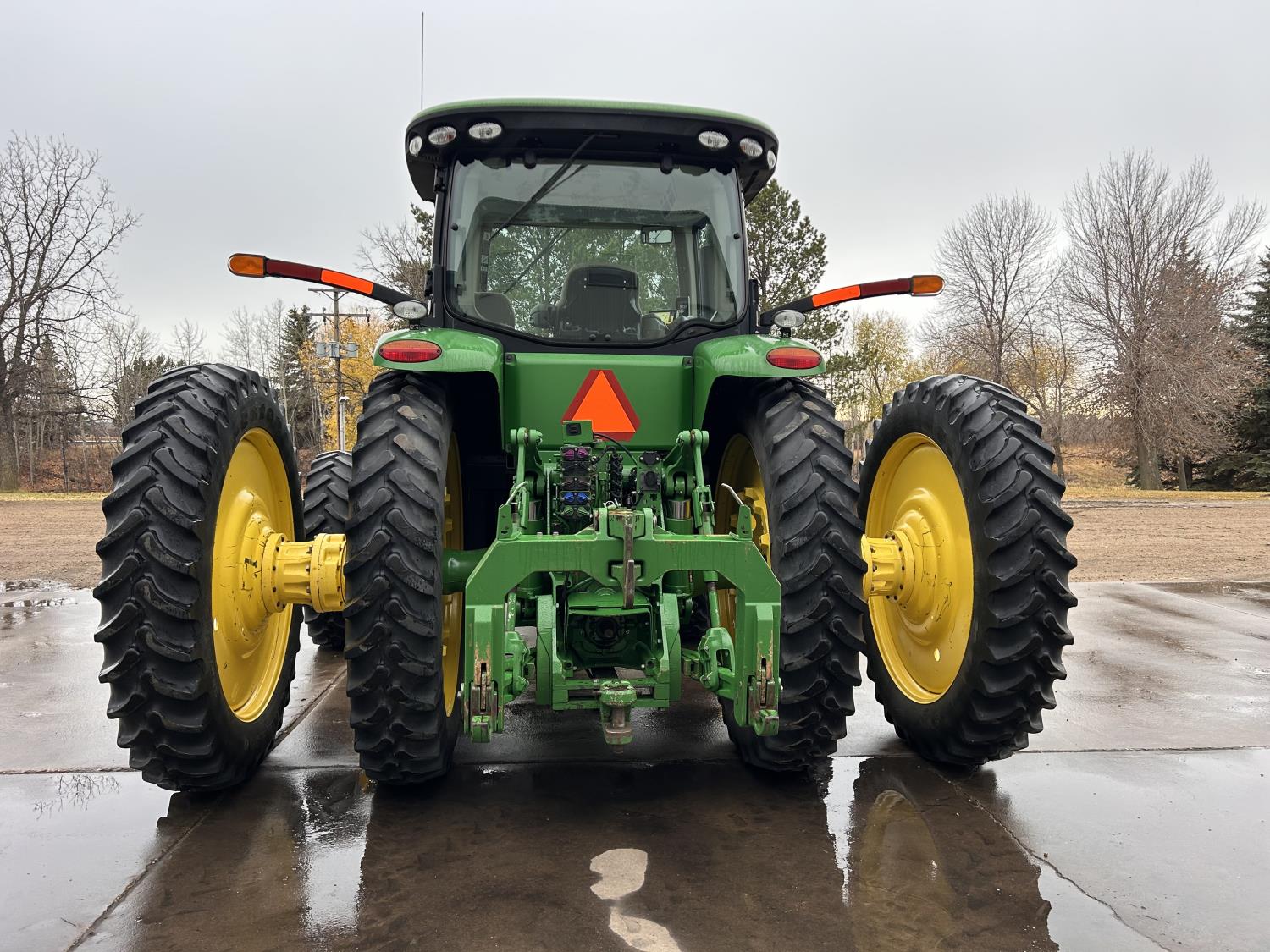 John Deere 9.0L 6 cylinder 320 HP, diesel engine, 263 PTO HP, IVT transmission, 60 GPM hydraulic pump, cab, front and rear differential lock, A/C, upgraded stereo, air ride seat, buddy seat, GPS ready, RH/Shuttle , 22 front weights, 47Kg per weight , 540/1000 / Big 1000 PTO, Q/A 3 point hitch, 3 point hitch exterior control, 5 rear hydraulic outlets, 1 rear auxilary hydraulic outlets, Power beyond and case drain Rear 3pt lift capacity 18,300 lbs , 380/80R38 dual front tires, 380/90R54 dual rear tires, 36" spacing setup for row crop. , Tractor had engine rebuild at 4167hrs, see work orders and service records attached