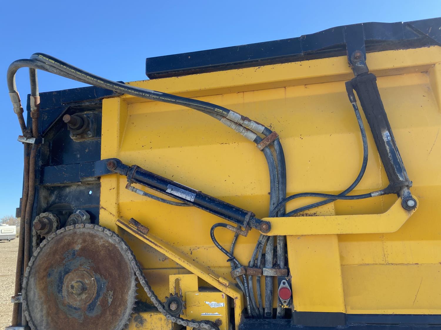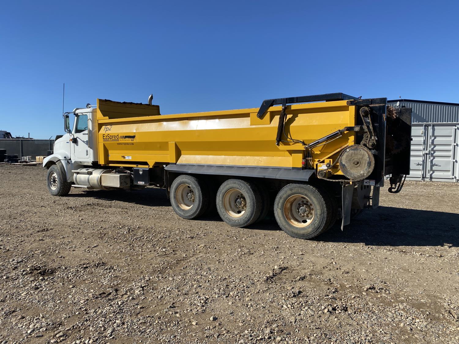 MaxForce A430 12.4 L 6 cylinder 430 HP engine, Eaton Fuller 9LL speed manual transmission, engine brake, engine block heater, A/C, cruise control, air ride driver seat, FSI EZ Spread 23 ft L box, 82 inch W x 48 inch T side walls, steel floor, double floor chain unload, double horizontal beaters, PTO pump, air ride suspension, 16,000 lb front axle, 53,000 lb rear axles, full lockers, 288 inch WB, aluminum front wheels, 385/65R22.5 front tires, 11R22.5 rear tires