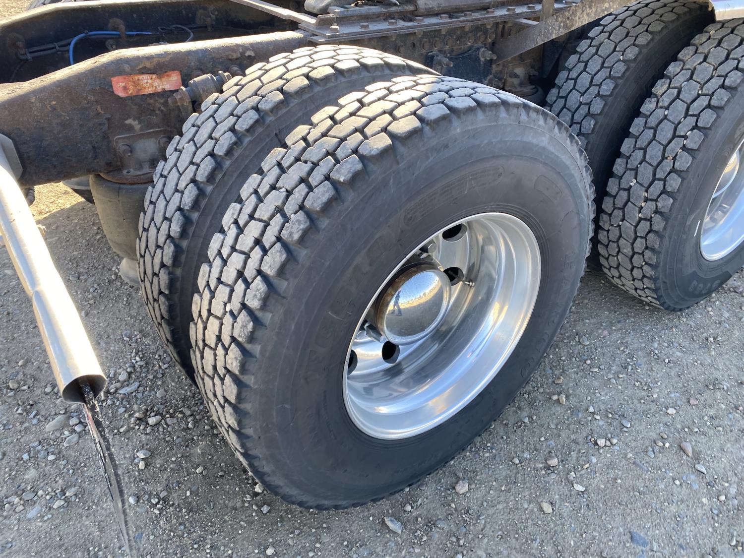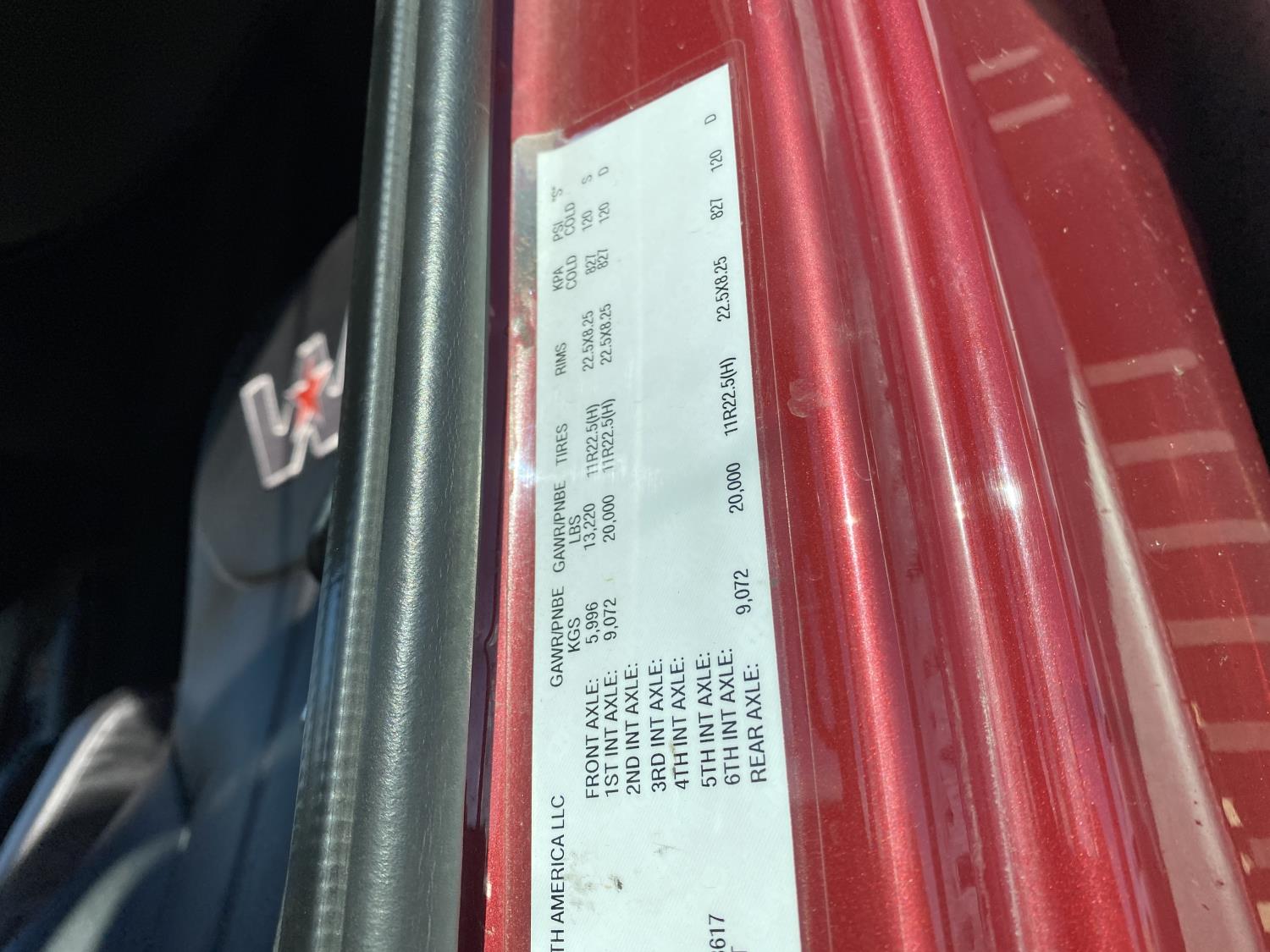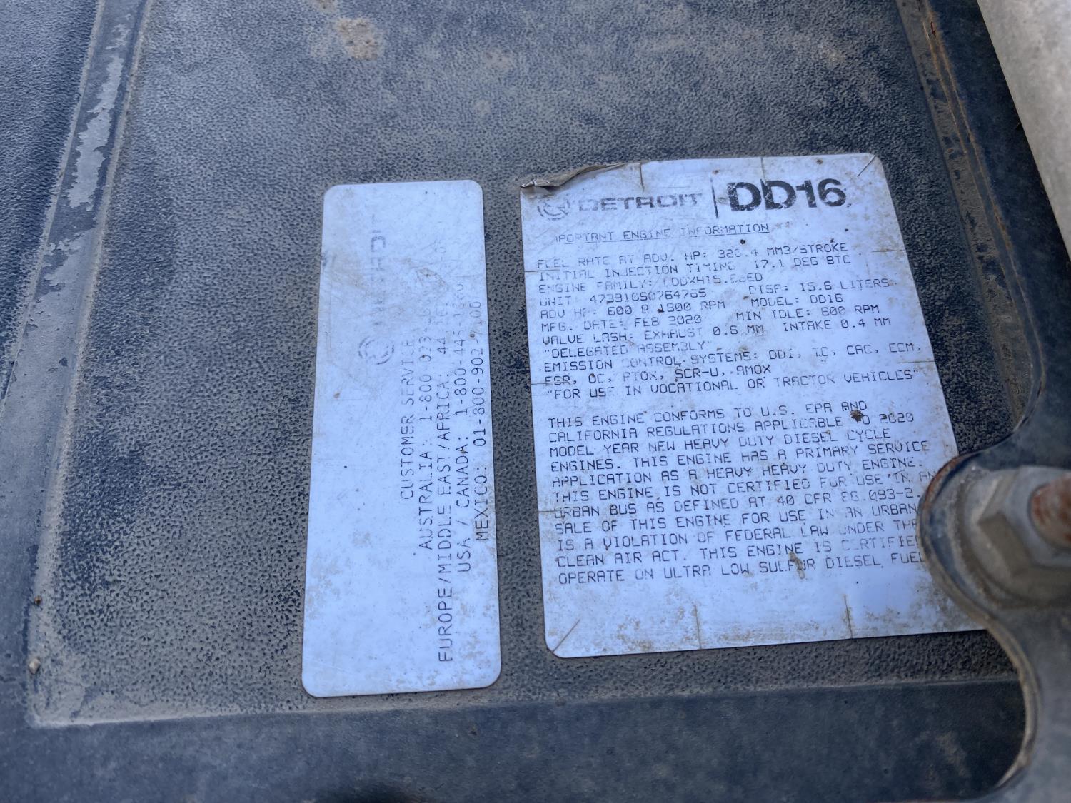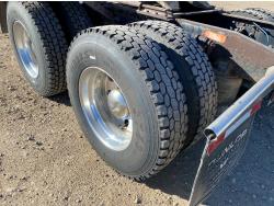 Detroit DD16 15.6 L 6 cylinder 600 HP engine, DEF required, engine brake, engine block heater, Eaton Fuller 18 speed manual transmission, Webasto cab heater, mid rise 72 inch sleeper, fridge, A/C, cruise control, leather interior, air ride seats, CB radio, air ride cab, air ride suspension, 13,220 lb front axle, 40,000 lb rear axles, full lockers, 262 inch WB, all aluminum wheels, 11R22.5 tires