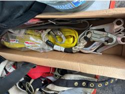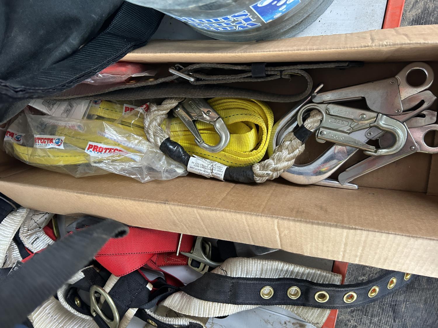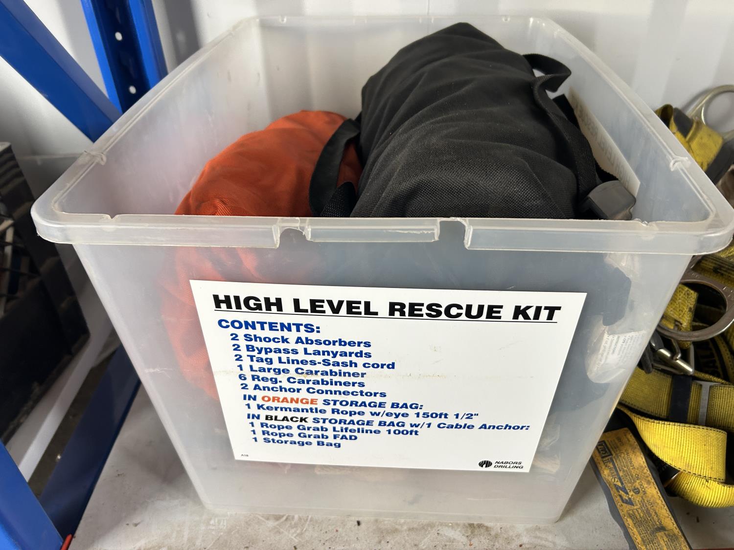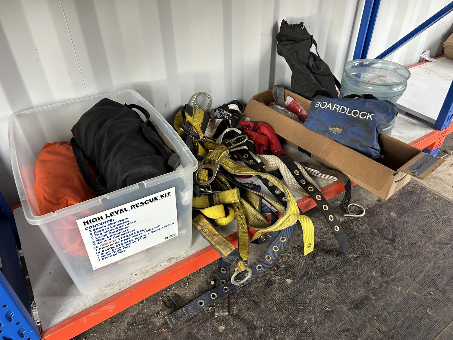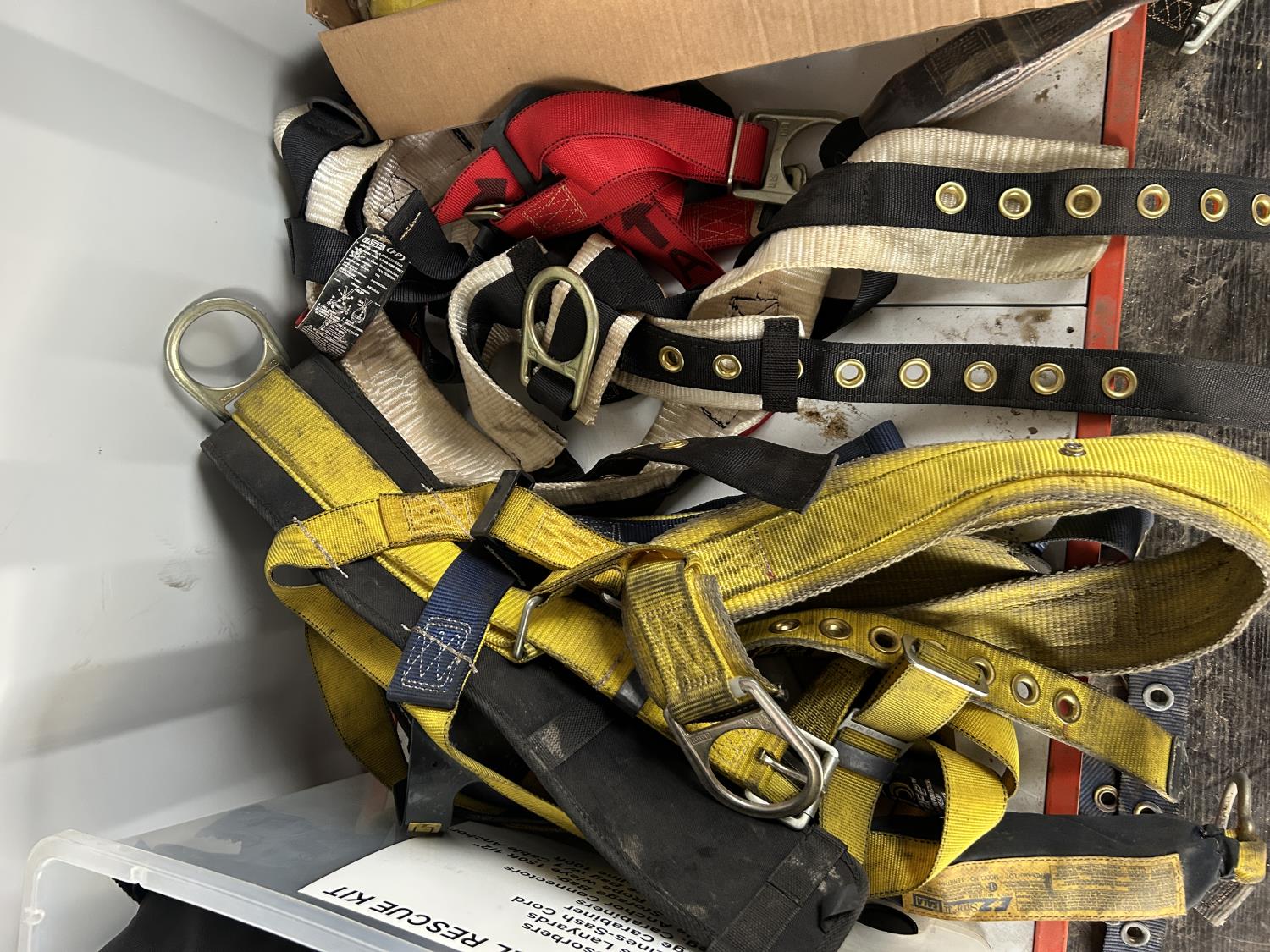 contents (2) shock absorbers (2) bypass lanyards (2) taglines-sash cord (1) large carabiner (6) reg carabiners (2) anchor connectors (1) kermantle150 ft 1/2 inch rope w/ eye (1) cable anchor (1) 100 ft rope grab lifeline (1) rope grab FAD (1) storage bag w/ qty of miscellaneous safety harnesses