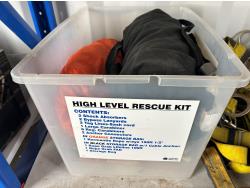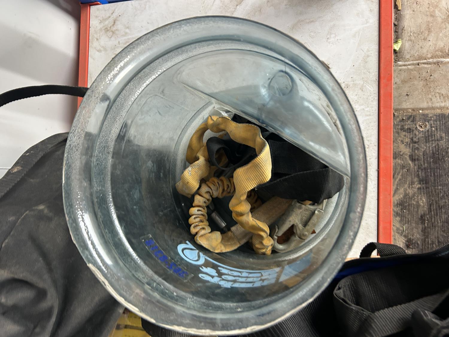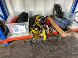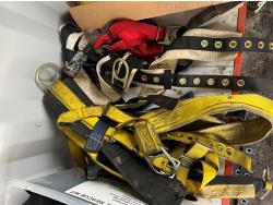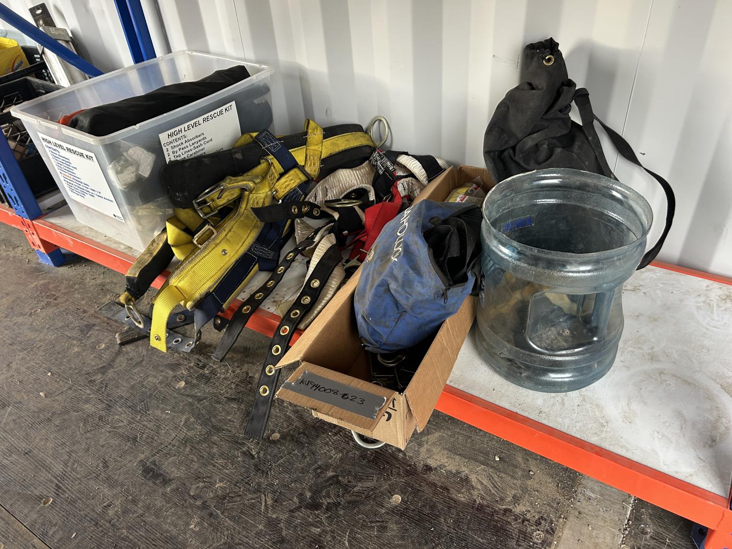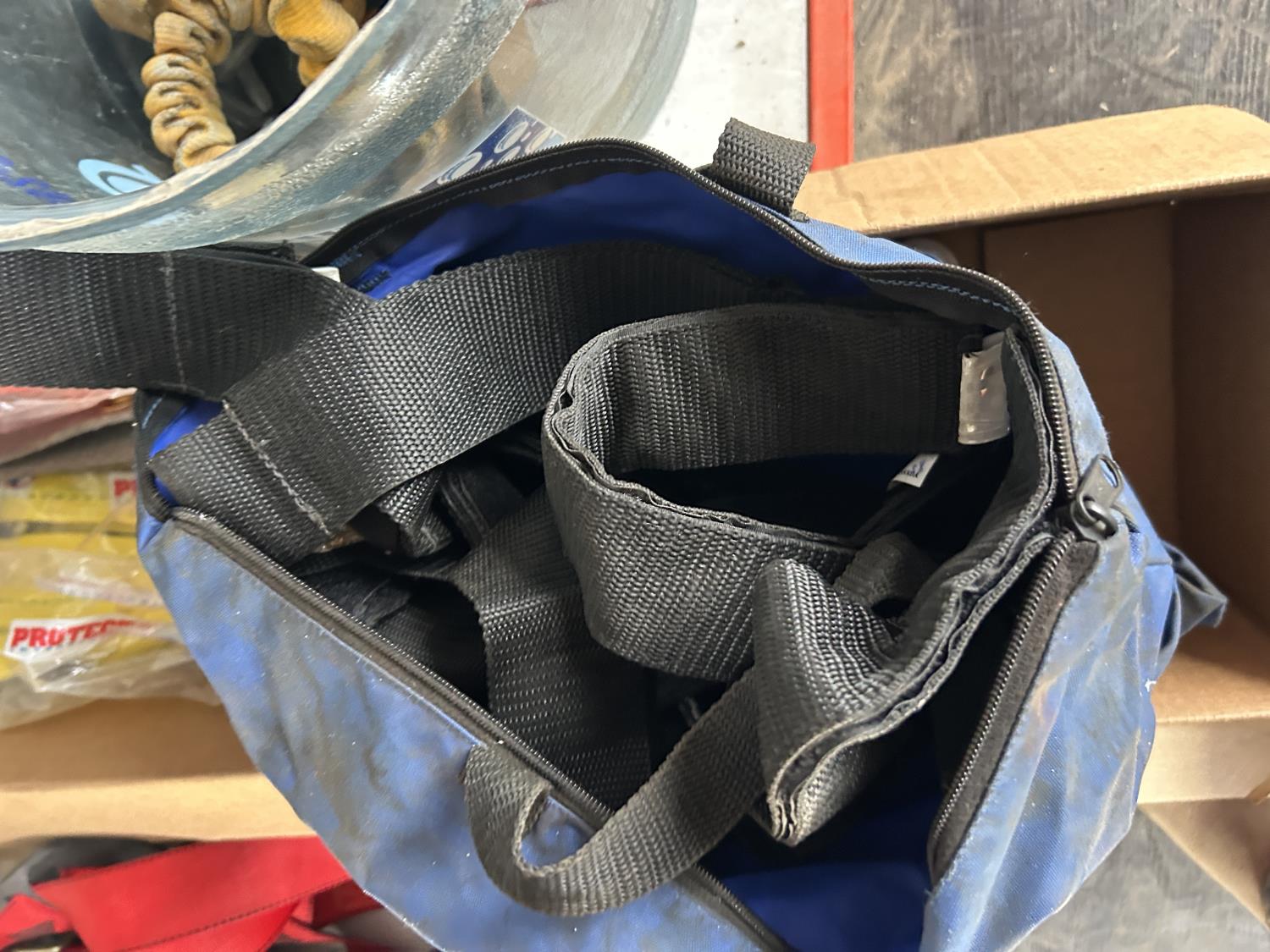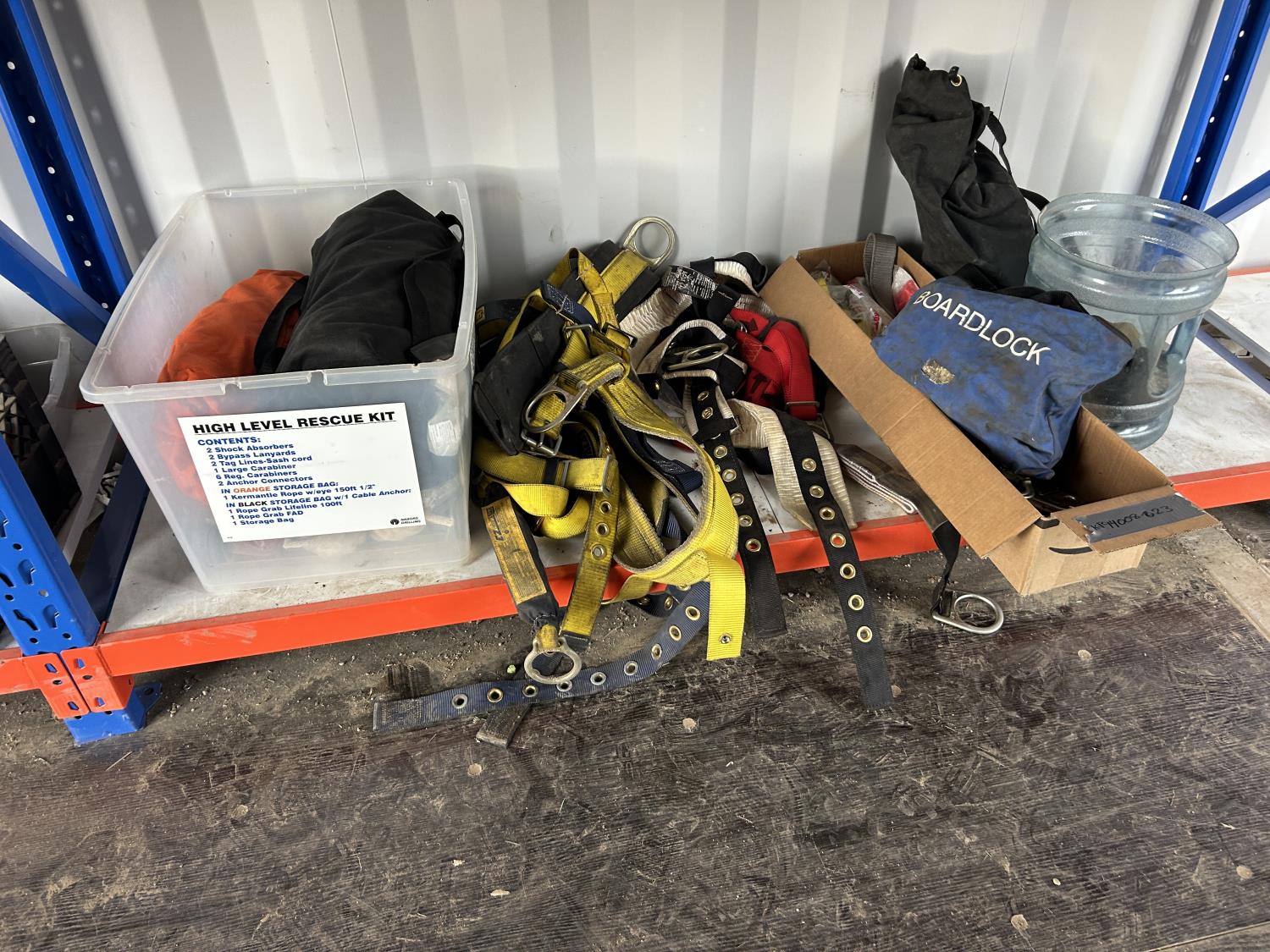 contents (2) shock absorbers (2) bypass lanyards (2) taglines-sash cord (1) large carabiner (6) reg carabiners (2) anchor connectors (1) kermantle150 ft 1/2 inch rope w/ eye (1) cable anchor (1) 100 ft rope grab lifeline (1) rope grab FAD (1) storage bag w/ qty of miscellaneous safety harnesses
