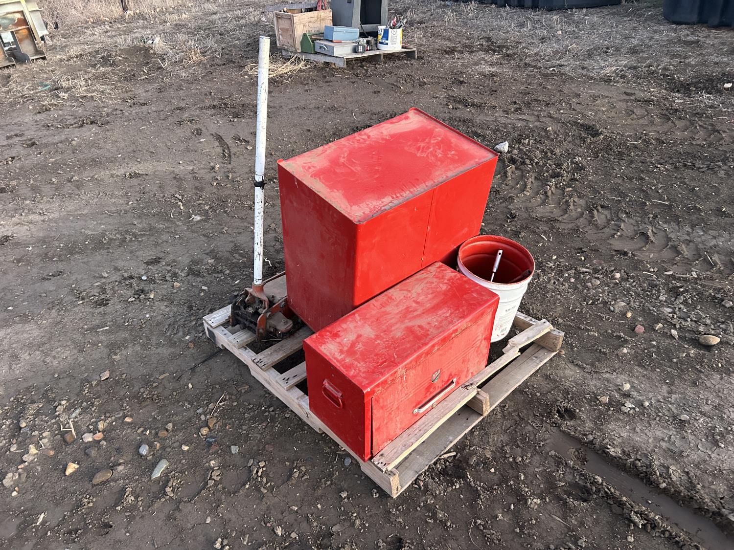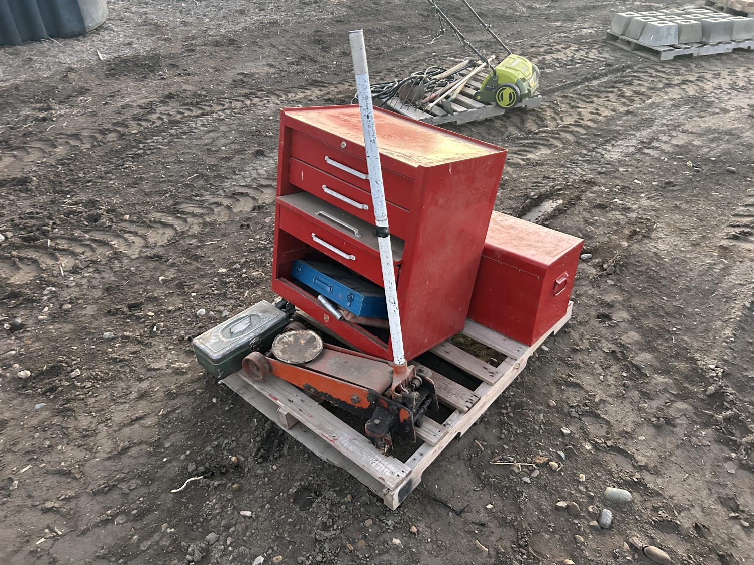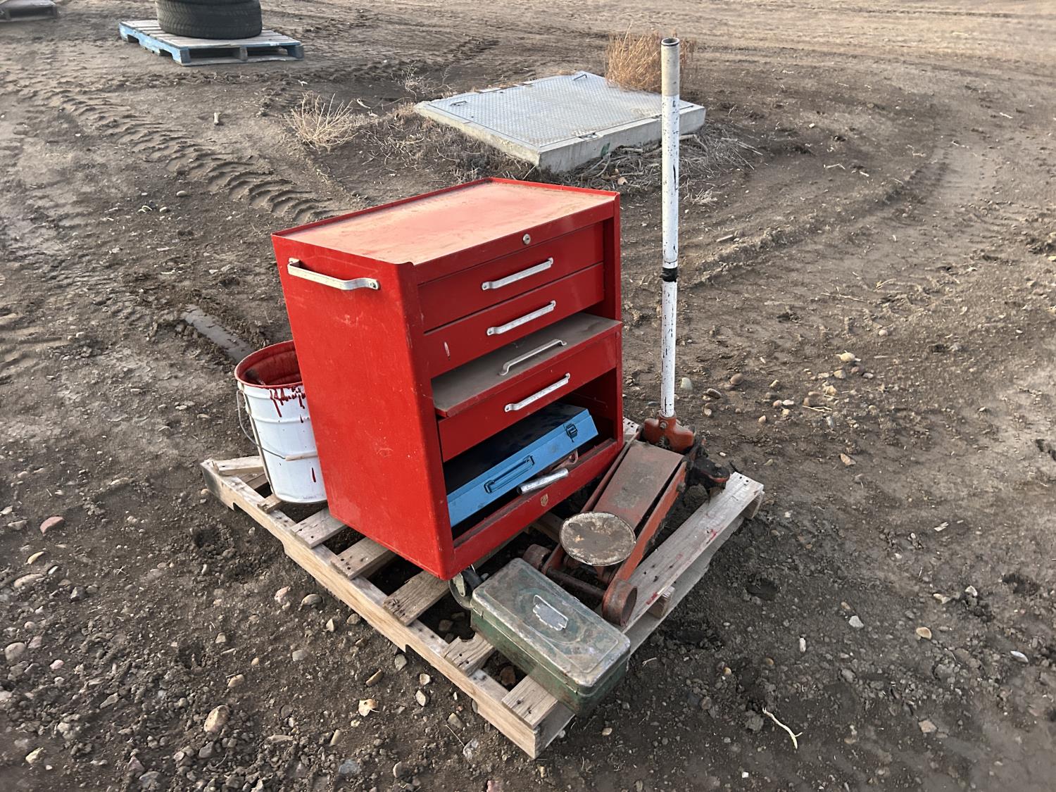 includes floor jack, miscellaneous wrenches. 4 drawer toolbox 24 inch wide 36 inch tall