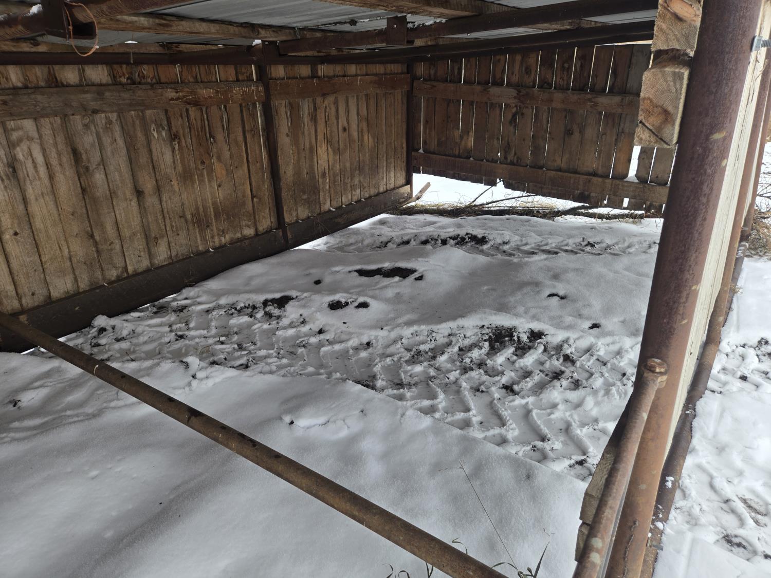 68 inch high in front, 63 inch high in back, pipe frame, wood sides, metal roof