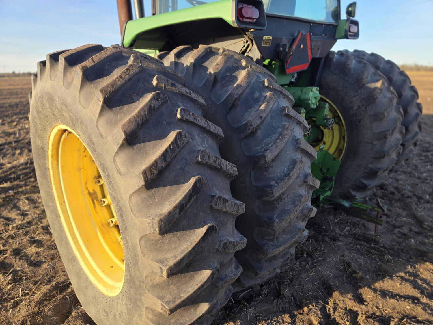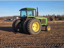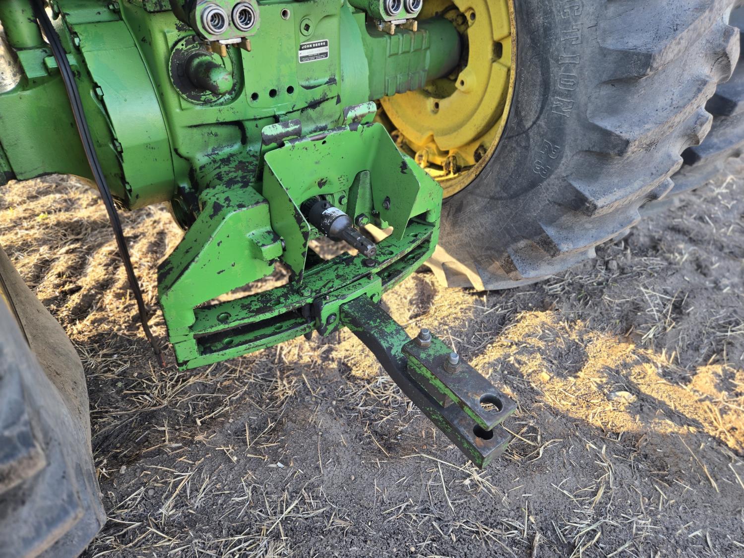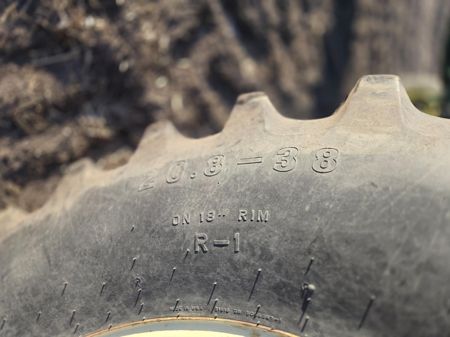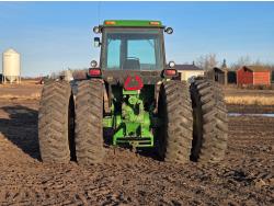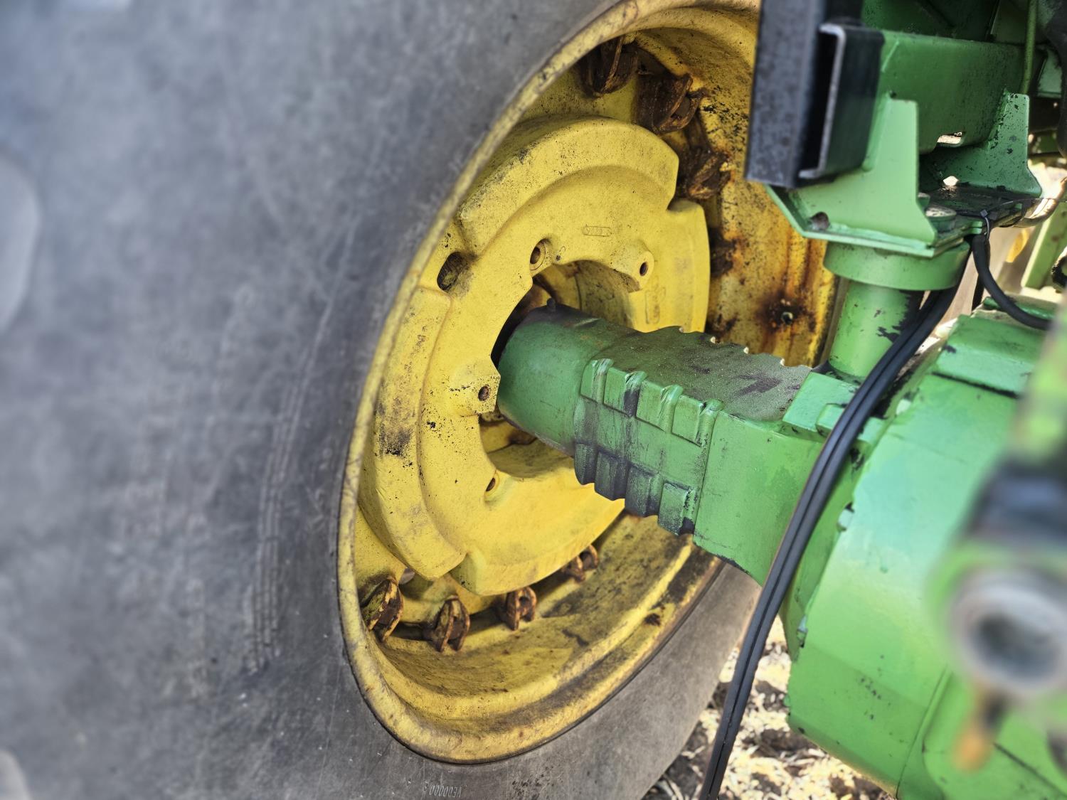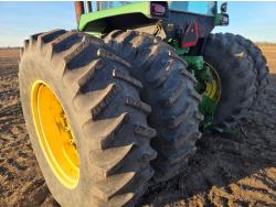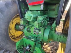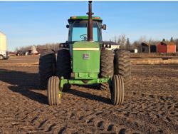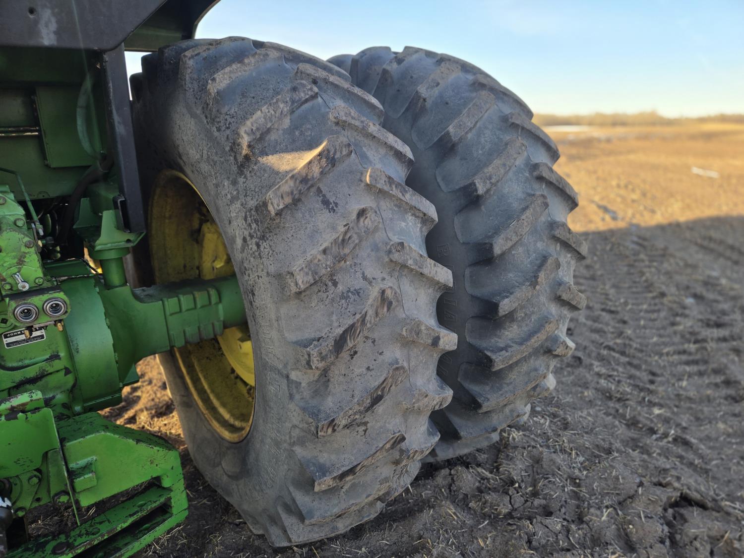 John Deere 7.6 L 6 cylinder engine, 180 PTO HP, 8 speed power shift transmission, cab, rear differential lock, A/C, radio, Big 1000 PTO, 2 rear hydraulic outlets, rear wheel weights, 11.00-16 front tires, 20.8-38 rear tires, factory duals