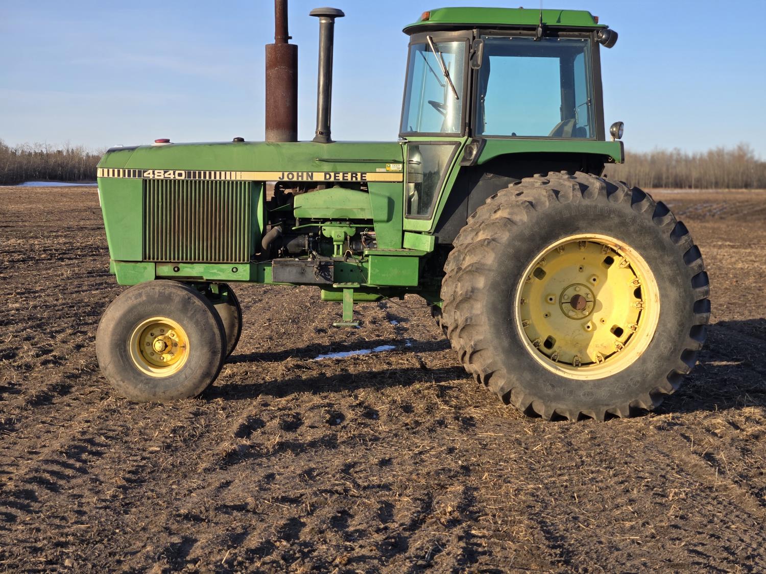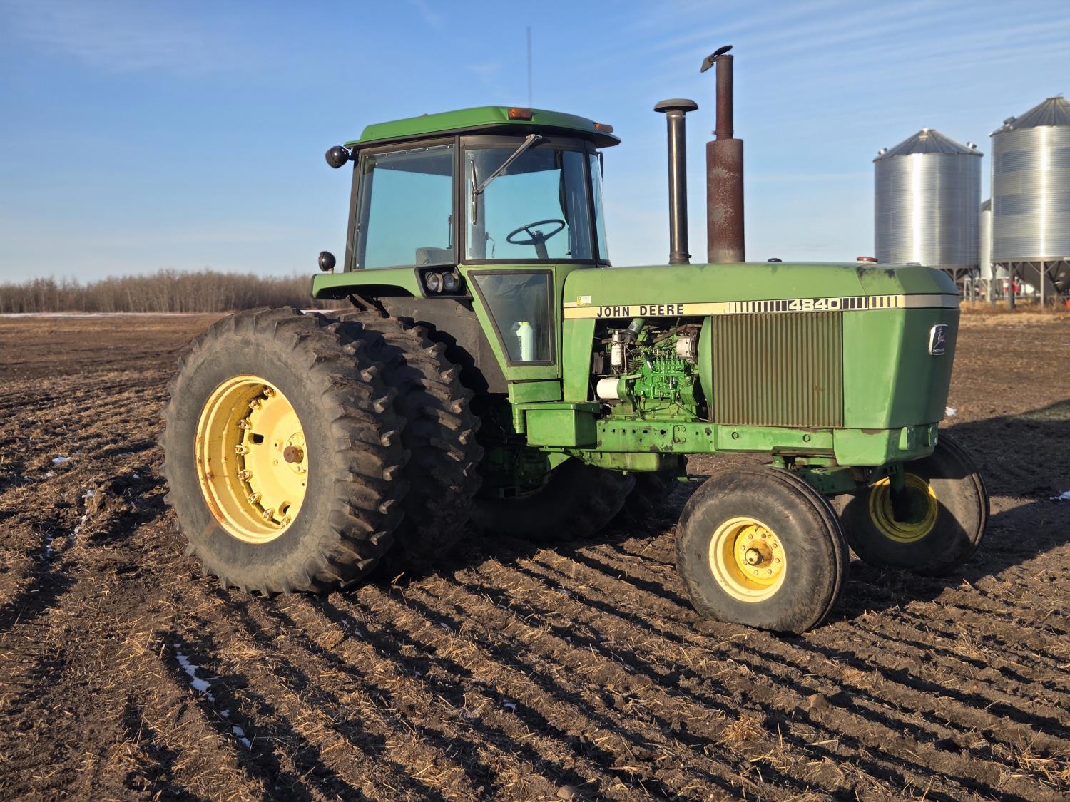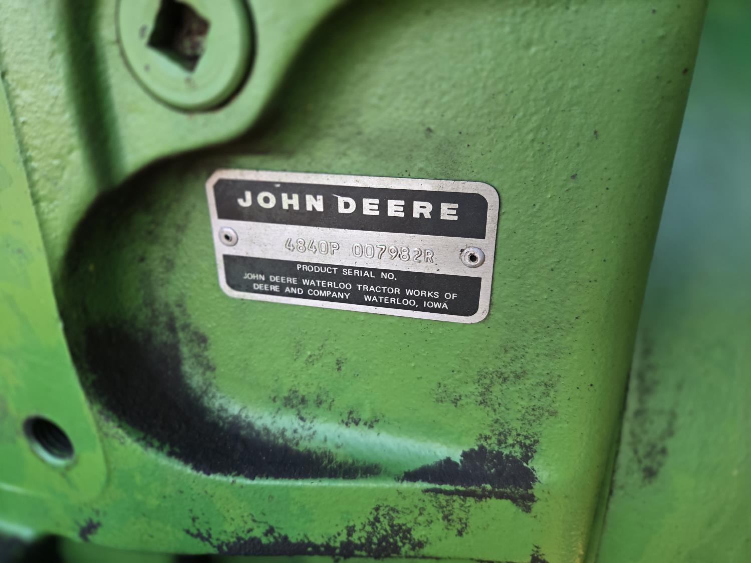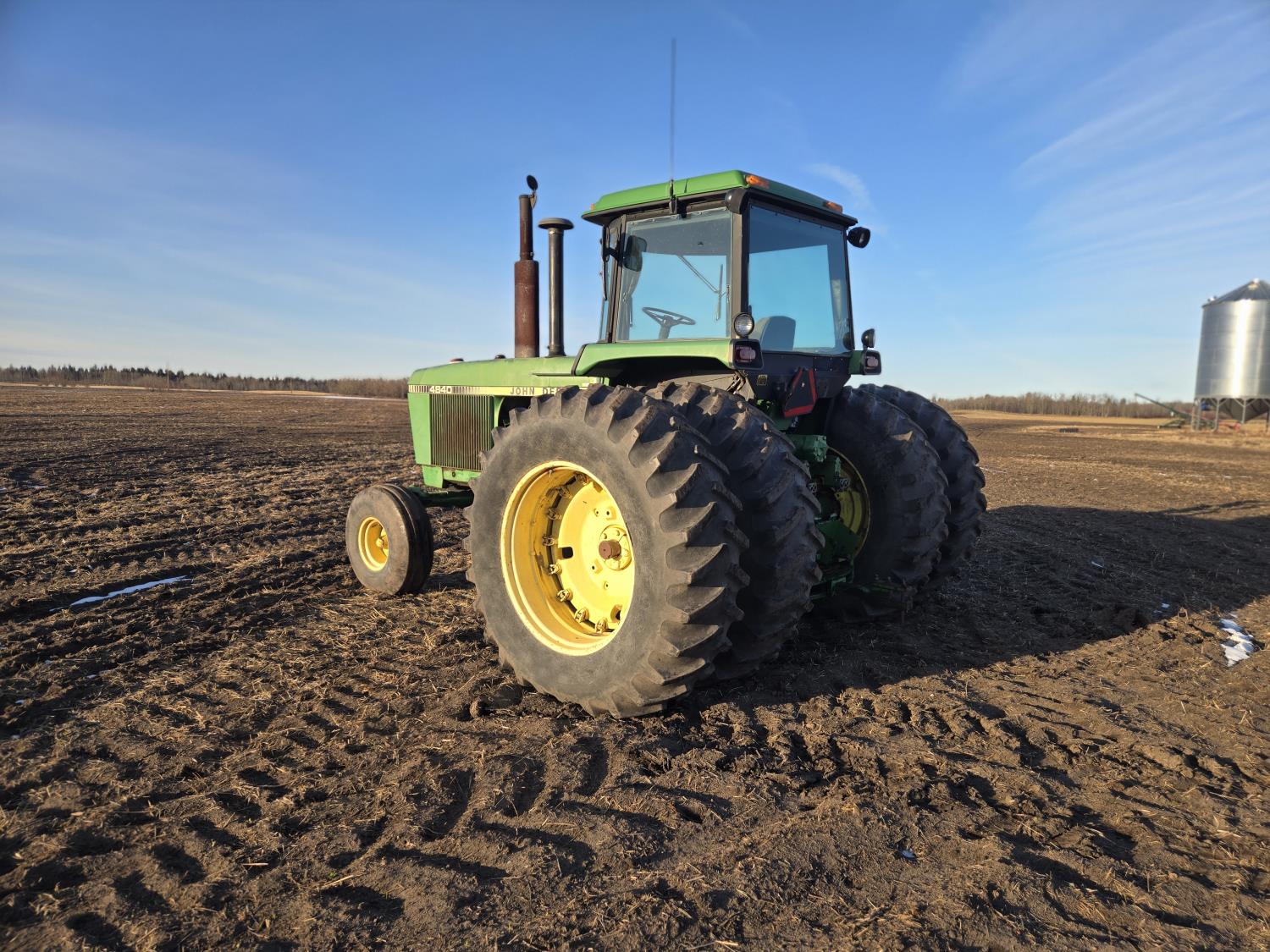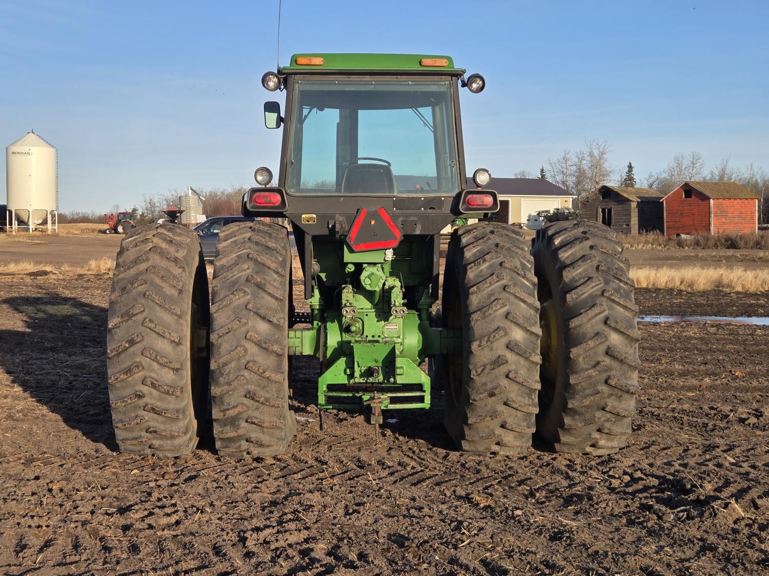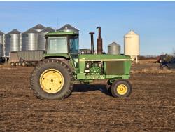 John Deere 7.6 L 6 cylinder engine, 180 PTO HP, 8 speed power shift transmission, cab, rear differential lock, A/C, radio, Big 1000 PTO, 2 rear hydraulic outlets, rear wheel weights, 11.00-16 front tires, 20.8-38 rear tires, factory duals