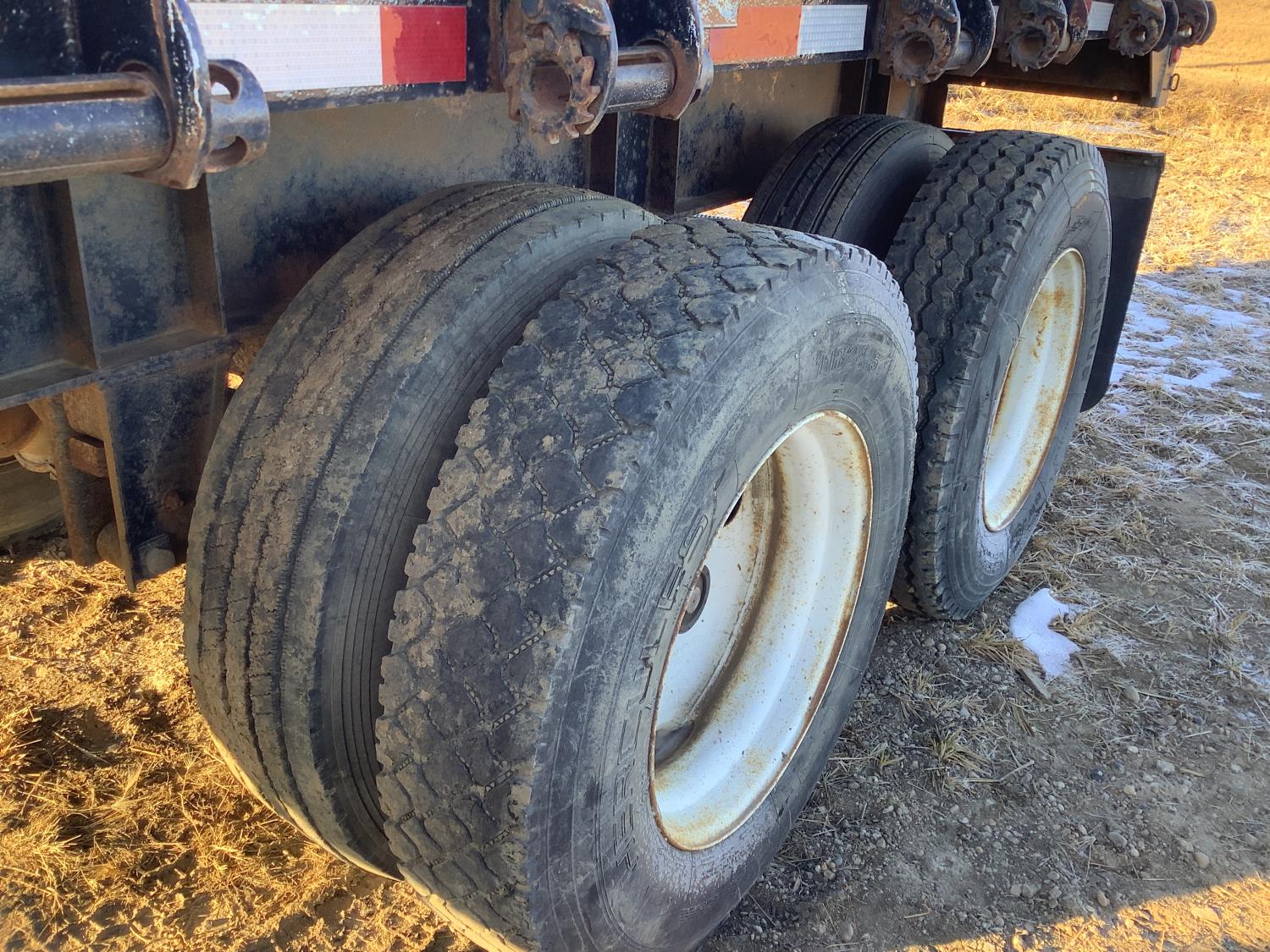 wood deck, stake pockets, rub rails, 3 bar winch's, J hooks, tool box's, spring suspension, 11R24.5 tires