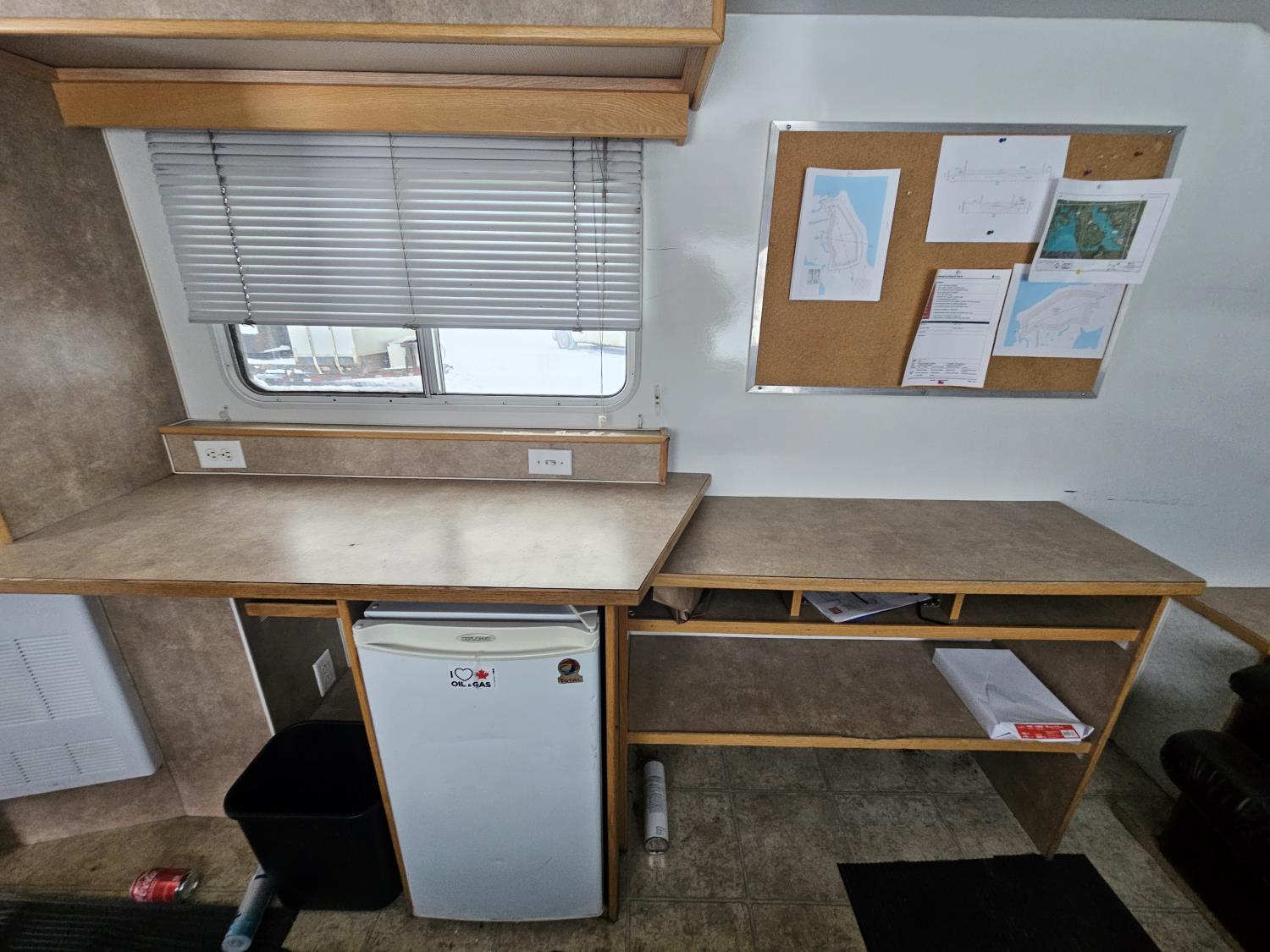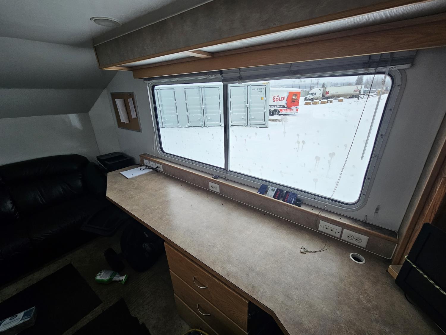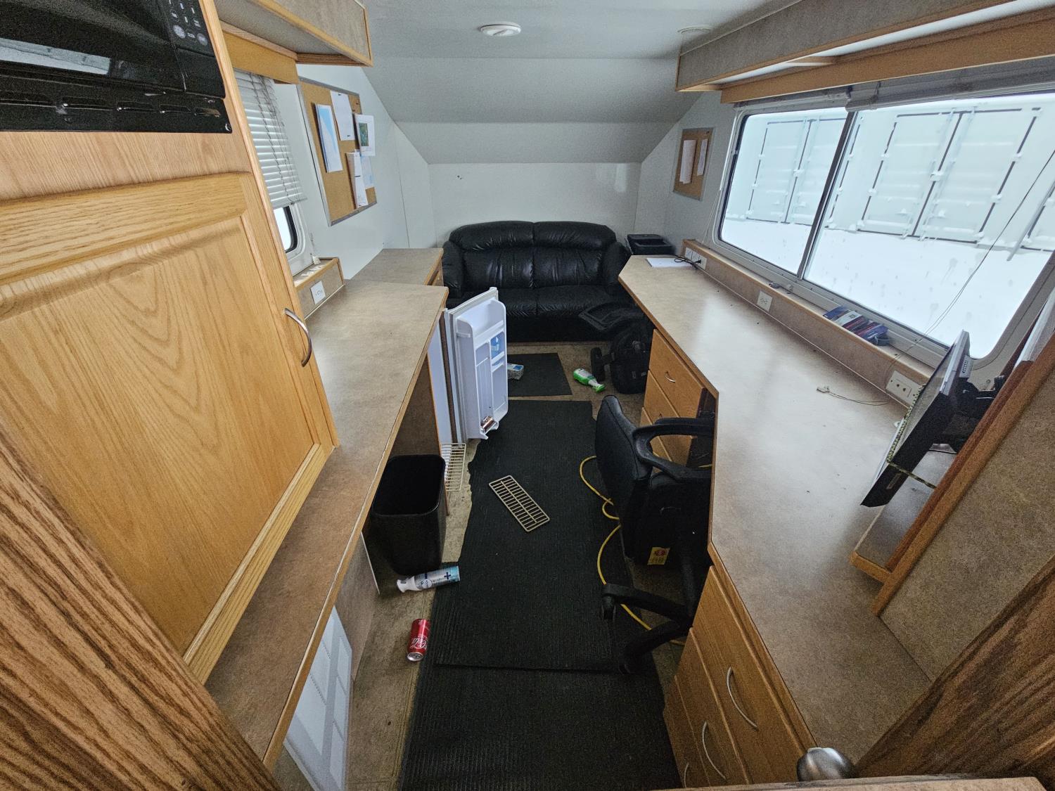 5500 lb axles, torsion suspension, bathroom, heater, (2) office chairs, leather sofa, fridge, A/C, storage, 235/85R16 tires