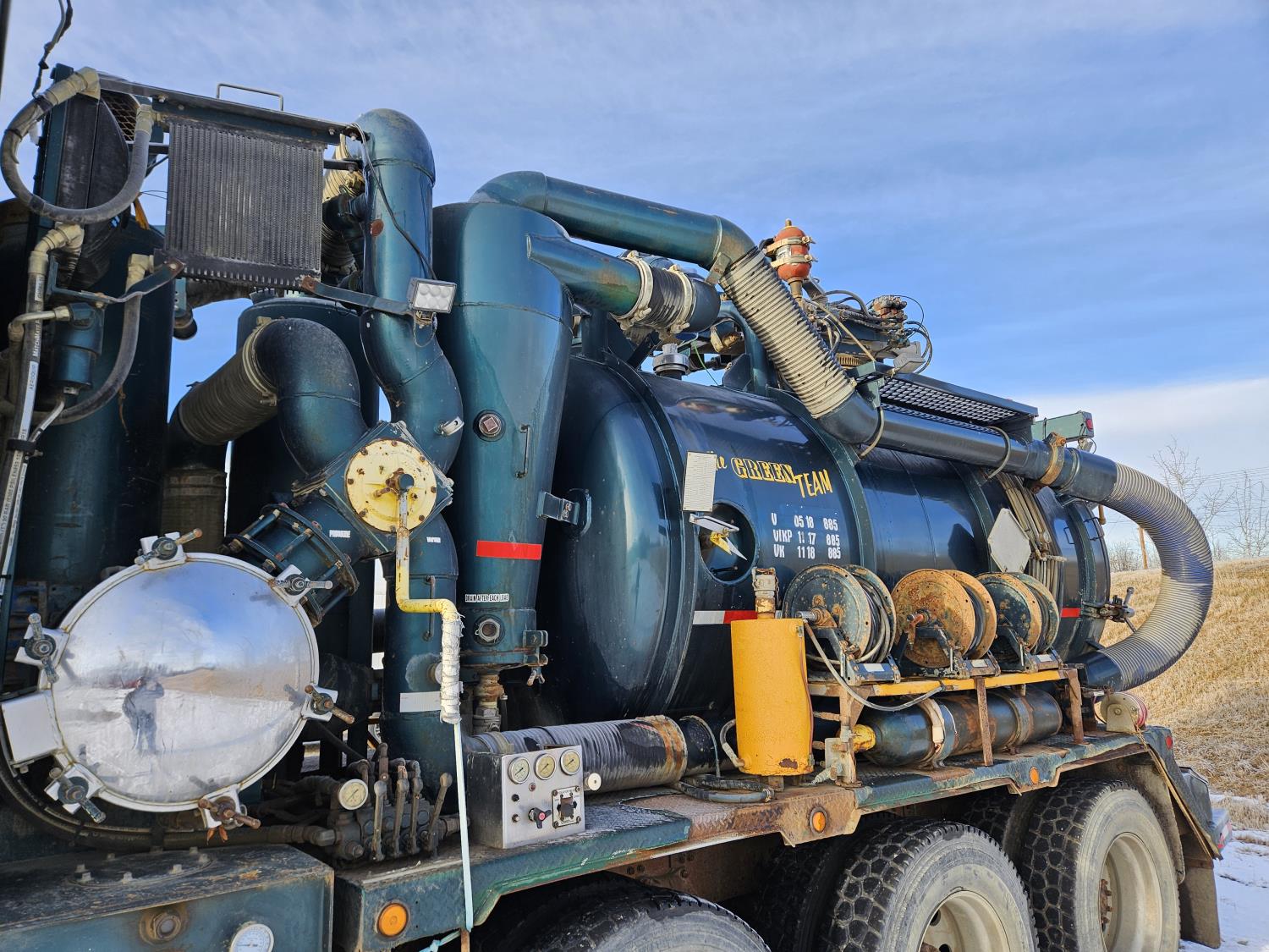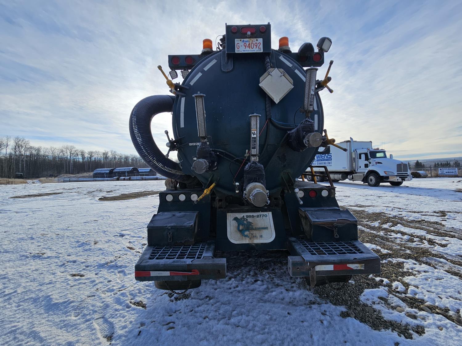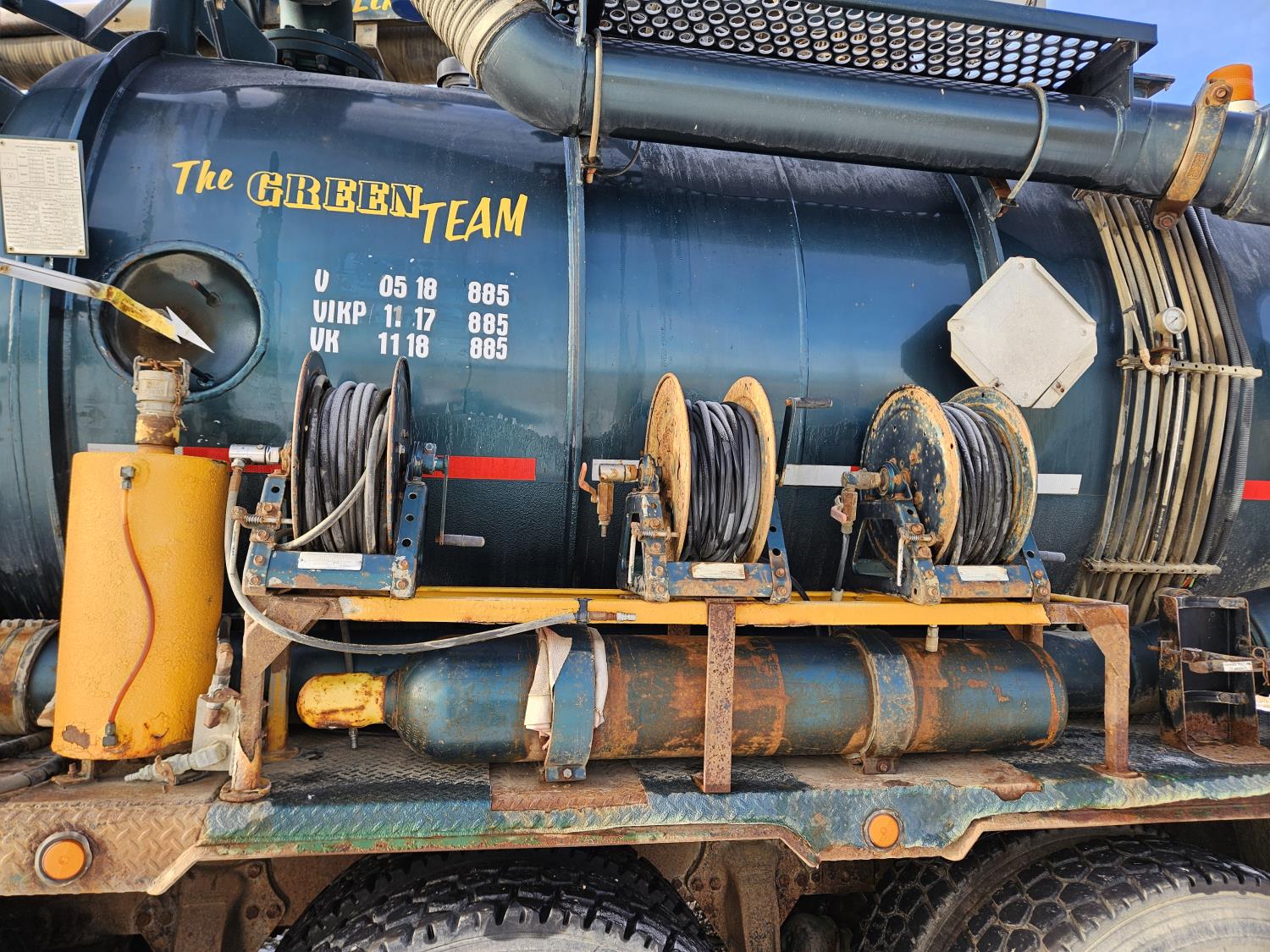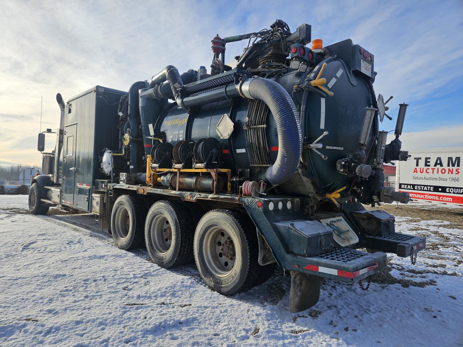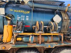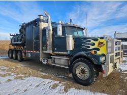 Mercedes Benz MBE 4000 12.8 L 6 cylinder 450 HP diesel engine, engine brake, engine block heater, positive air shutoff, Eaton Fuller 18 speed manual transmission, 32 inch sleeper, A/C, cruise control, air ride seats, radio, hydraulic wet kit, aluminum moose bumper, tool boxes, beacons, Vacuum Industrial Products 10000 liter tank, Hotsy, Hose/Reels, poly tank, wireless remote control, , air ride suspension, 20,000 lb front axle, 52,000 lb rear axles, full lockers, all aluminum wheels, 445/65R22.5 front tires, 11R24.5 rear tires