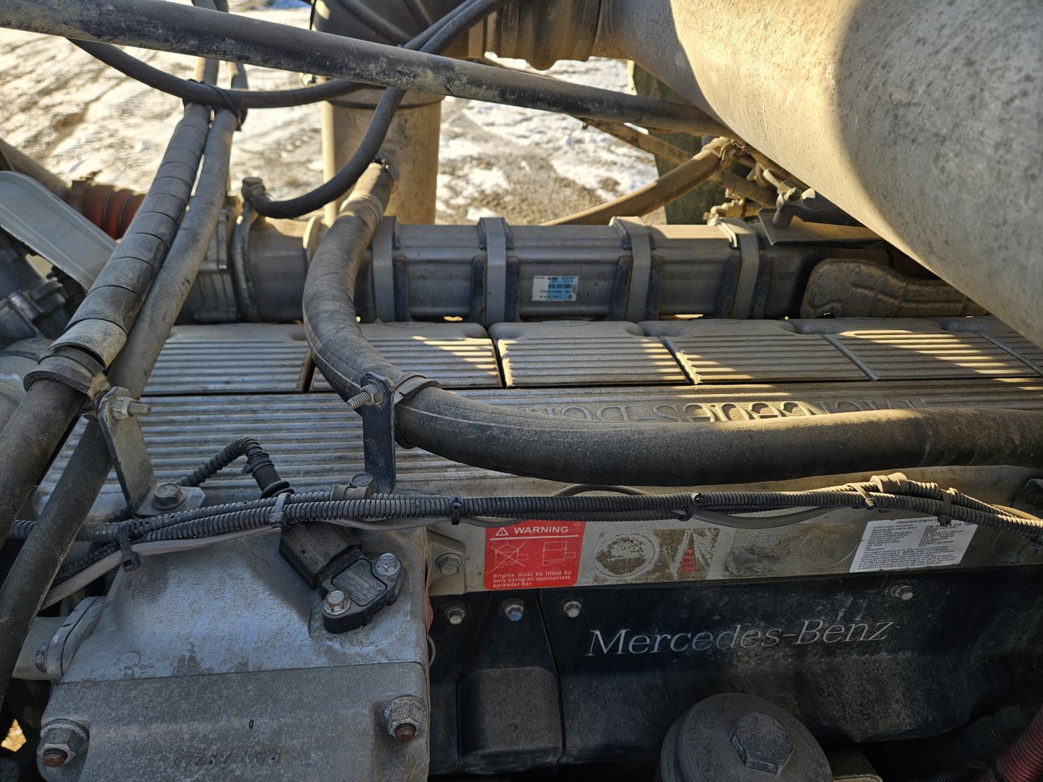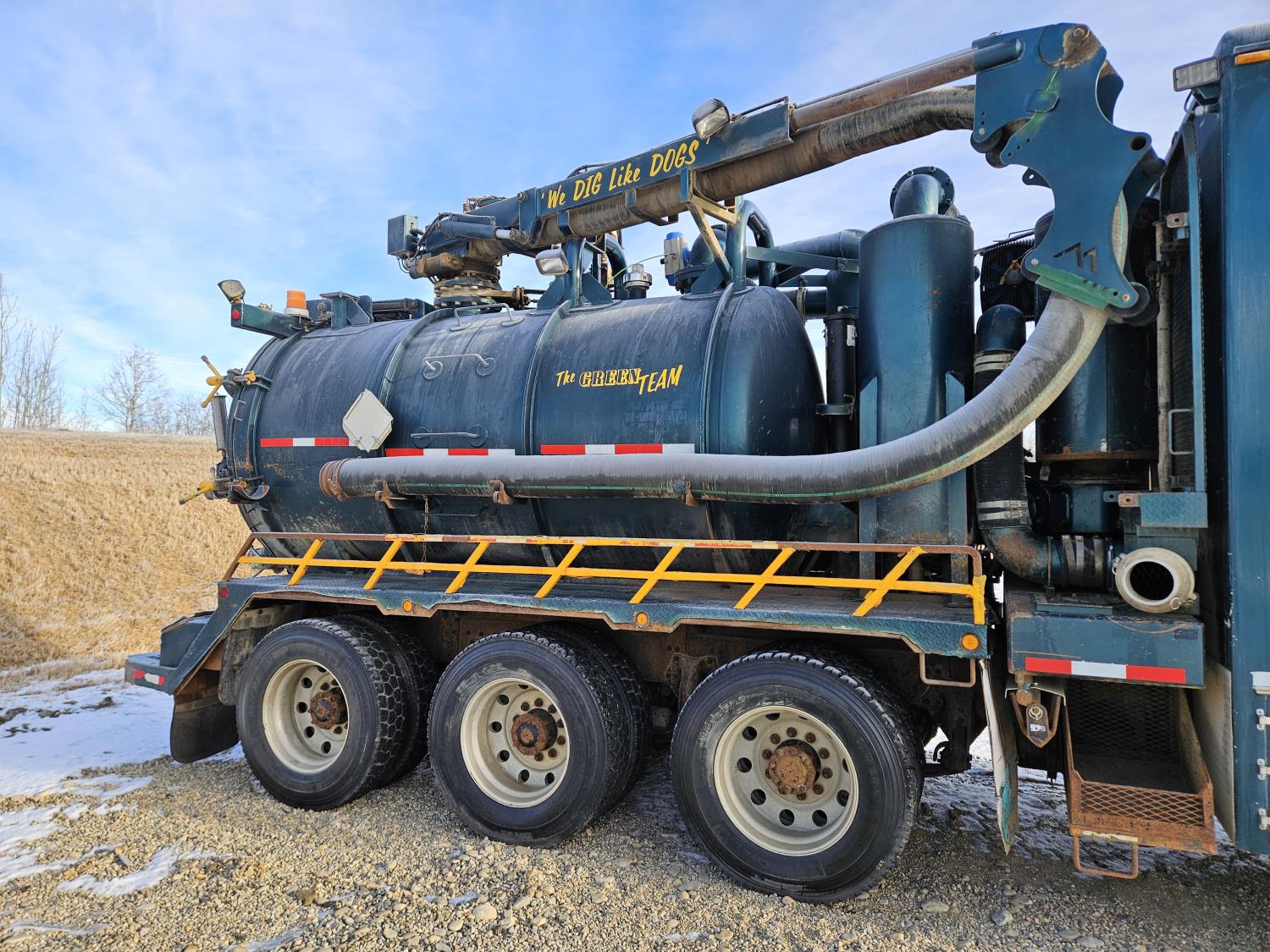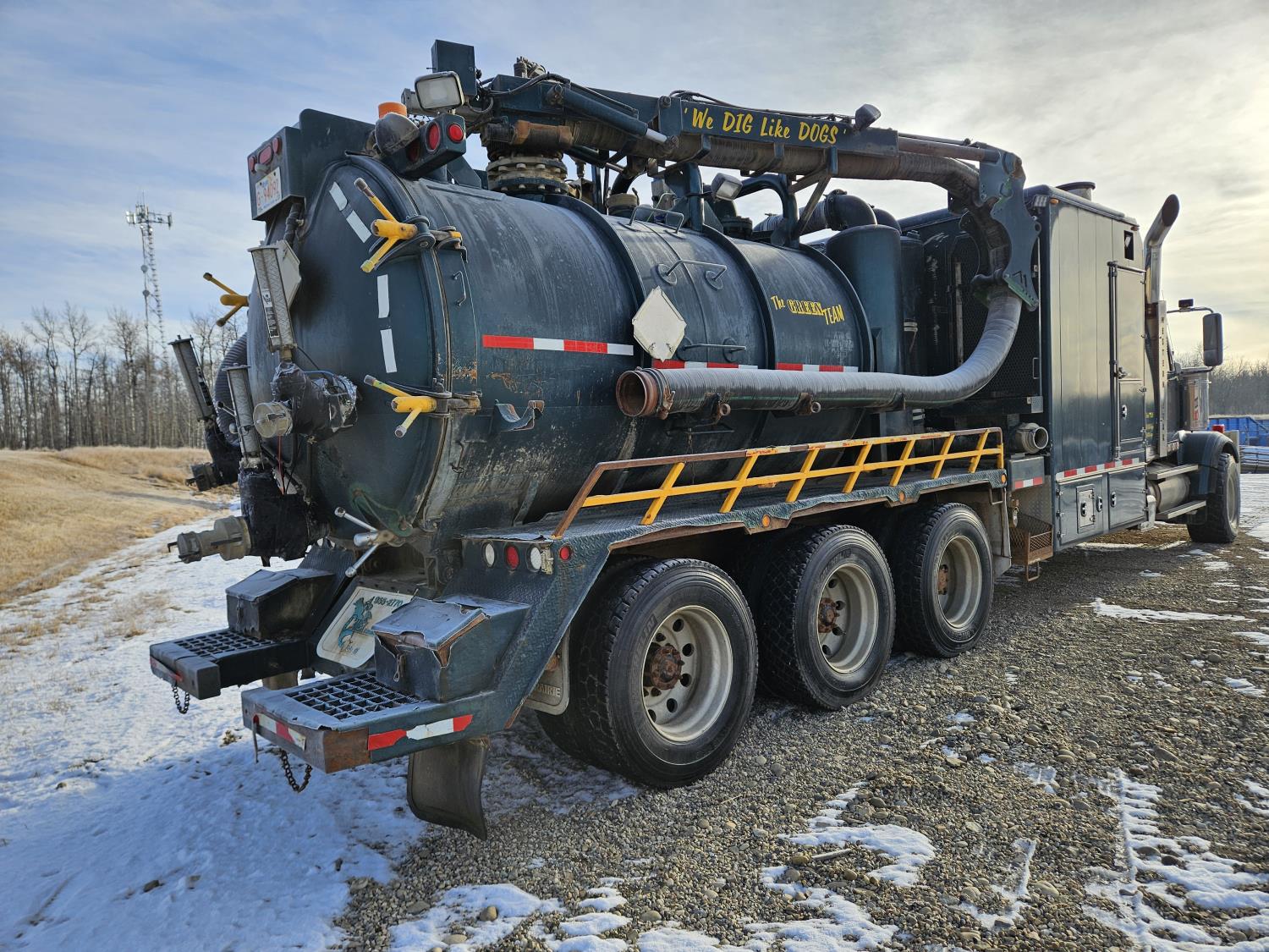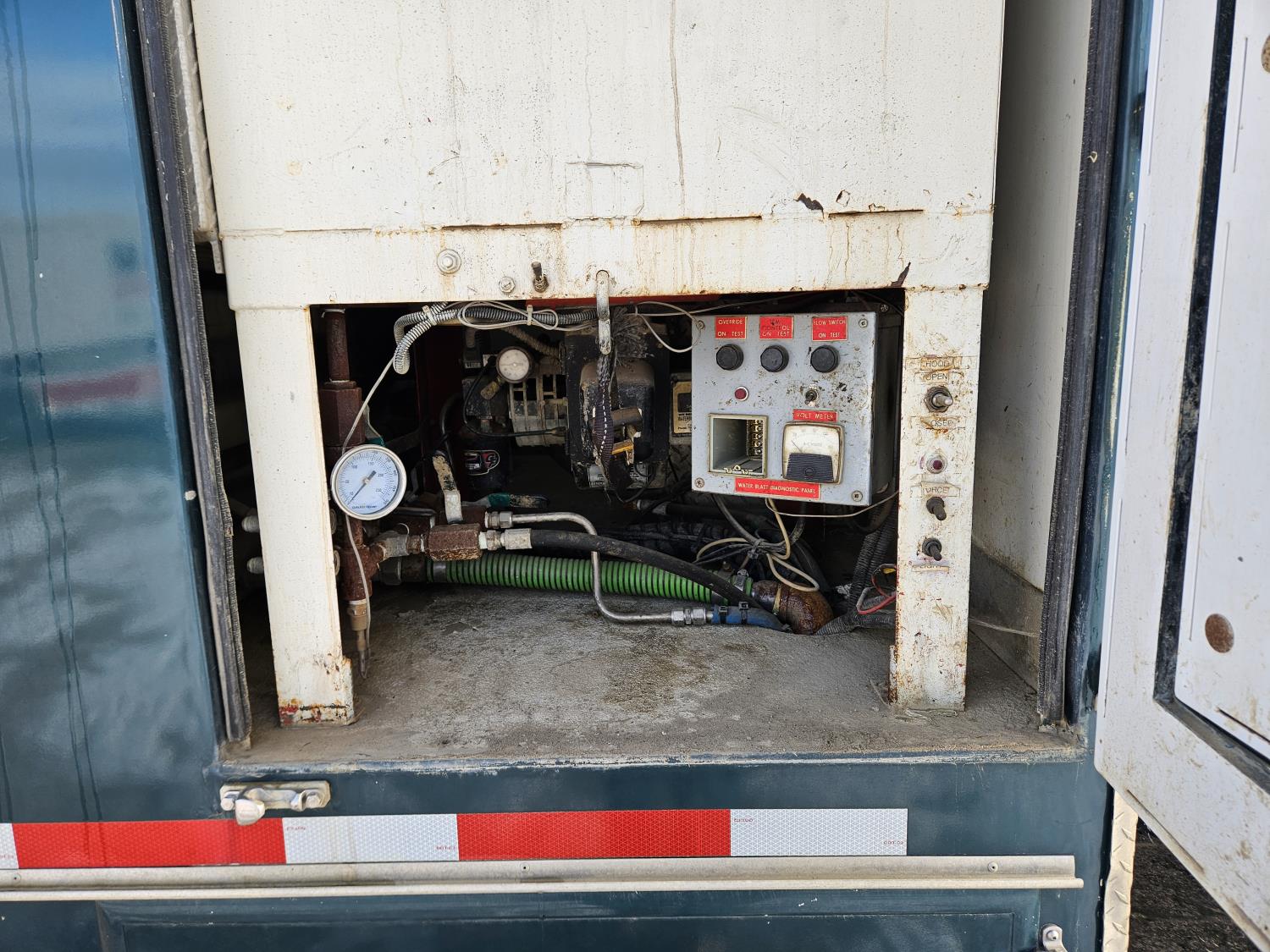 Mercedes Benz MBE 4000 12.8 L 6 cylinder 450 HP diesel engine, engine brake, engine block heater, positive air shutoff, Eaton Fuller 18 speed manual transmission, 32 inch sleeper, A/C, cruise control, air ride seats, radio, hydraulic wet kit, aluminum moose bumper, tool boxes, beacons, Vacuum Industrial Products 10000 liter tank, Hotsy, Hose/Reels, poly tank, wireless remote control, , air ride suspension, 20,000 lb front axle, 52,000 lb rear axles, full lockers, all aluminum wheels, 445/65R22.5 front tires, 11R24.5 rear tires