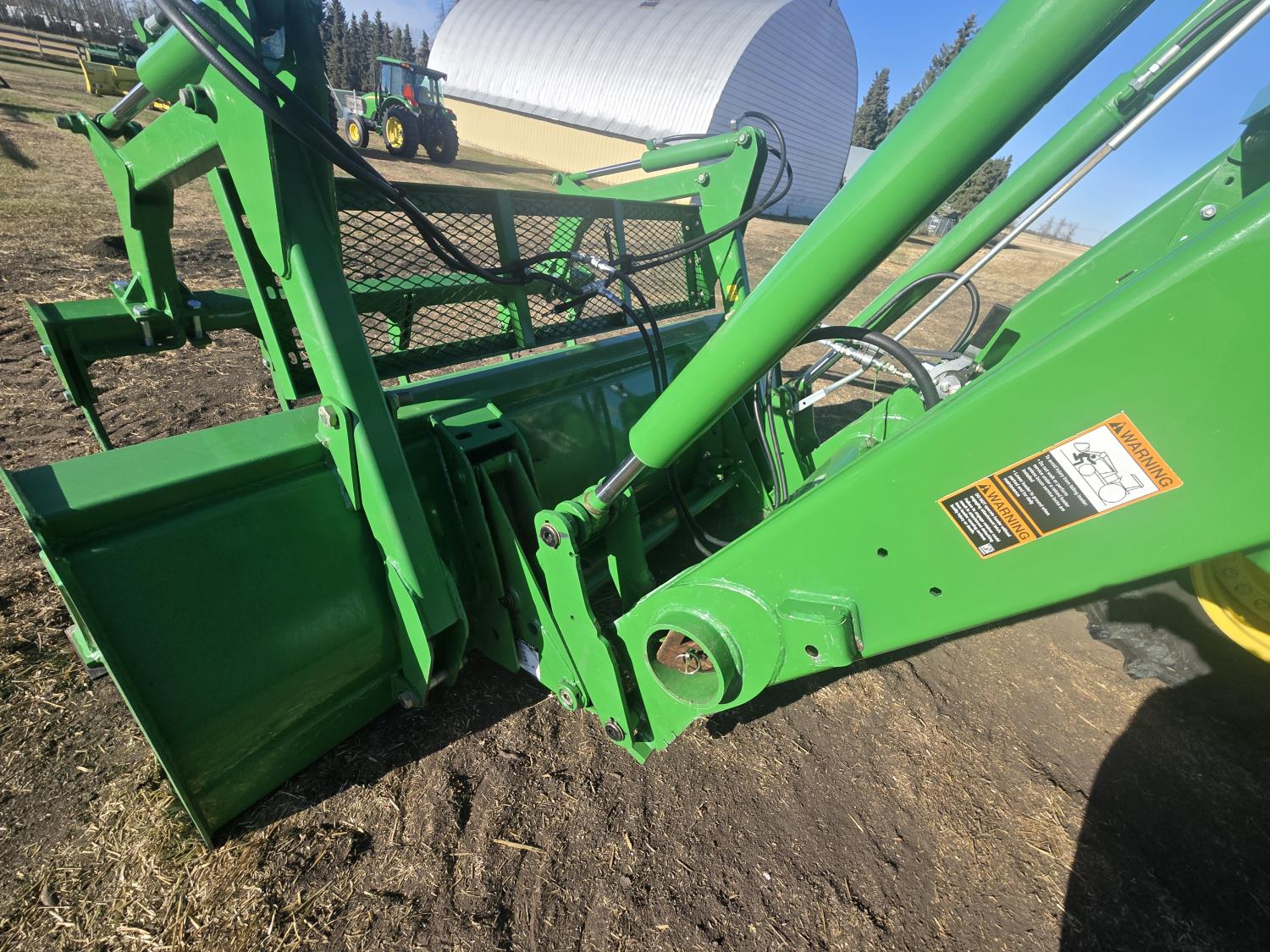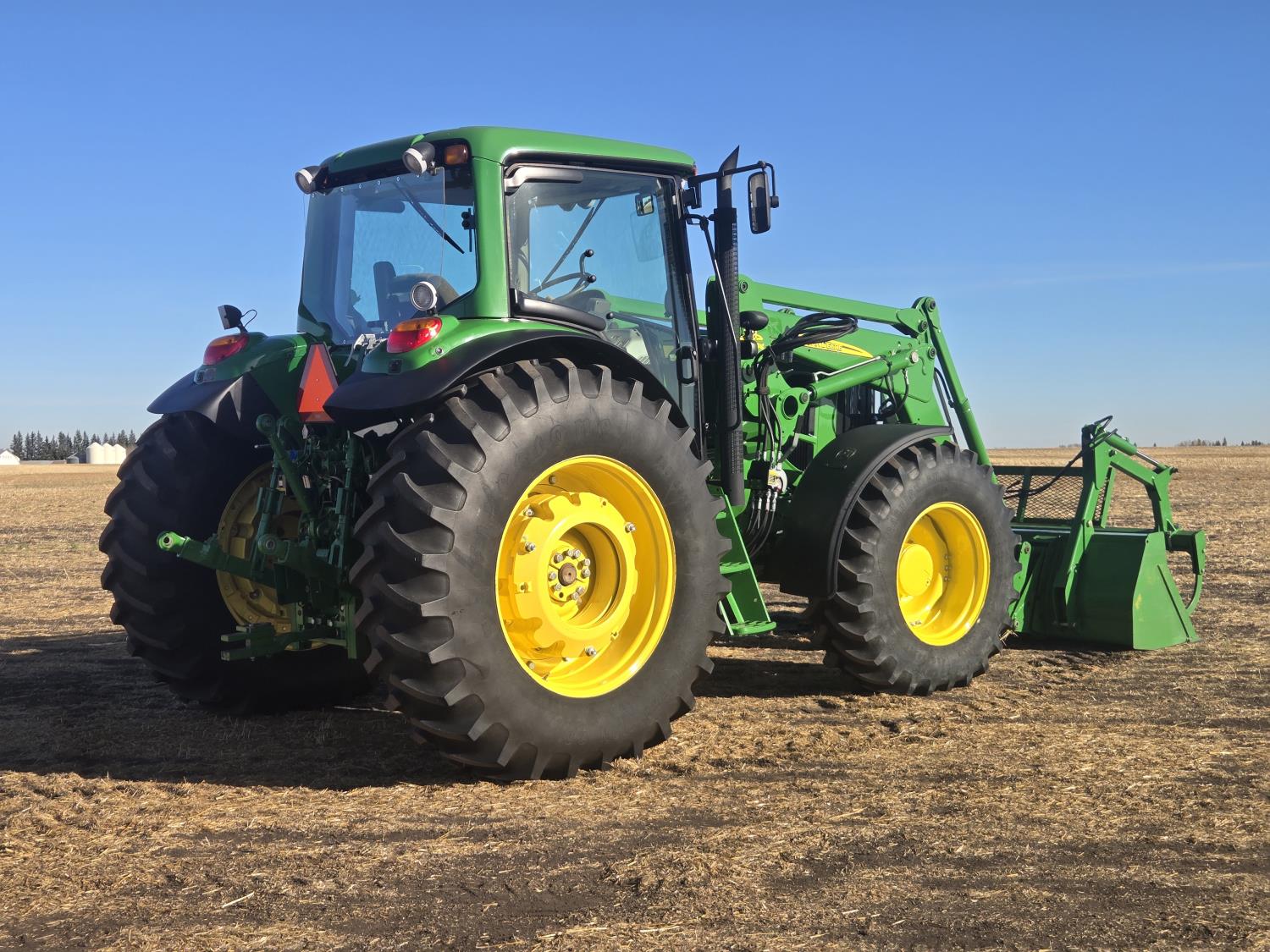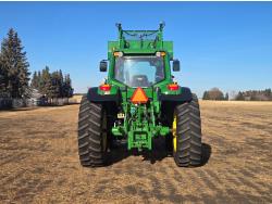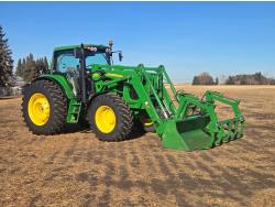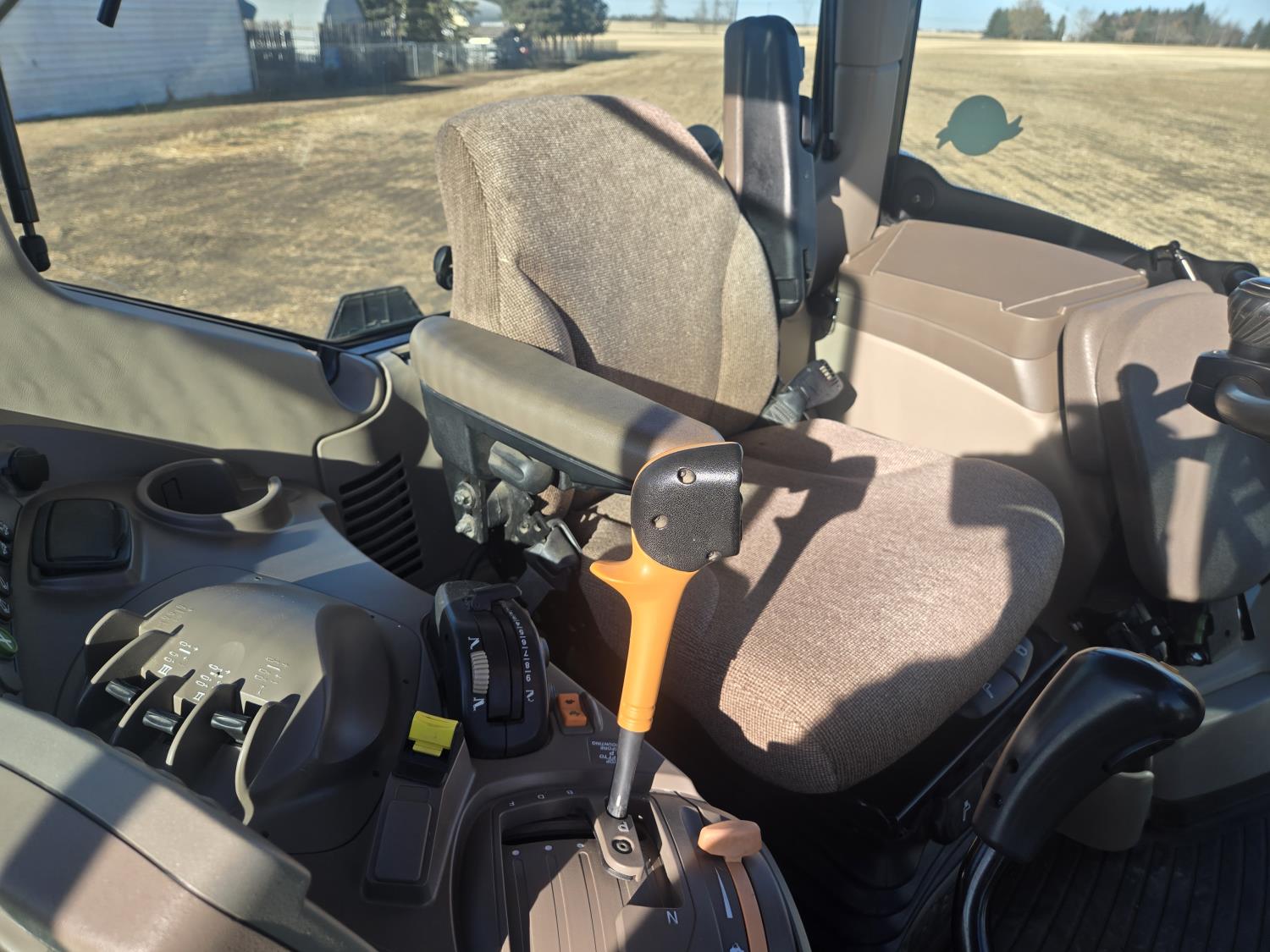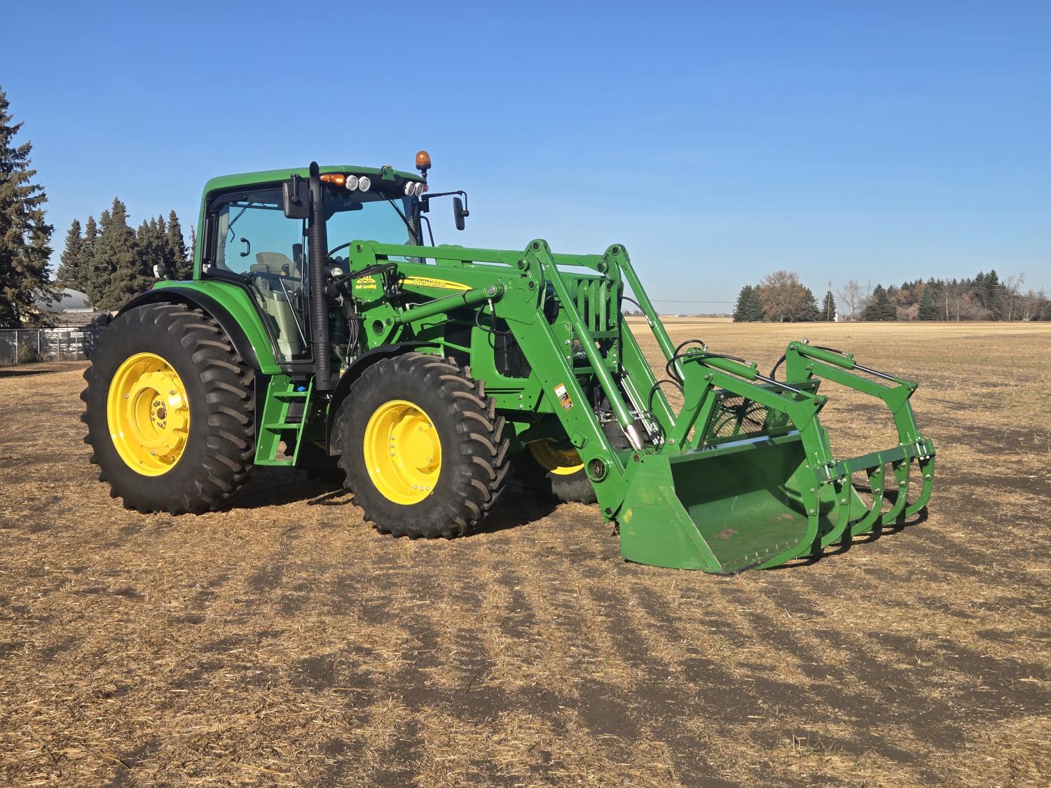 John Deere 741 loader, Q/A, 96 inch bucket, grapple, grill guard, mid mount hydraulic connection, loader mounts, John Deere 6.8 6 cylinder 121 HP, engine, 100 PTO HP, 24 speed partial power shift transmission, open station platform, left hand reverser, rear differential lock, joystick, A/C, radio, buddy seat, 540/1000 PTO, 3 point hitch, 3 point hitch exterior control, 2 rear hydraulic outlets, rear wheel weights, 420/85R28 front tires, 20.8R38 rear tires