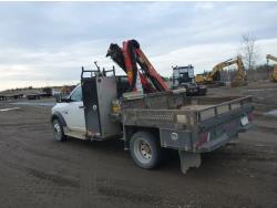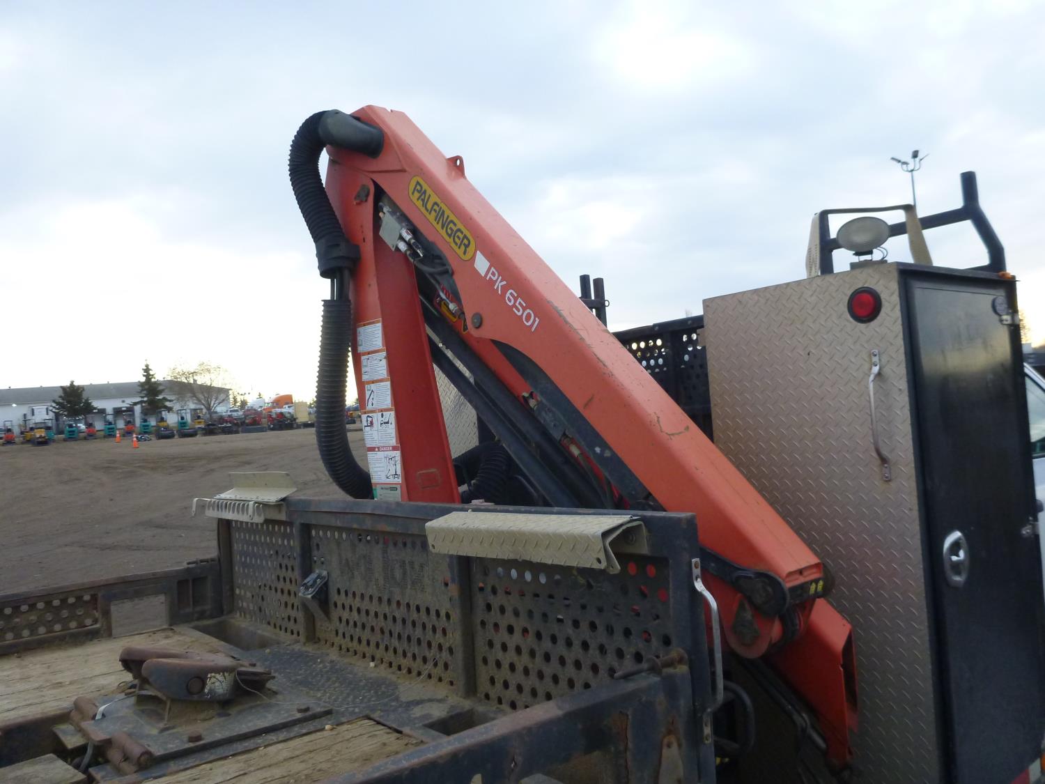 Cummins 6.7 L diesel engine, DEF deleted, engine brake, electric engine block heater, positive air shutoff, emissions deleted, automatic transmission, A/C, P/W, P/L, cruise control, radio, stereo, running boards, 5th wheel pin hitch, aluminum tool boxes, 6 ft deck, beacons, saddle boxes, Palfinger PK6501 3 section knuckle front mount crane, outriggers, 225/70R19.5 tires