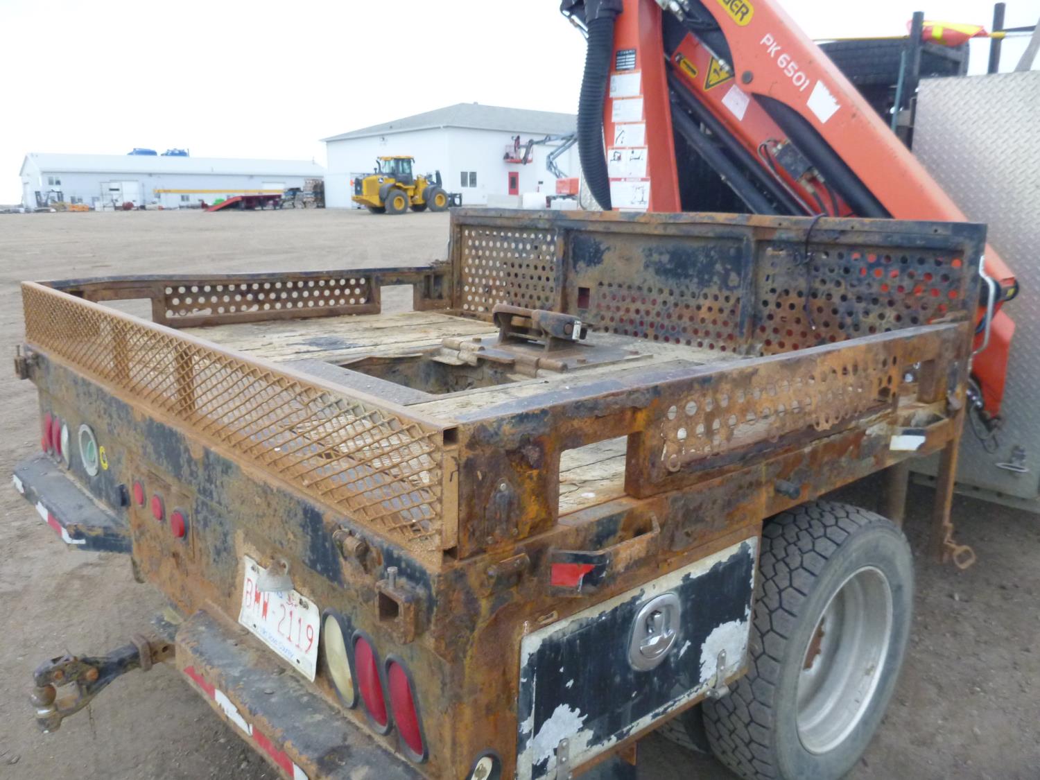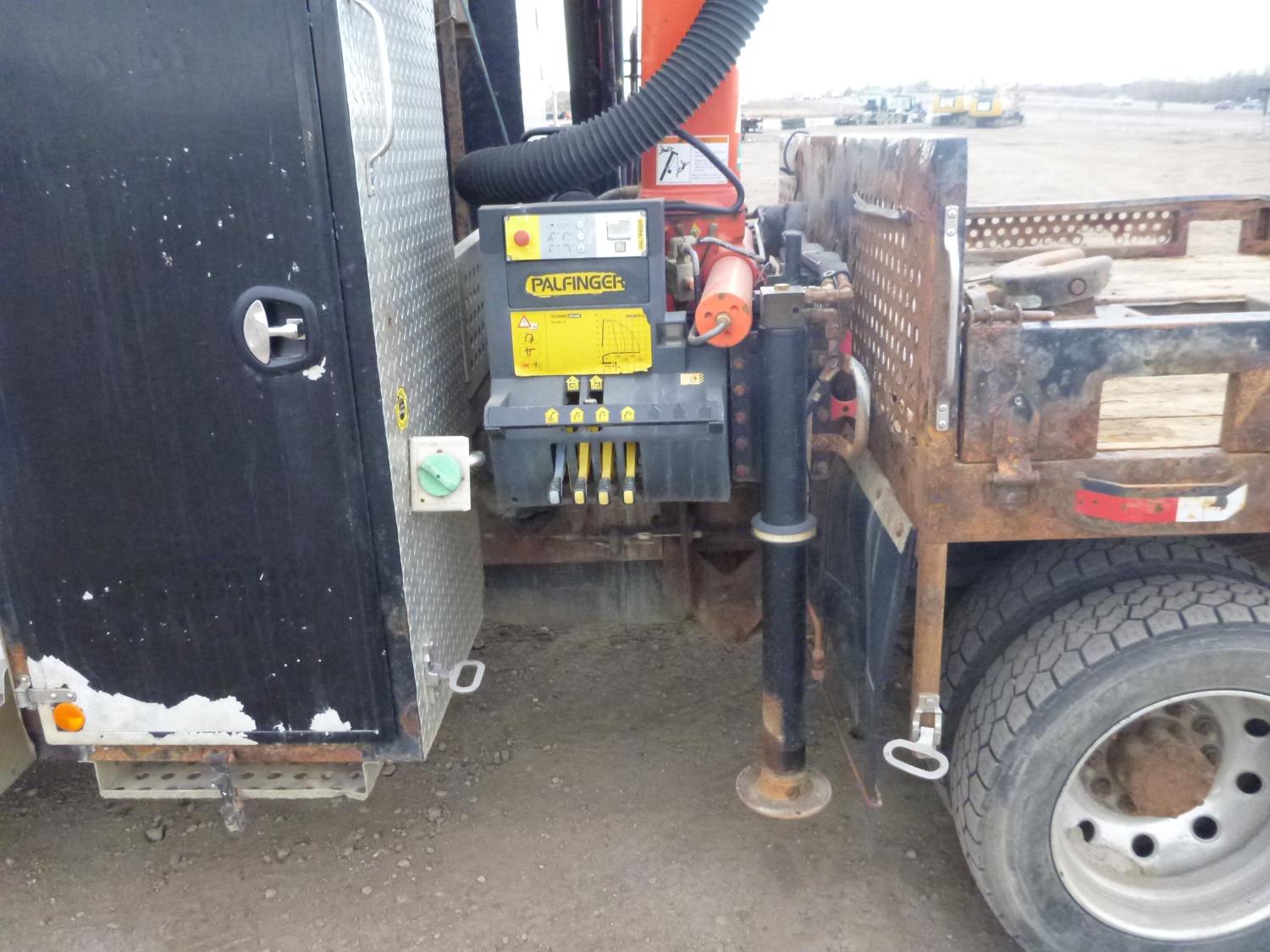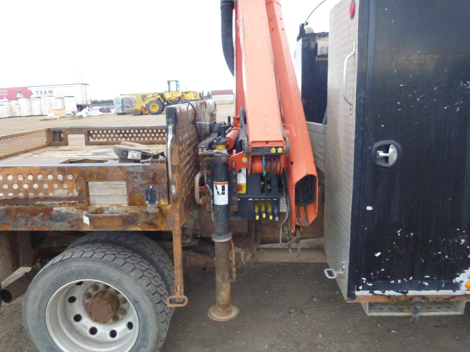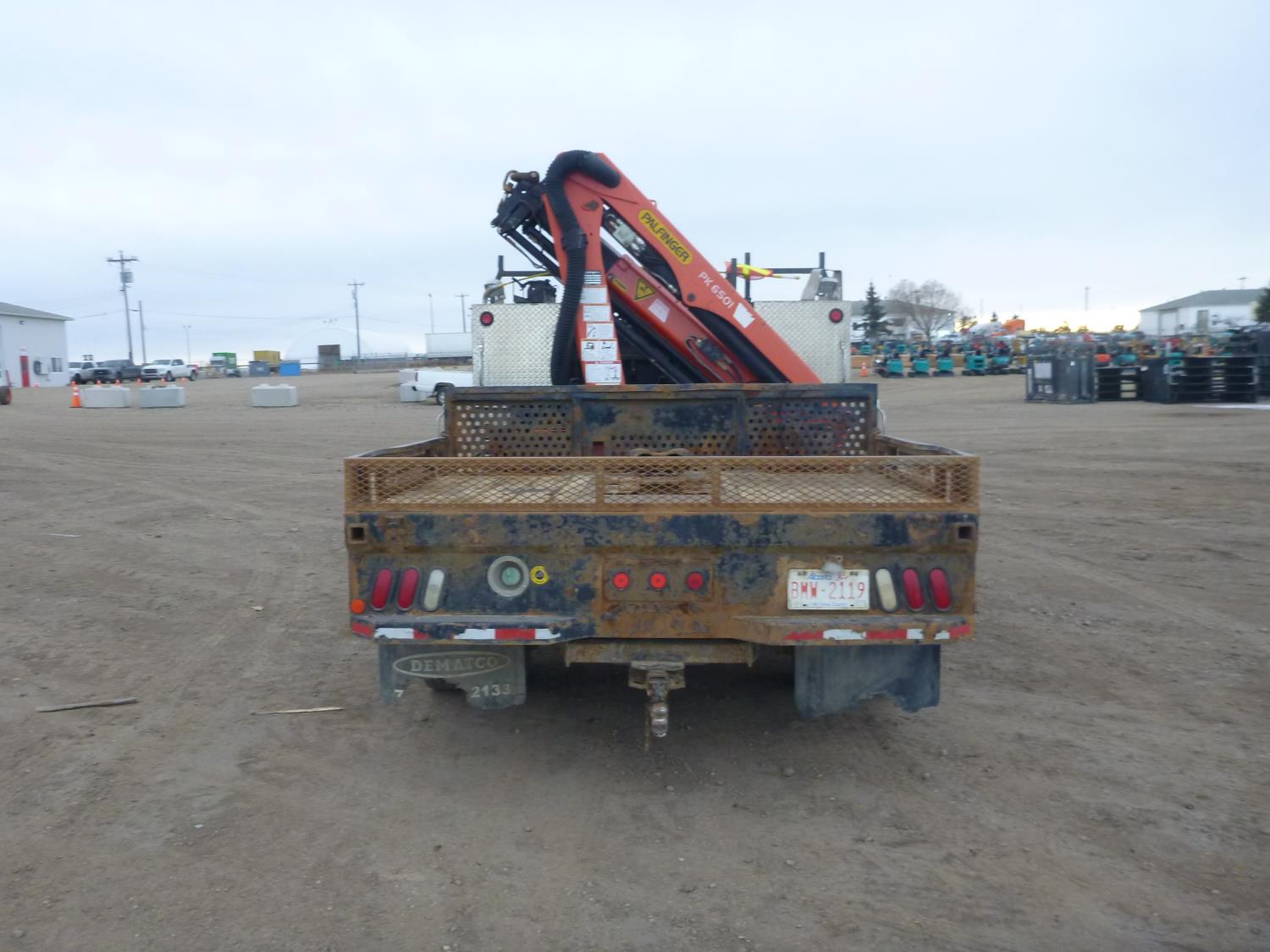 Cummins 6.7 L diesel engine, automatic transmission, A/C, P/W, P/L, cruise control, radio, stereo, running boards, 5th wheel pin hitch, aluminum tool boxes, 6 ft deck, beacons, saddle boxes, Palfinger PK6501 3 section knuckle front mount crane, outriggers, 225/70R19.5 tires