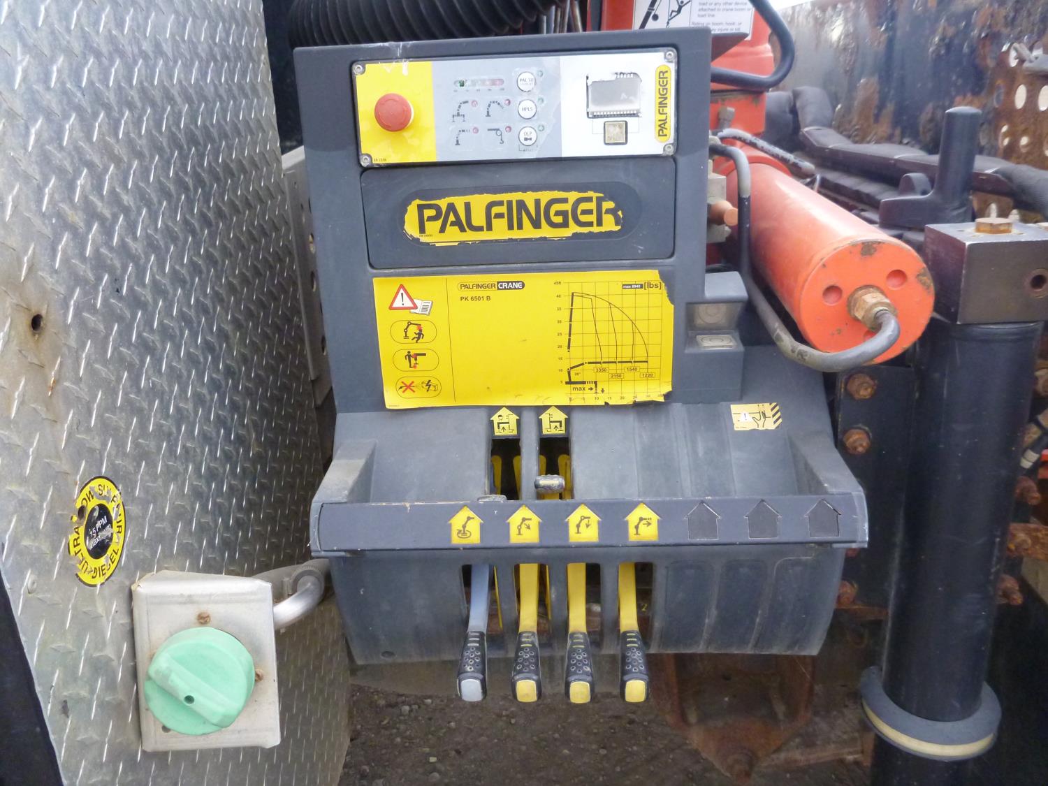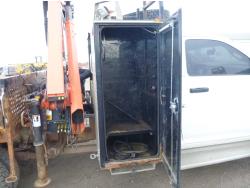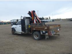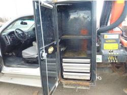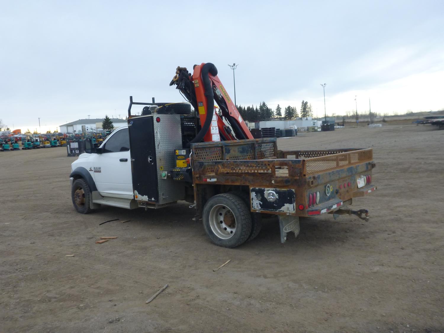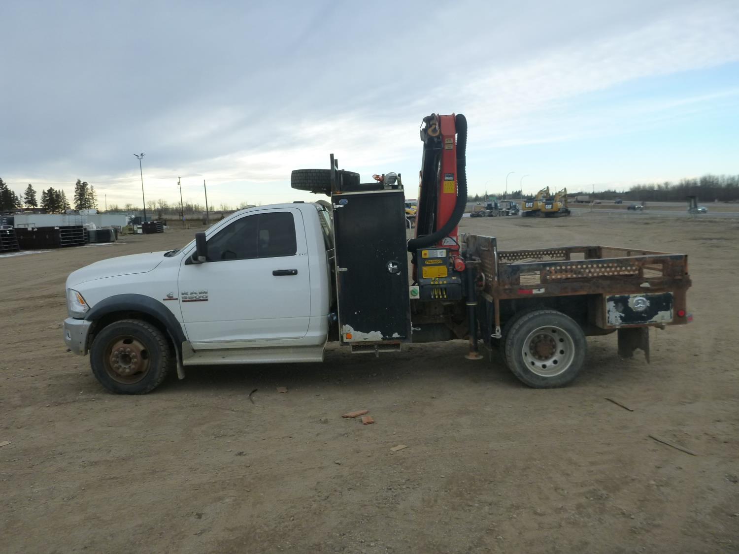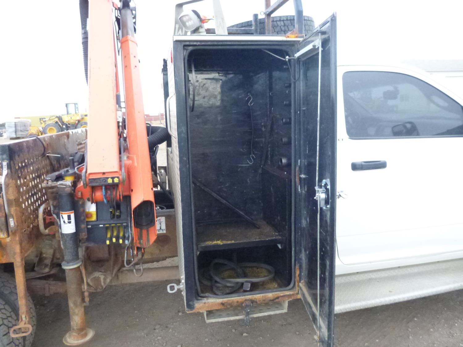 Cummins 6.7 L diesel engine, automatic transmission, A/C, P/W, P/L, cruise control, radio, stereo, running boards, 5th wheel pin hitch, aluminum tool boxes, 6 ft deck, beacons, saddle boxes, Palfinger PK6501 3 section knuckle front mount crane, outriggers, 225/70R19.5 tires