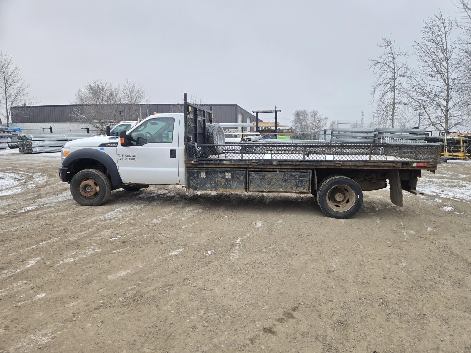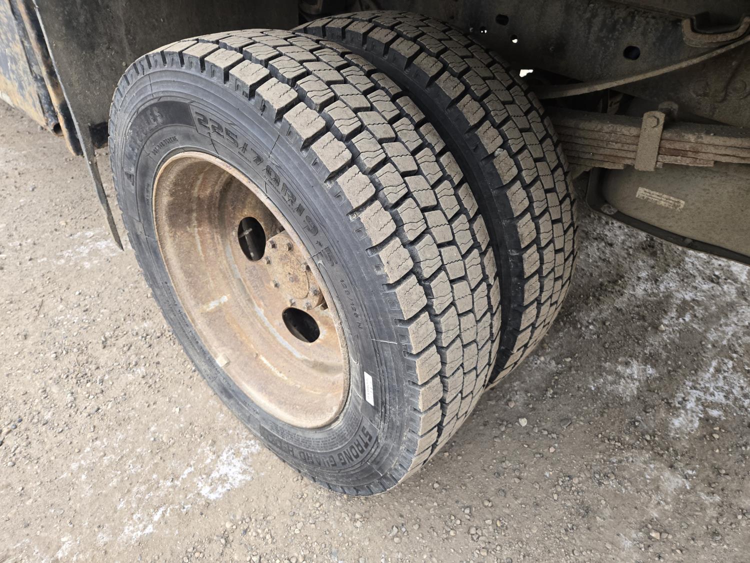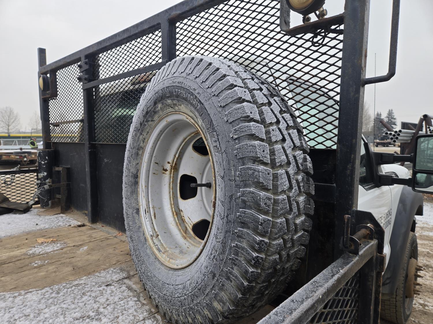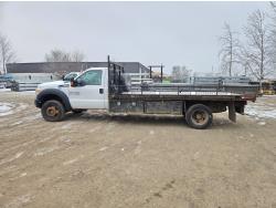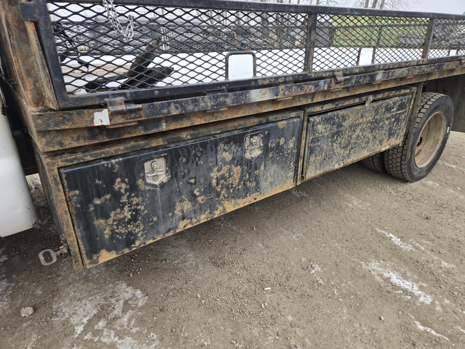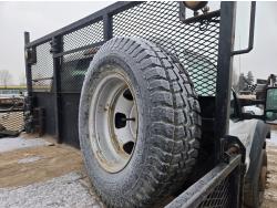 Ford 6.8 L V10 gas engine, automatic transmission, A/C, P/W, P/L, 8 ft 6 inch x 15 ft deck, 12" expanded metal fold down sides, under deck storage boxes, pintle trailer hitch, 4X4, 225/70R19.5 tires