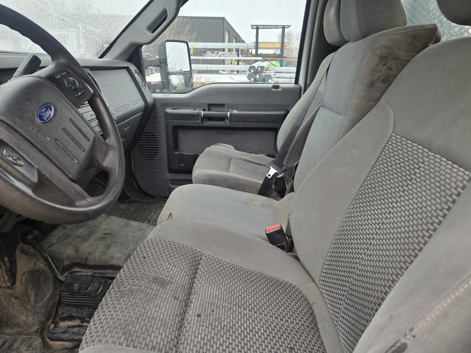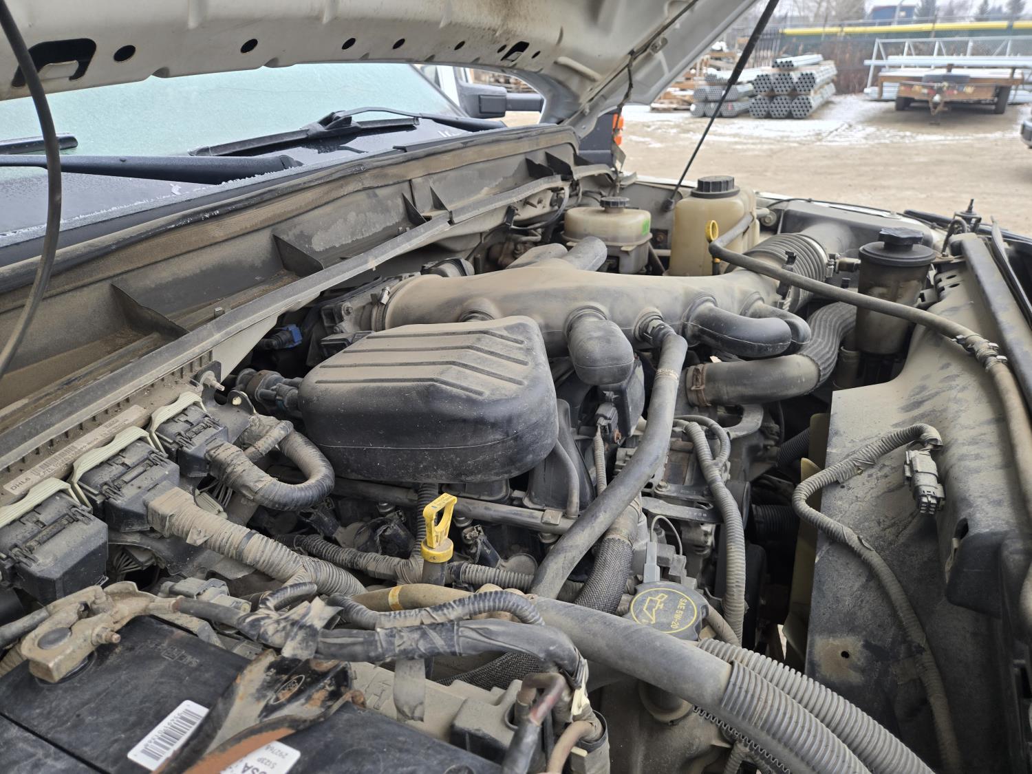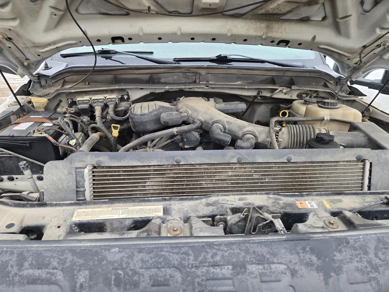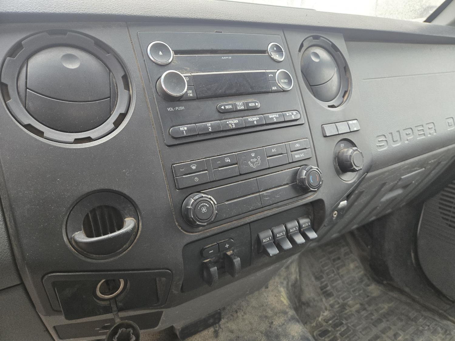 Ford 6.8 L V10 gas engine, automatic transmission, A/C, P/W, P/L, 8 ft 6 inch x 15 ft deck, 12" expanded metal fold down sides, under deck storage boxes, pintle trailer hitch, 4X4, 225/70R19.5 tires