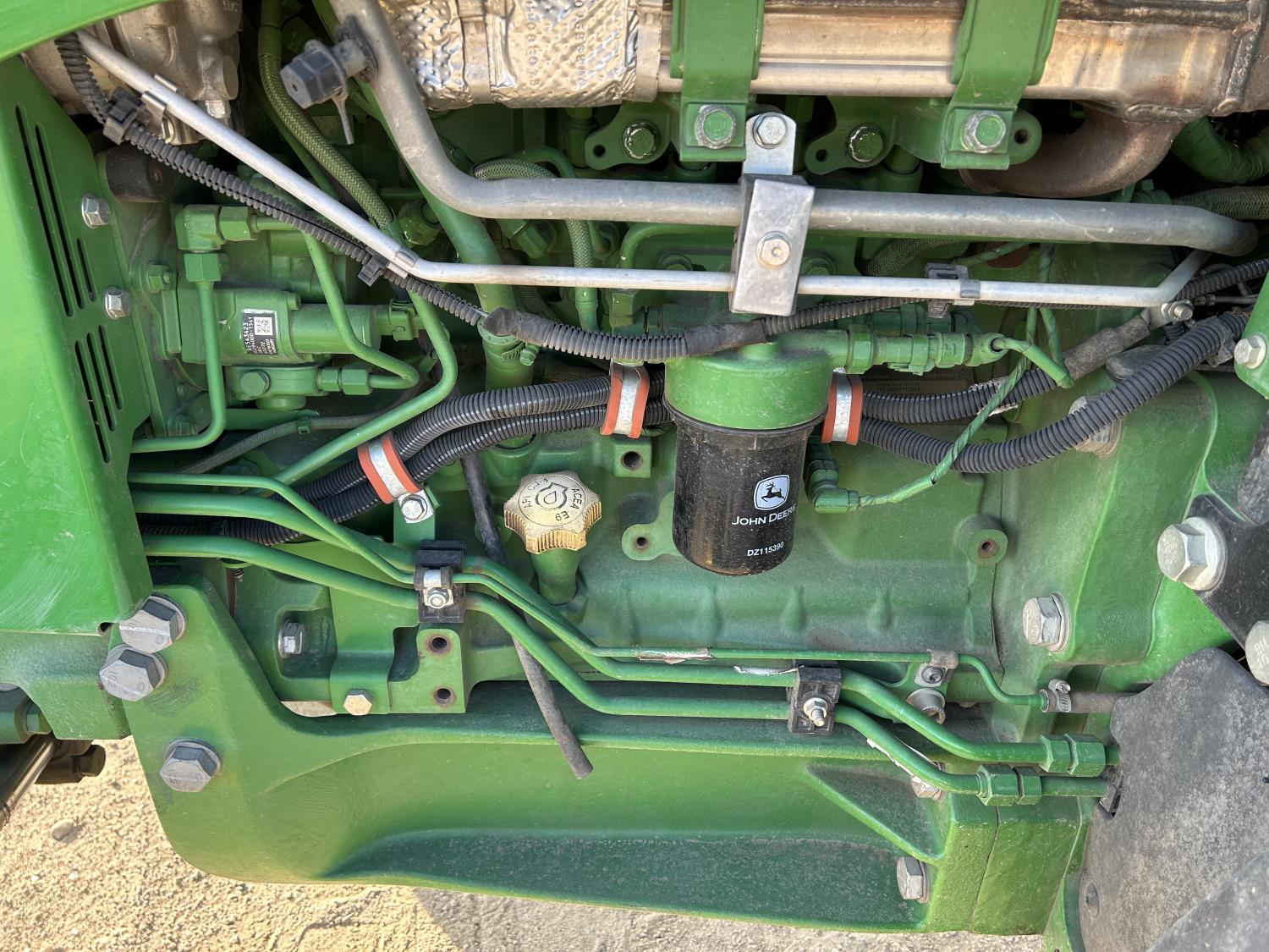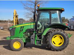 Deere 4.5 L 4 cylinder 89 HP, engine, DEF required, 75 PTO HP, 16 speed Power Shuttle partial synchro transmission, cab, left hand reverser, A/C, radio, 540 / 540E PTO, 3 point hitch, 3 point hitch exterior control, 3 rear hydraulic outlets, 3 function mid mount valve with joystick, 19.5L24 rear tires