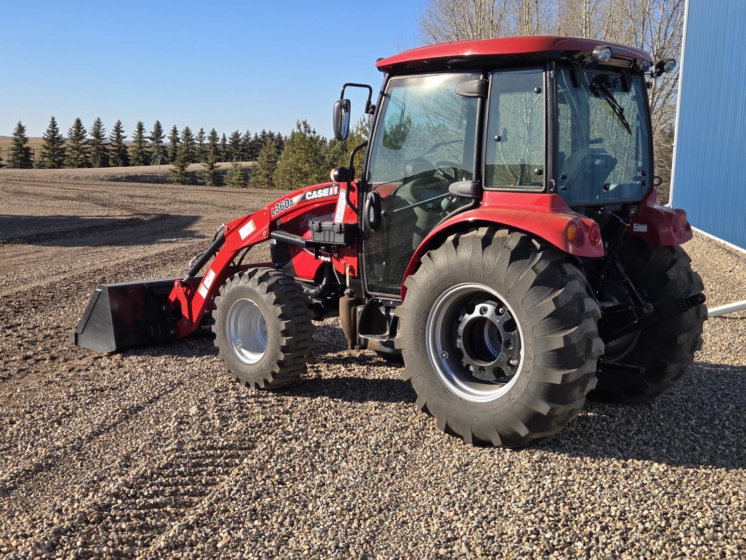 Case IH 360A loader, Q/A, 72 inch bucket, mid mount hydraulic connection, FPT 3 cylinder 54 HP, diesel engine, 43 PTO HP, hydro 3 range transmission, cab, rear differential lock, joystick, A/C, heat, 540 PTO, 3 point hitch, 2 rear hydraulic outlets, rear wheel weights, 12-16.5 front tires, 17.5L-24 rear tires