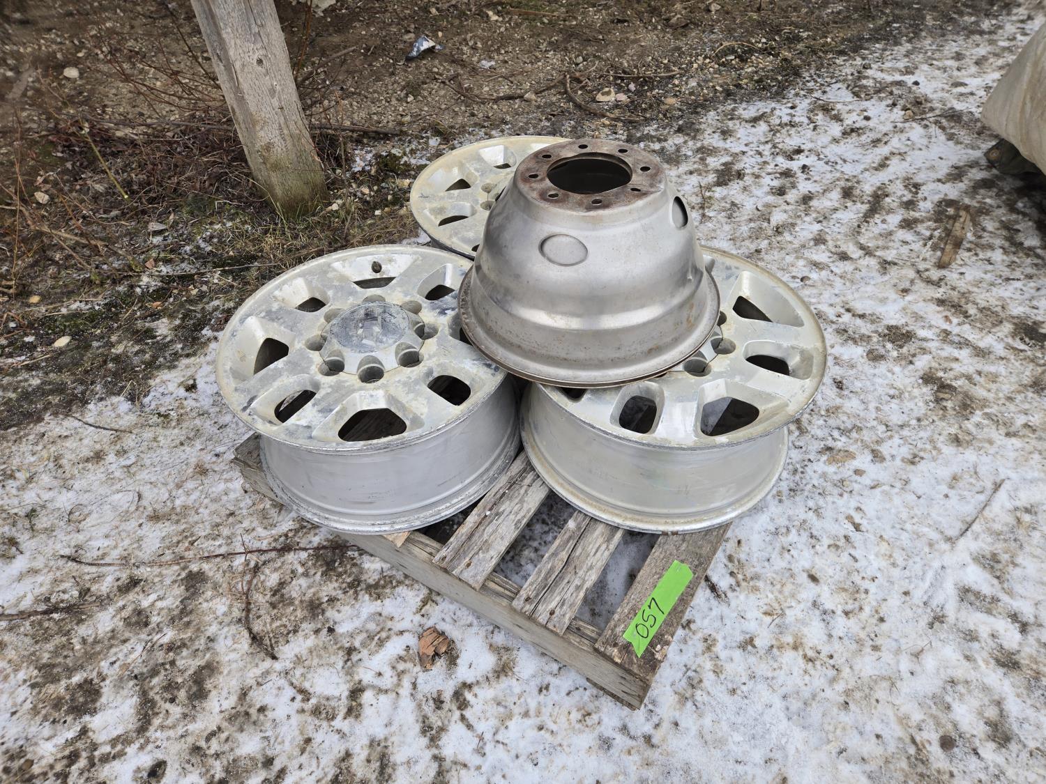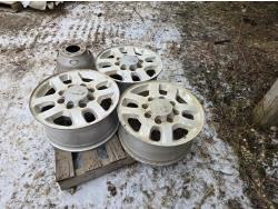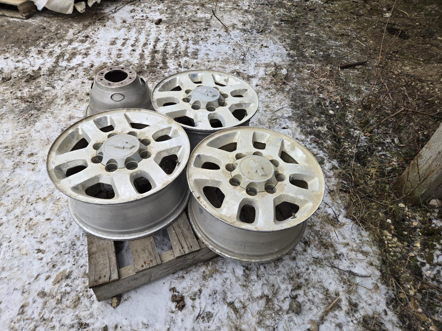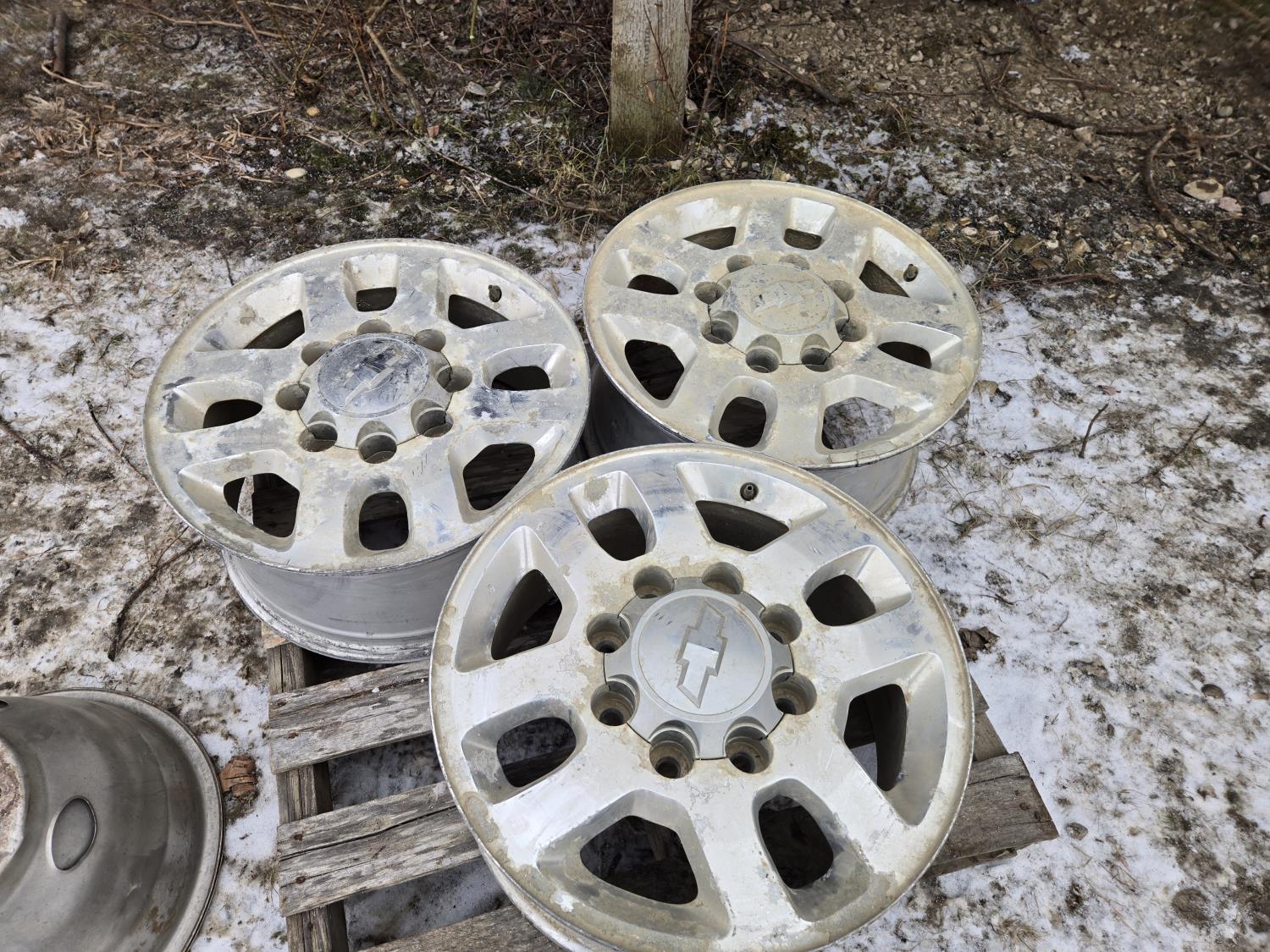 2071 (3) 17 Inch Chev Aluminum Wheels, (2) 8 Stud Hub Caps